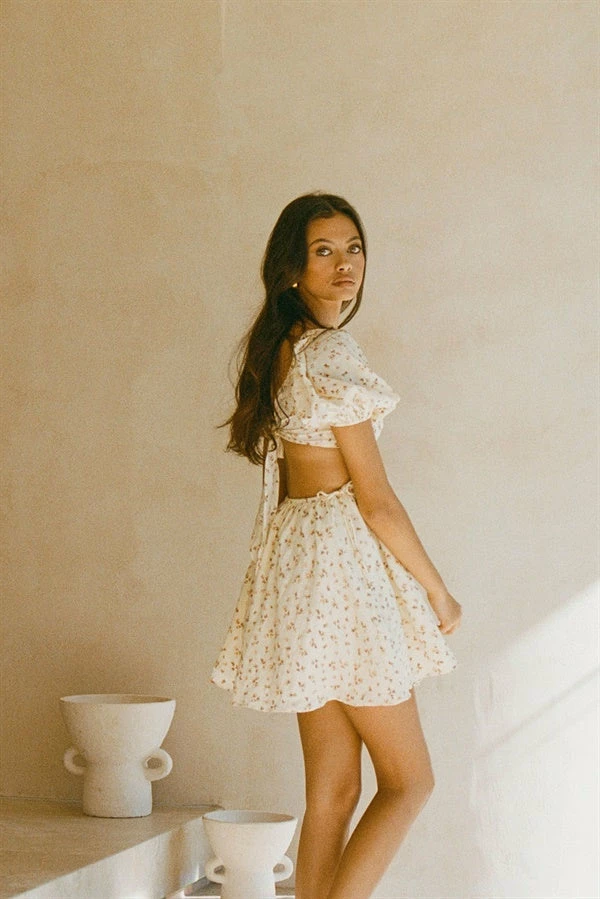A vacation essential! The super cute Ales Dress is made from a lightweight raw cotton blend fabric in a yellow hue. It features a floral print throughout, short puff sleeves, cutout at waist, flouncy skirt and ring detail at centre bust. Pair with the Glow Necklace and Link Earrings! Designed exclusively by Sabo.