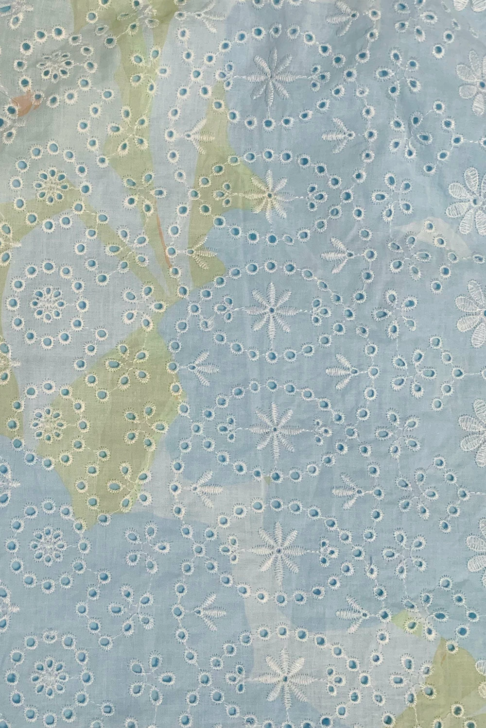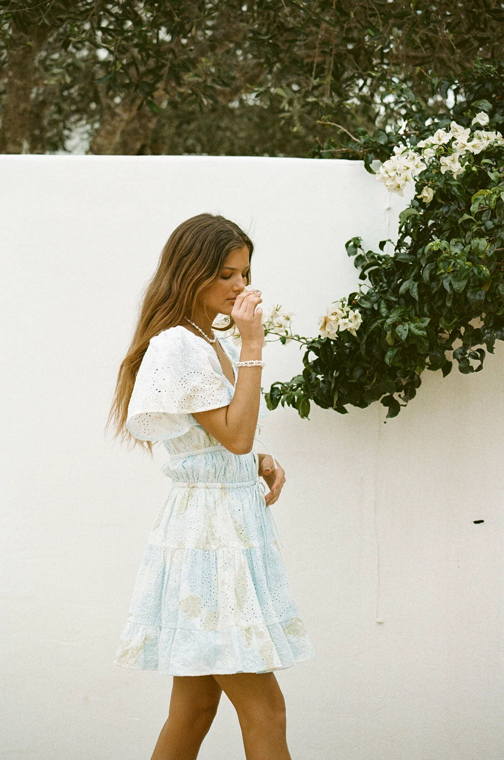Introducing our brand new printed broiderie fabric featuring our exclusive dusty blue lilly print. The Alessanda Cutout Dress has short flirty sleeves, cutout at centre front with draw tie details and a flouncy triple tiered skirt. Style your look with the Petal Necklace and Strappy Zita Sandals! Designed exclusively by Sabo.