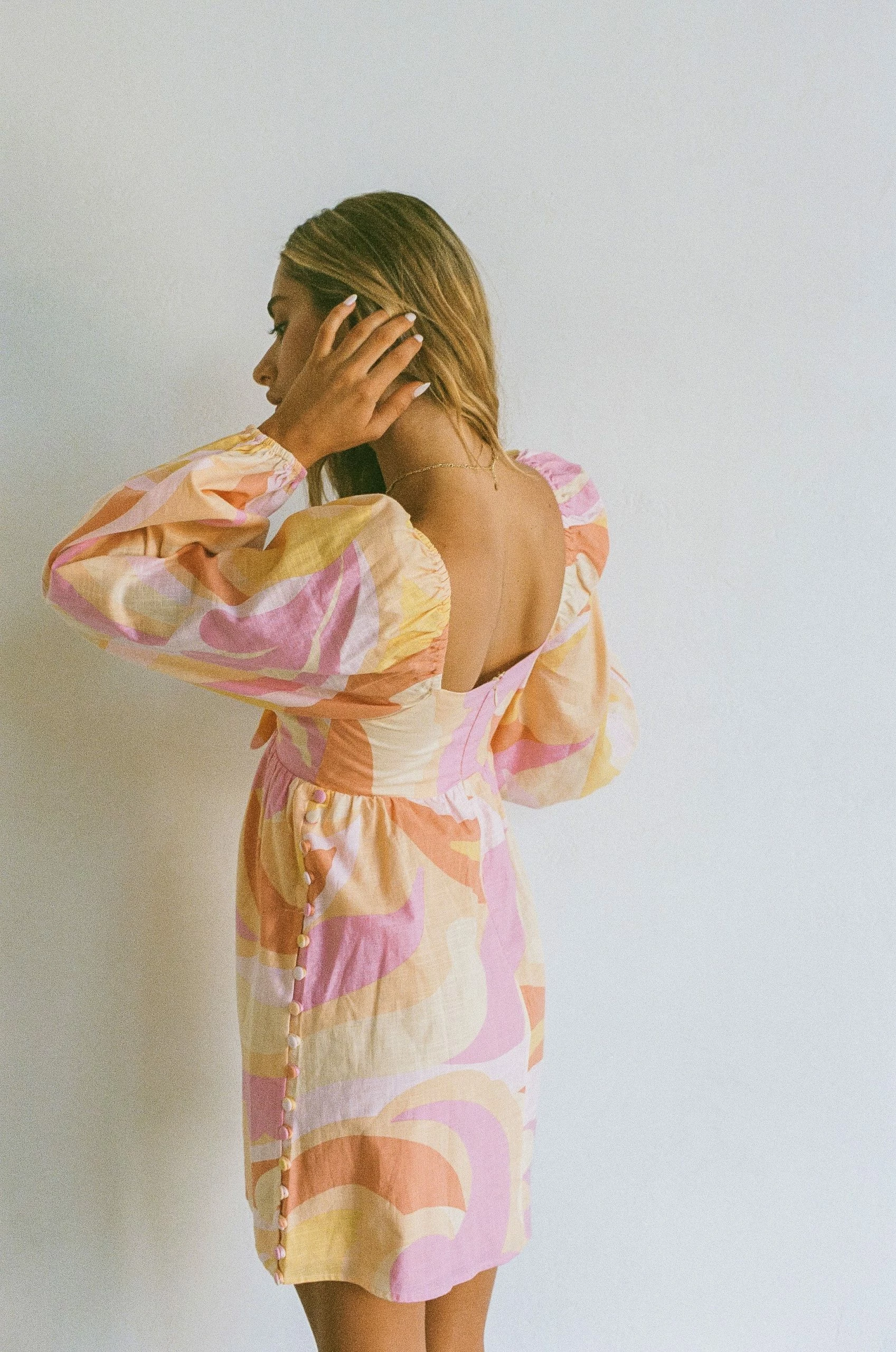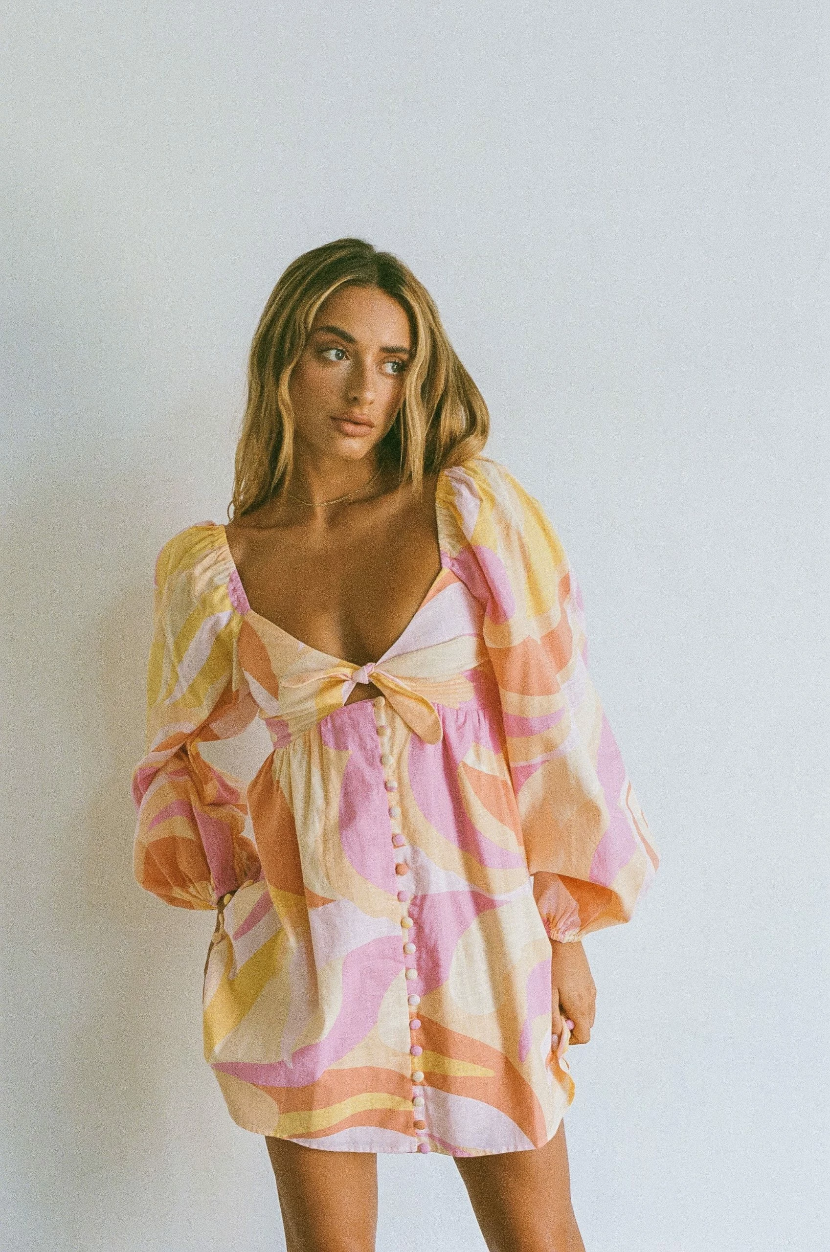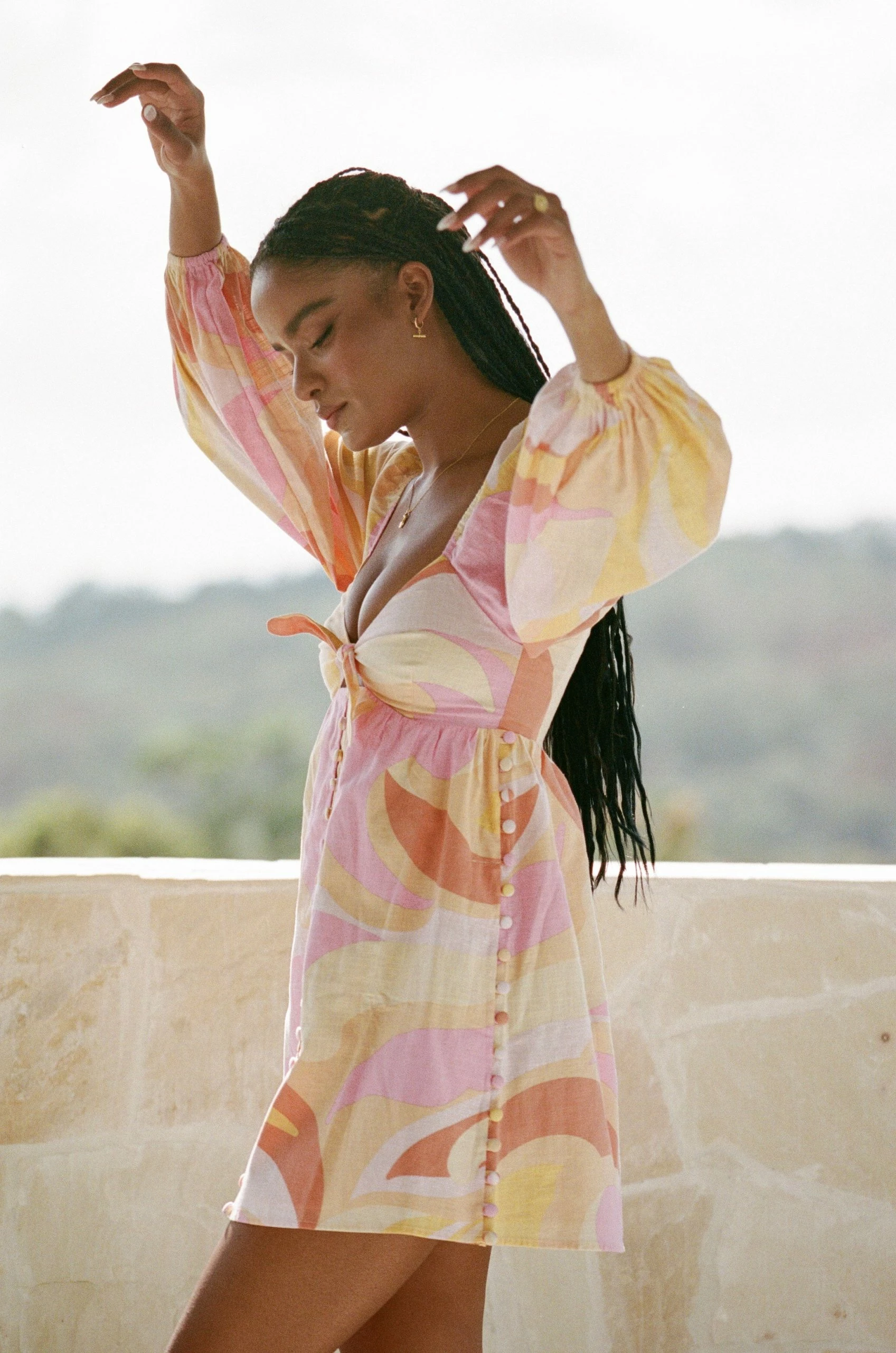 We’ve got your party season sorted! The Alya Babydoll Dress is made from a high quality natural cotton fabric with our exclusive Lucid Fuego print. It is a babydoll style featuring full length puff sleeves, cutout at tie at centre bust and button detailing at centre and sides of skirt. Pair with the Strappy Asteria Heels and Milli Link Earrings for your next event! Designed exclusively by Sabo.