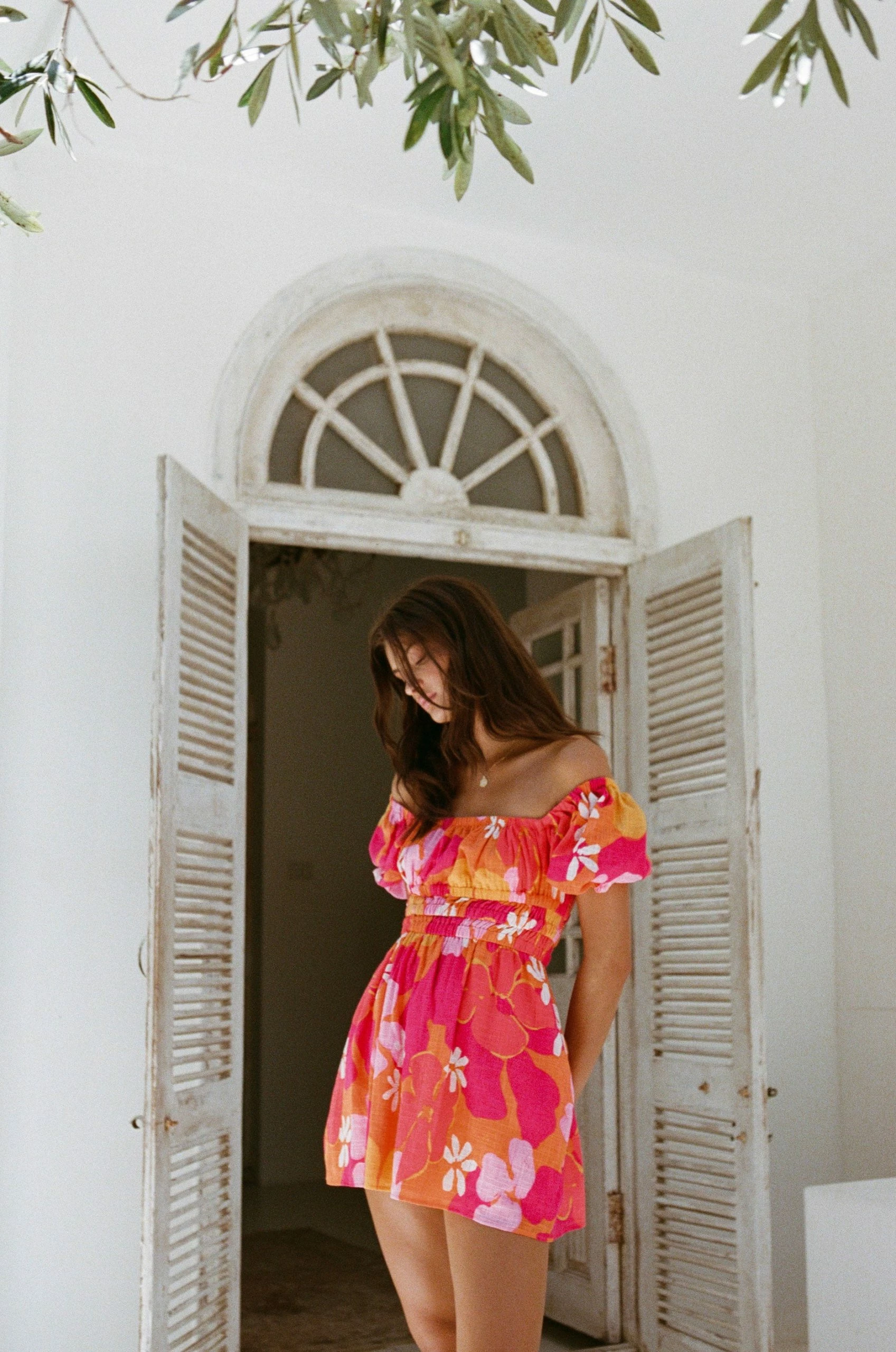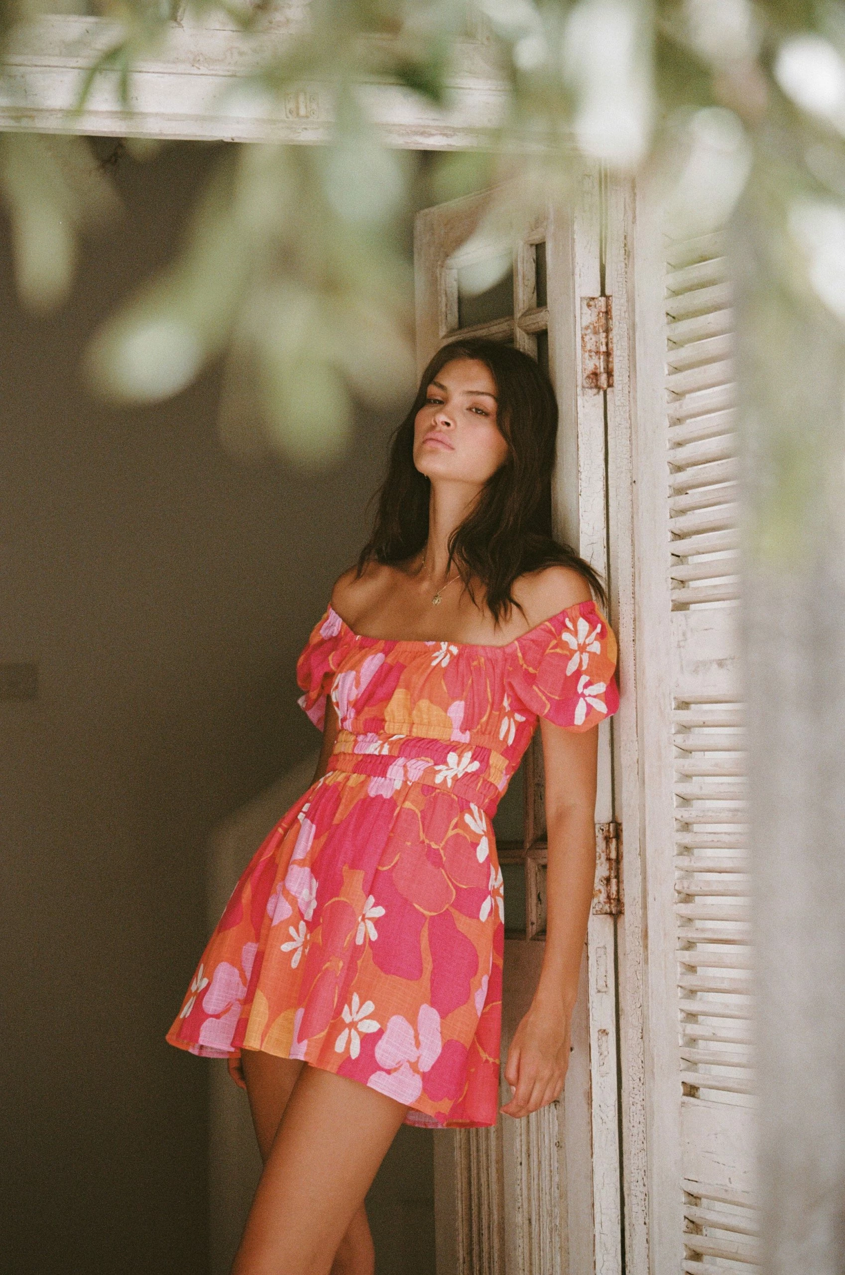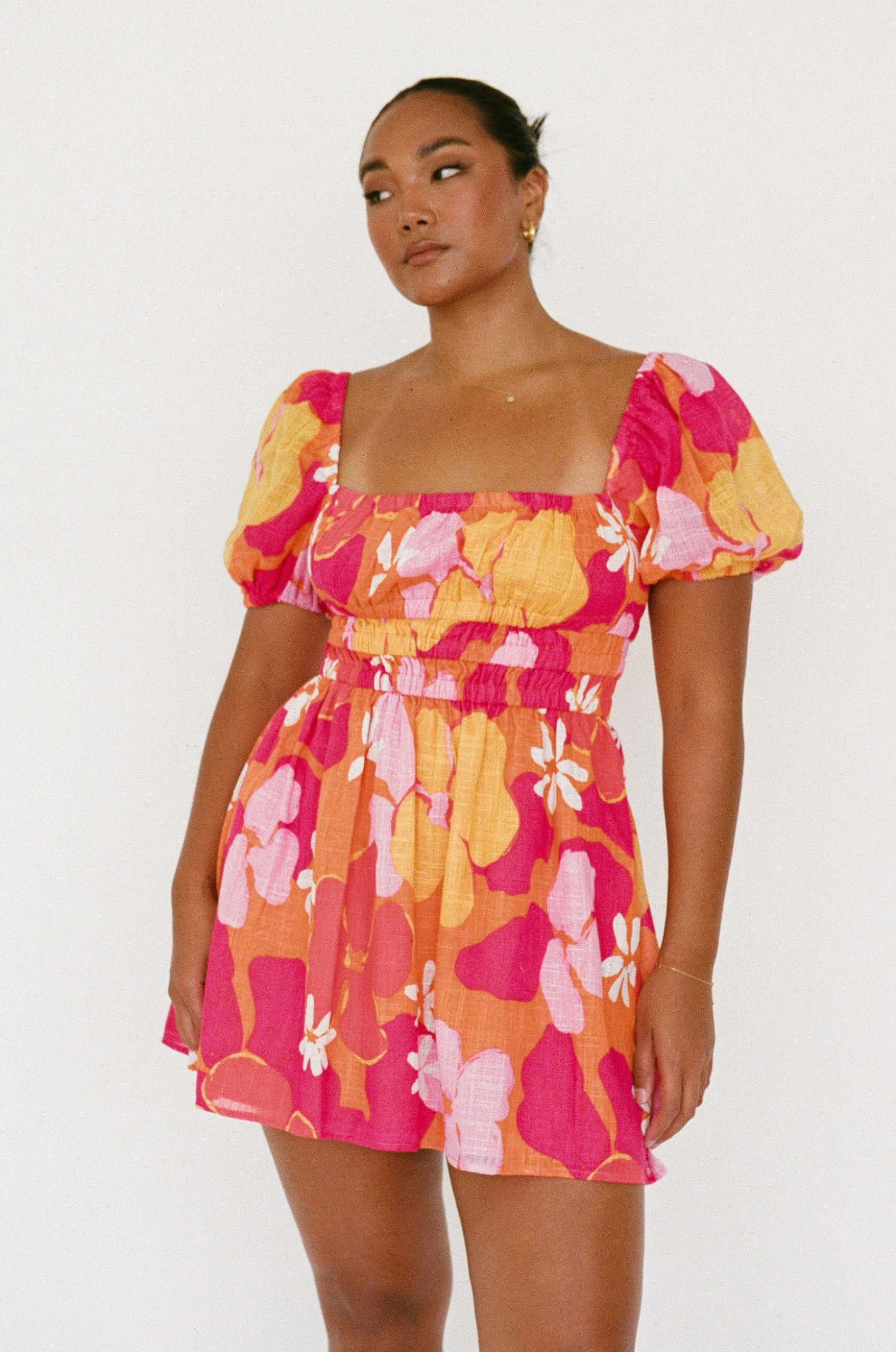 A super easy-to-wear style in the most delicious colours! The Amiyah Babydoll Dress is made from a lightweight natural cotton cheesecloth fabric with our exclusive new remi sunset print. It features cute puff sleeves, elastic square neckline, flattering elastic panels across waist and flouncy skirt. The perfect piece to wear on vacation! Designed exclusively by Sabo.