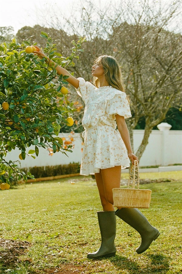 Obsessed with these feminine details! The Avelina Dress is made from a natural raw cheesecloth cotton fabric with our exclusive spring buttercup floral print throughout. It features short puff sleeves, high neckline with ruffle detailing, pintuck, frill and lace ladder trim detailing at chest, elasticated waist with drawstring and a flouncy skirt with lace trims throughout. Pair with nude heels and gold accessories for your next event! Designed exclusively by Sabo.