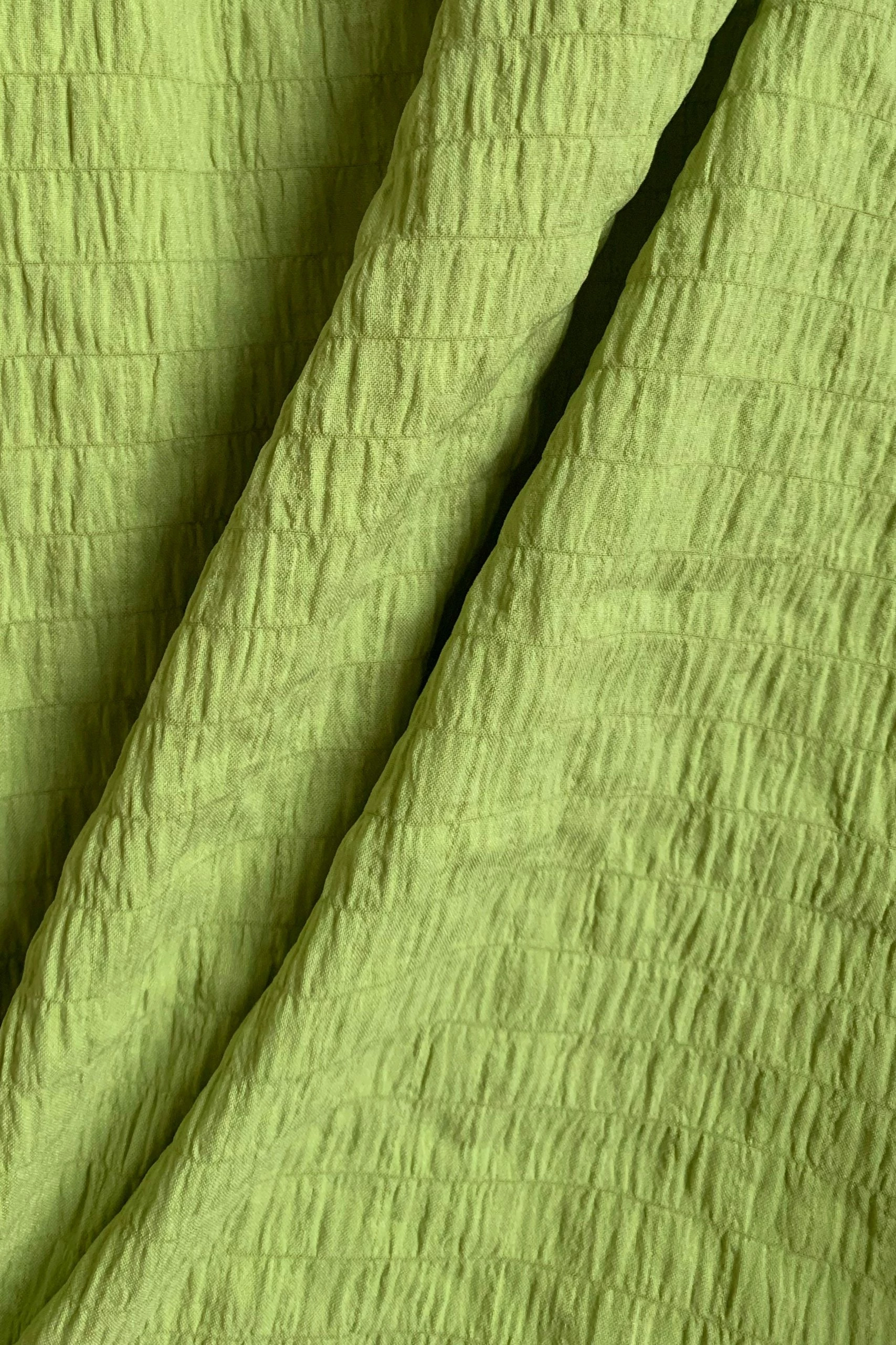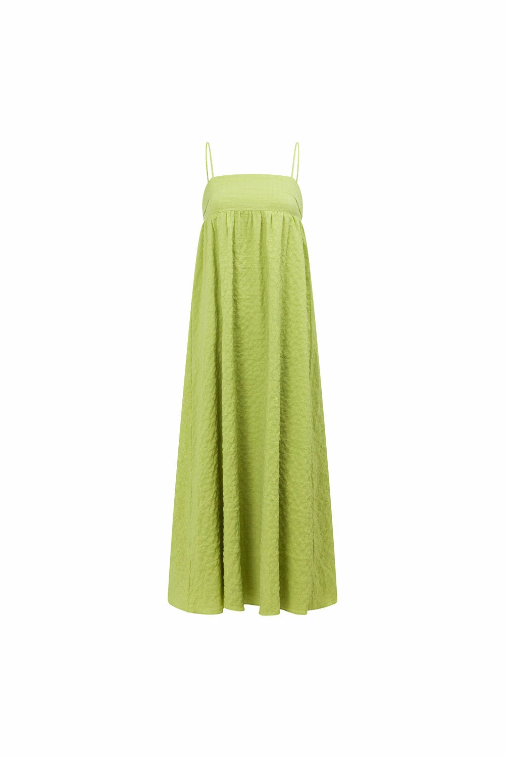 Throw it on for instant style! The easy-to-wear Azaria Dress is made from a lightweight textured fabric in a green hue. It is a midi style featuring thin rouleau straps, straight neckline, fitted bust and flowy skirt. Style with slides and the Selta Cateye Sunglasses! Designed exclusively by Sabo.