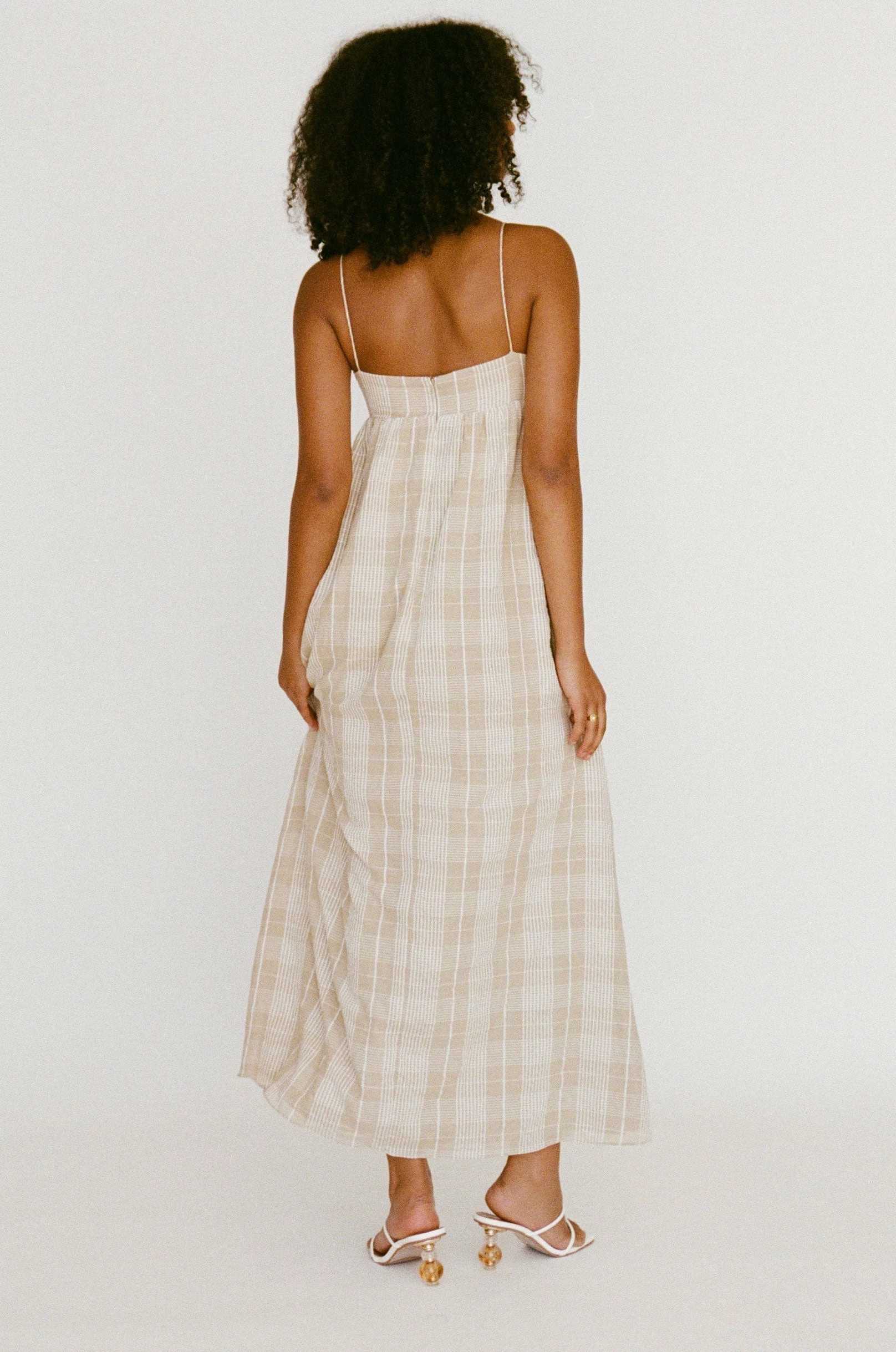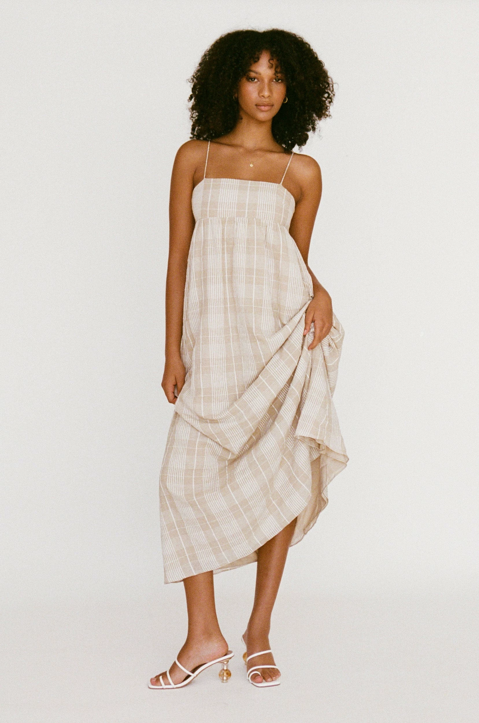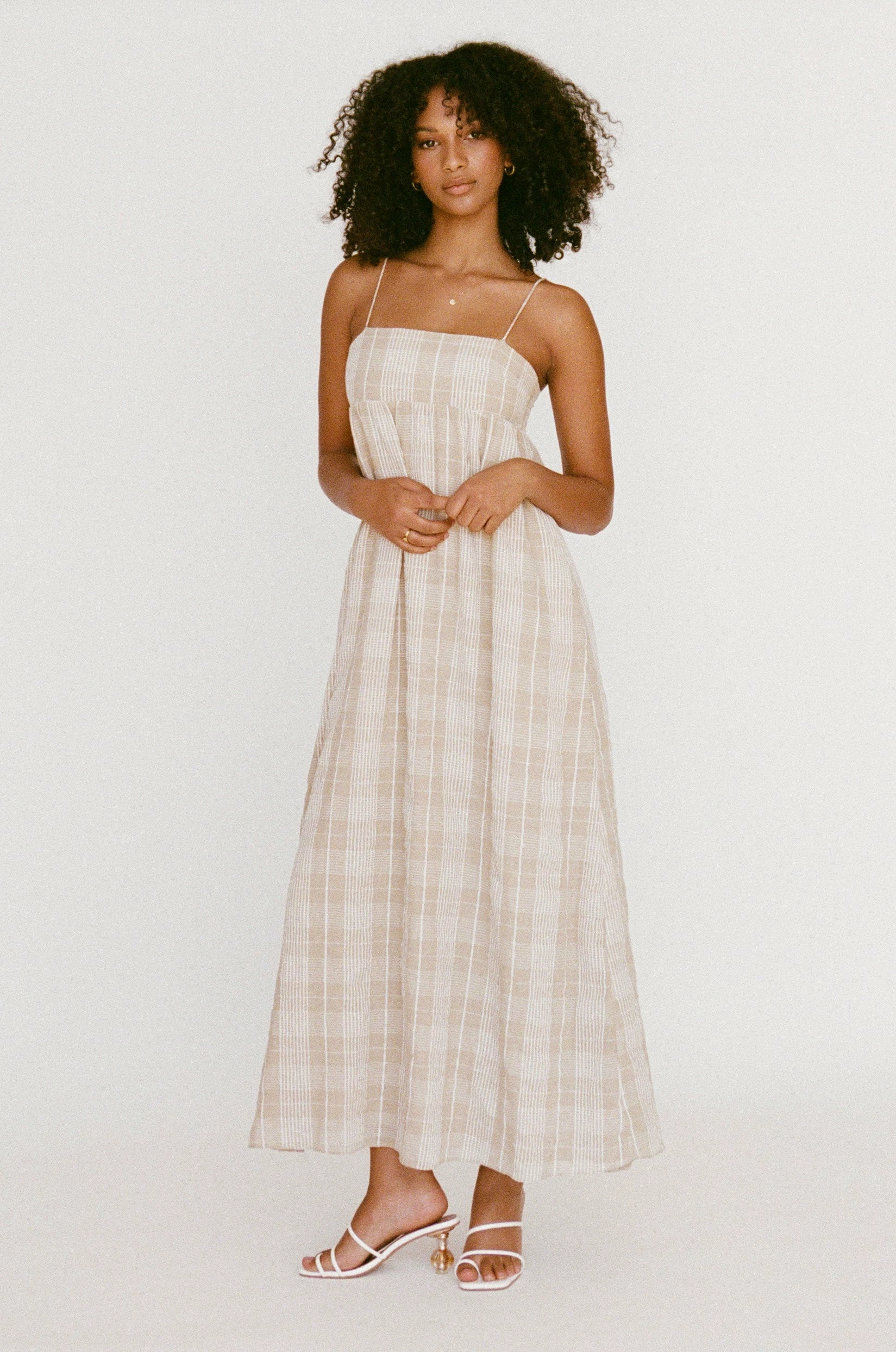 Throw it on for instant style! The easy-to-wear Azaria Dress is made from a super lightweight tan cotton fabric with white plaid. It features thin rouleau straps, straight neckline, fitted bust and flowy ankle grazing skirt. Style with slides and the Matisse Sunglasses! Designed exclusively by Sabo.