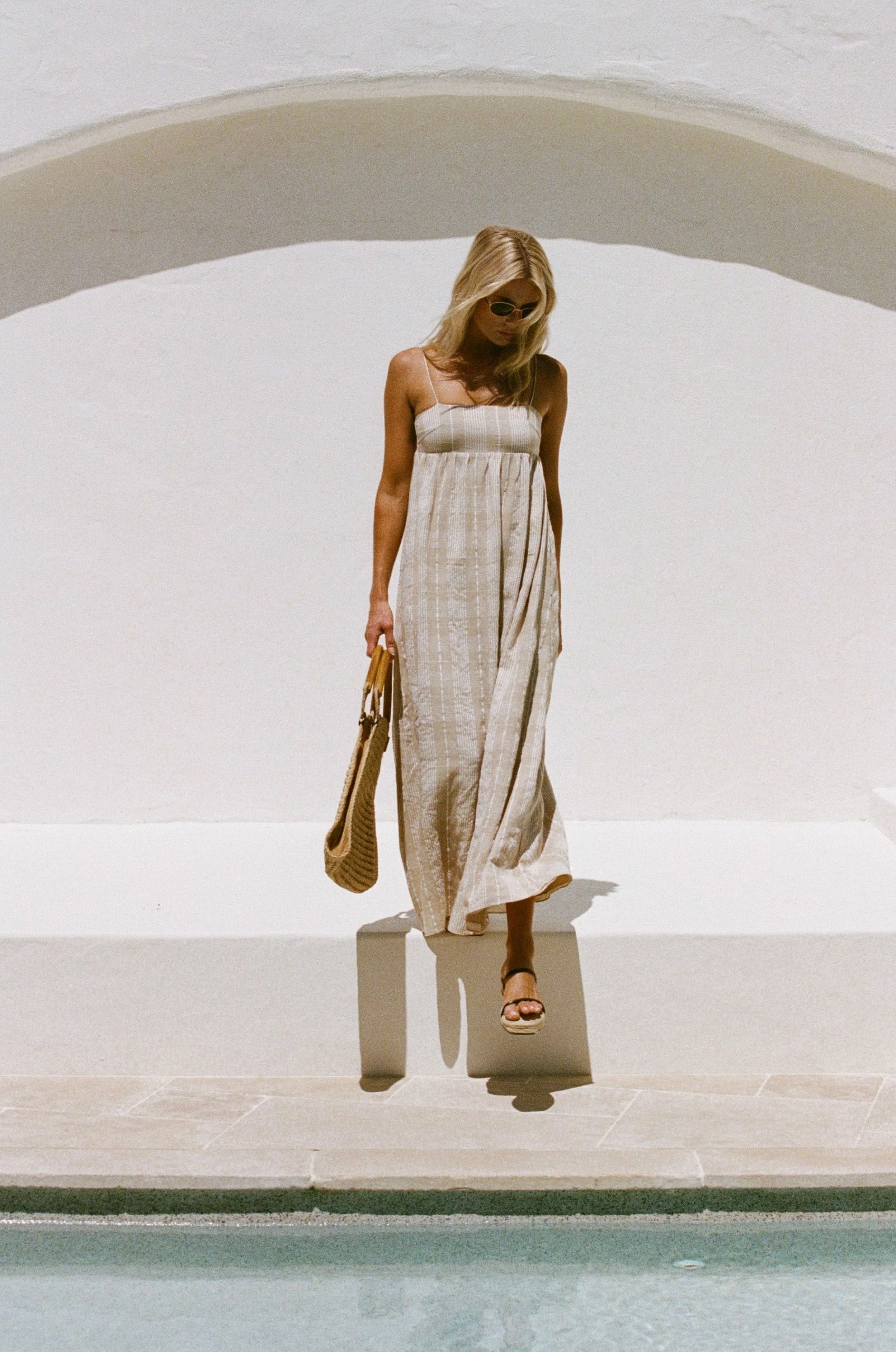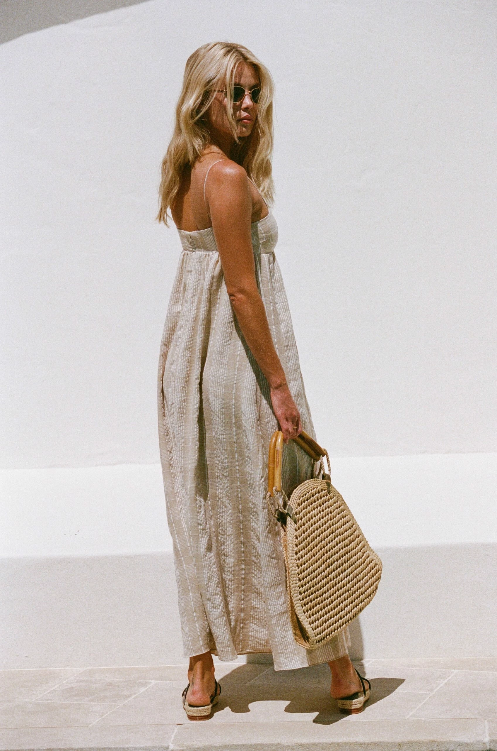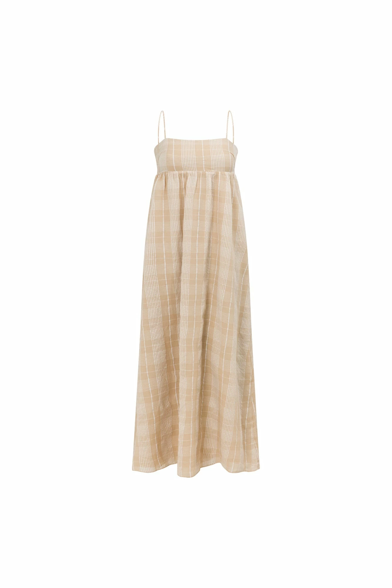 Throw it on for instant style! The easy-to-wear Azaria Dress is made from a super lightweight tan cotton fabric with white plaid. It features thin rouleau straps, straight neckline, fitted bust and flowy ankle grazing skirt. Style with slides and the Matisse Sunglasses! Designed exclusively by Sabo.