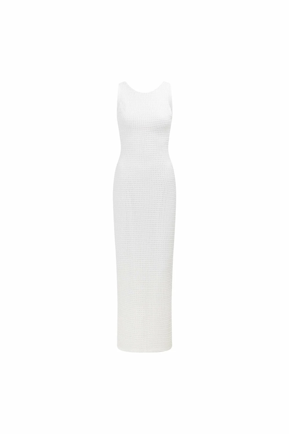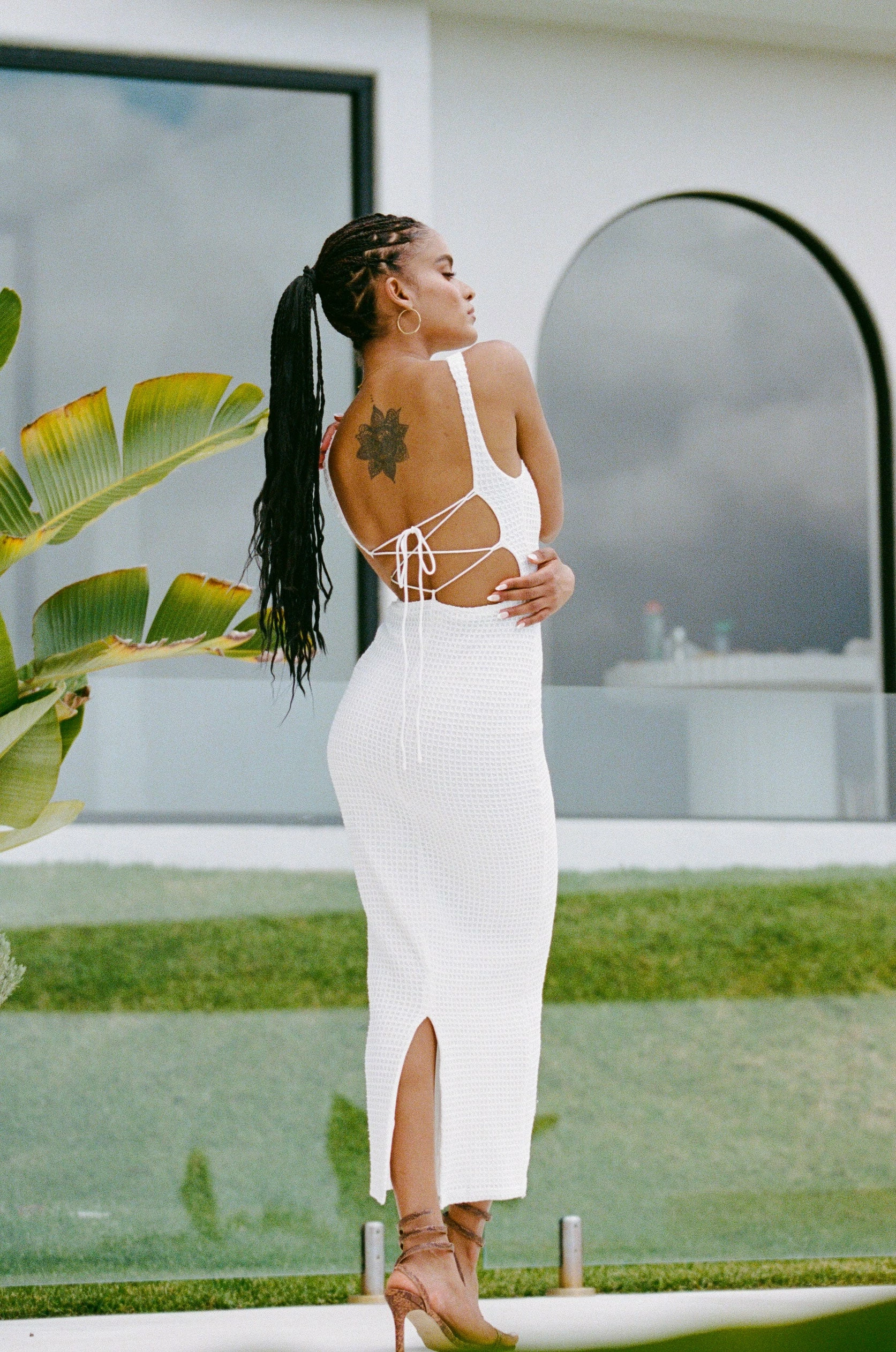 A chic design in a stunning textured fabric! The Backless Bruna Dress is made from a textured lattice fabric in white featuring an open back, high rounded neck and split at centre back. Style your look with the Strappy Ares Heels and black bag! Designed exclusively by Sabo.