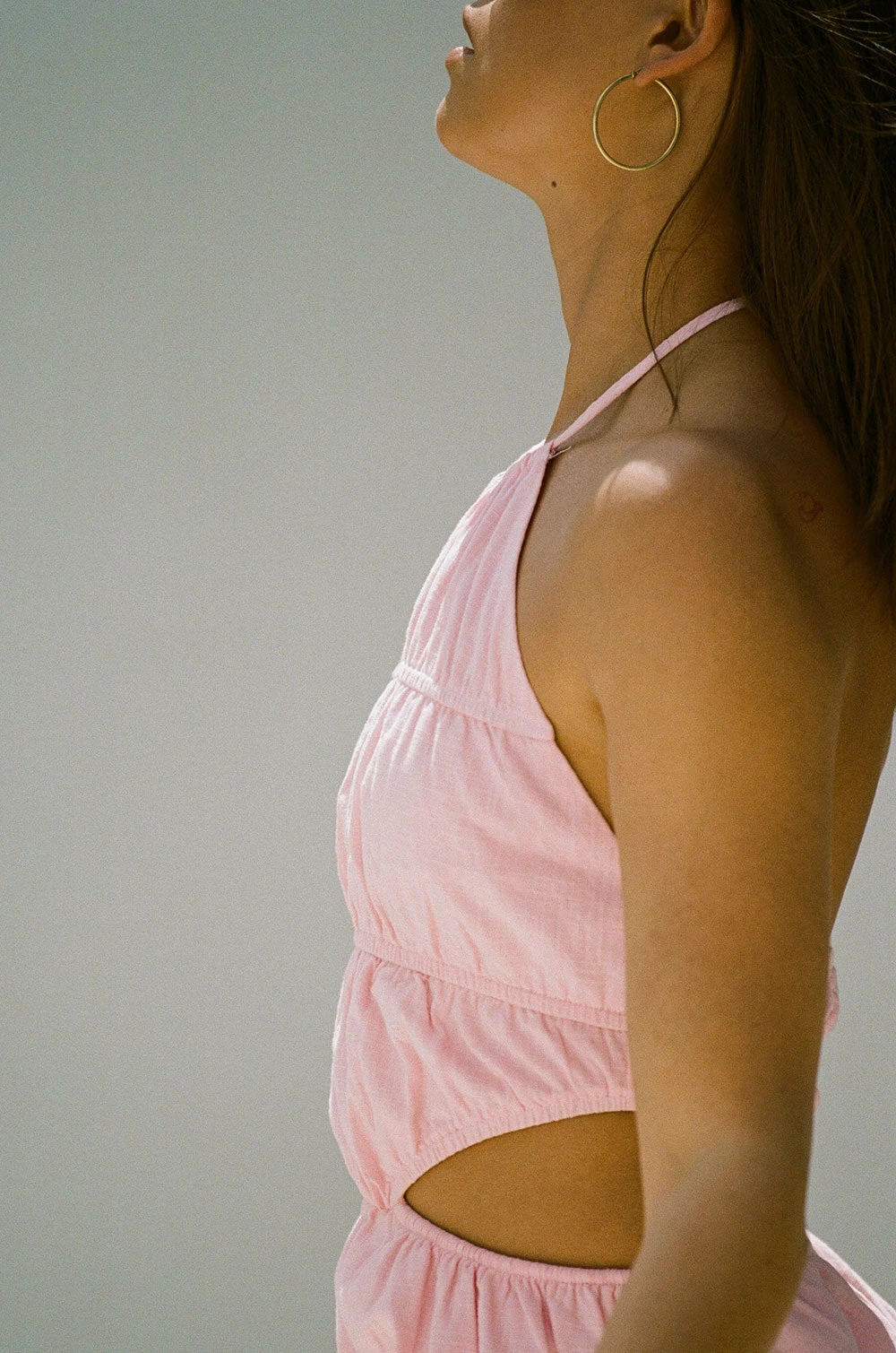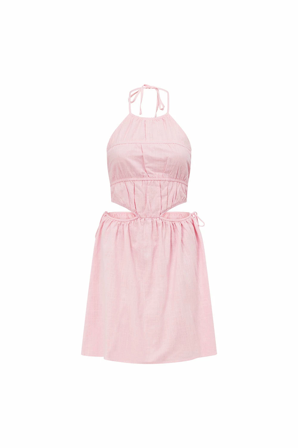 The perfect dress for the party season! The Backless Caliana Dress features an open back, halter neck tie, elastic detail and cutouts at waist, ties at sides and a flouncy skirt. Complete your look with the Strappy Rafaela Heels and Milli Link Earrings! Designed exclusively by Sabo.