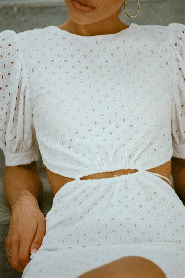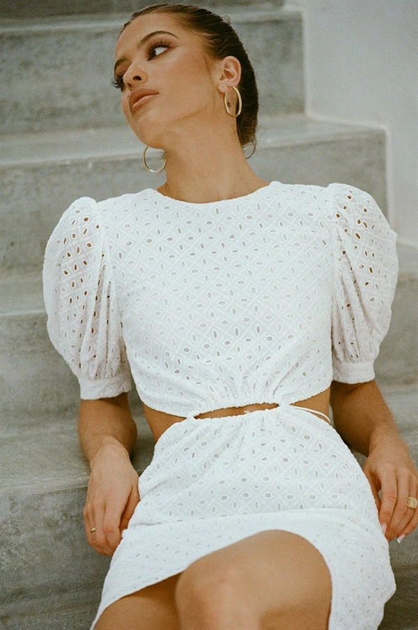 The Backless Carissa Dress is all class, baby! Made from a natural broiderie fabric, it features a high rounded neck, short puff sleeves, cutout and tie detailing at waist and an open back. Add some colour to your look and pair with the Rico Handle Bag and Strappy