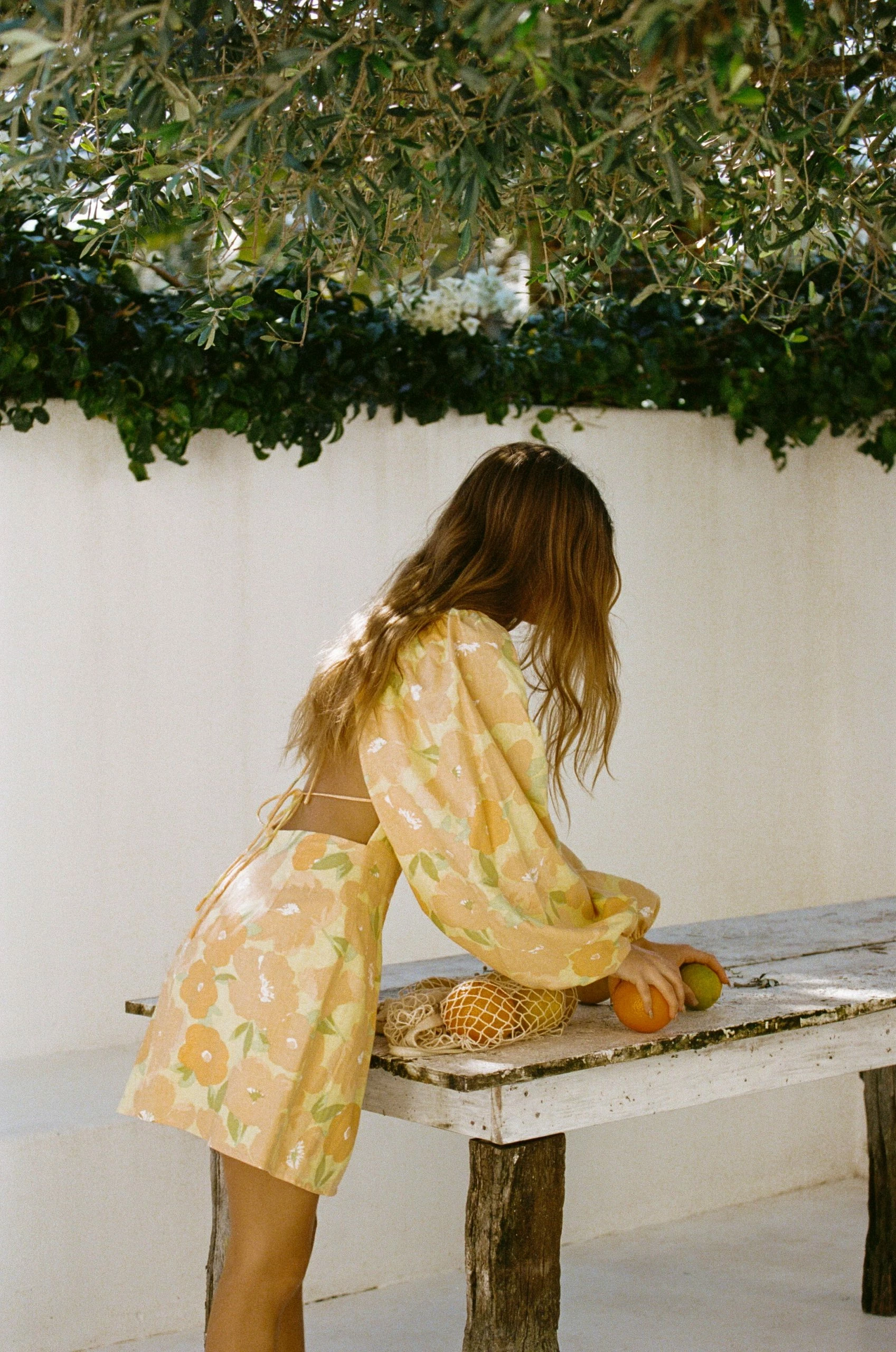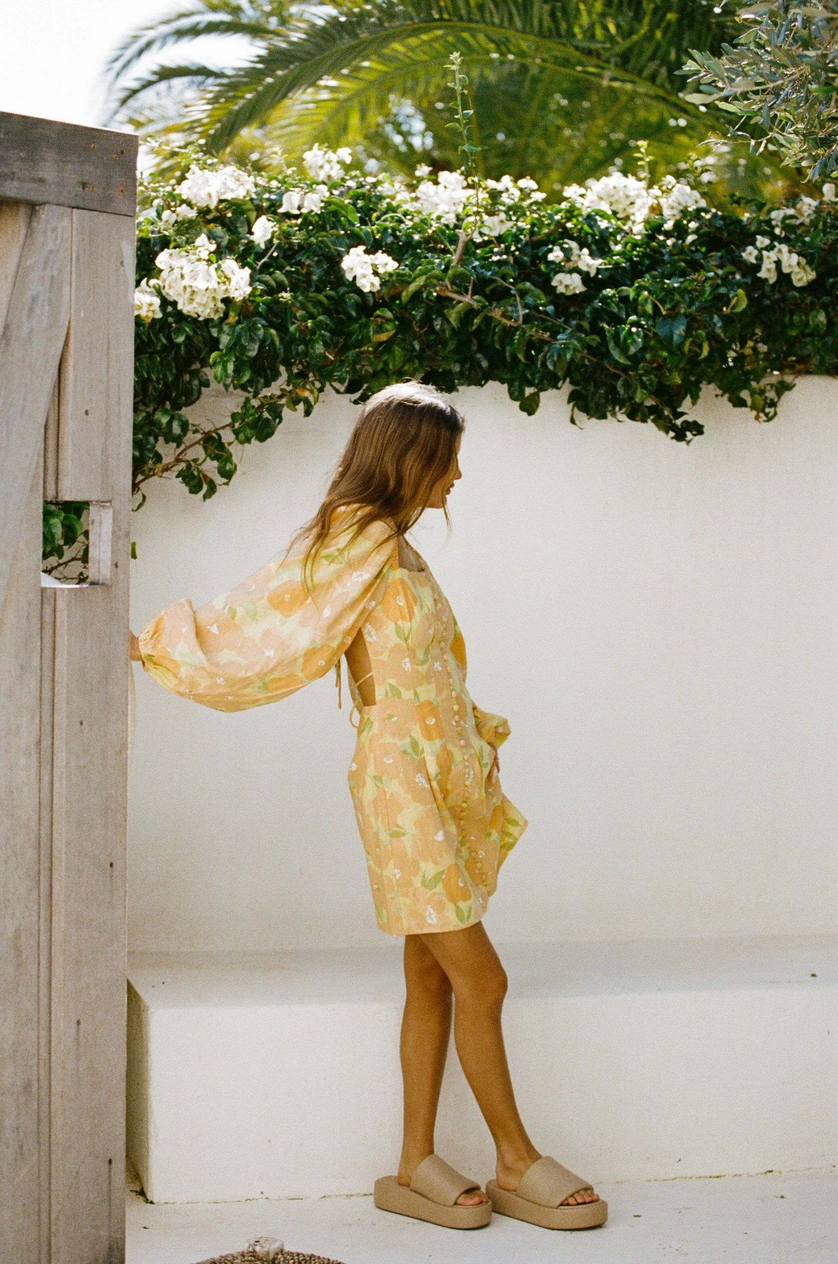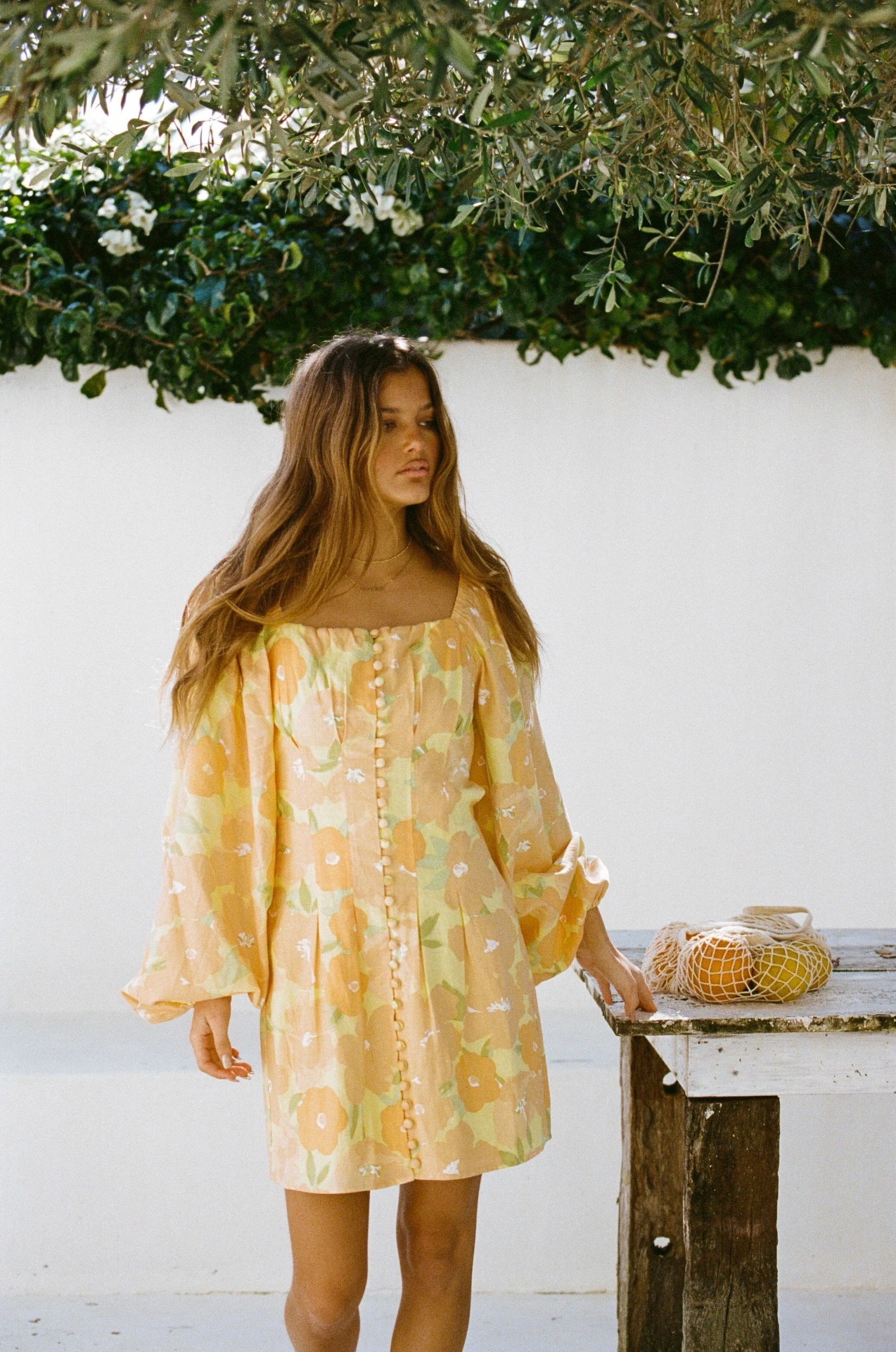 Inspired by sun drenched days and spring florals, the Backless Zhuri Dress is made from a high quality natural linen cotton blend fabric with our exclusive blooming floral citrus print. It features an open back with tie details, straight neckline, full length puff sleeves, fitted waist and covered button details down centre front. Dress it up with the Strappy Asteria Heels and Twist Isa Earrings for your next event! Designed exclusively by Sabo.