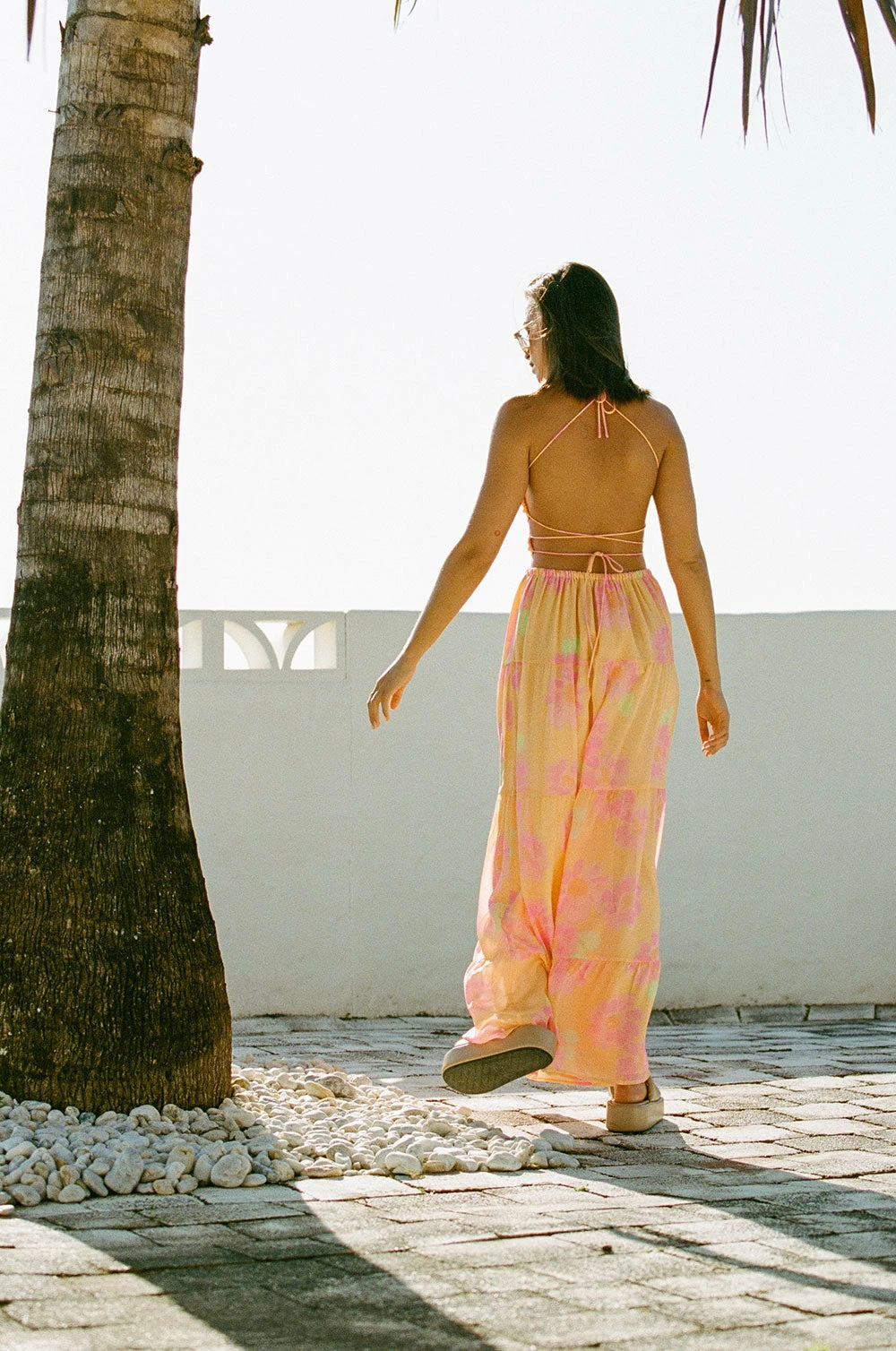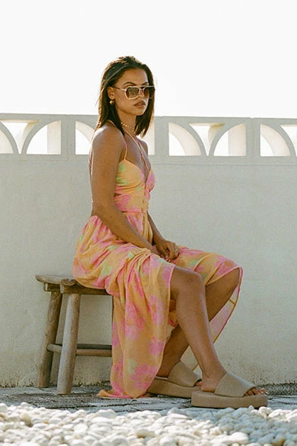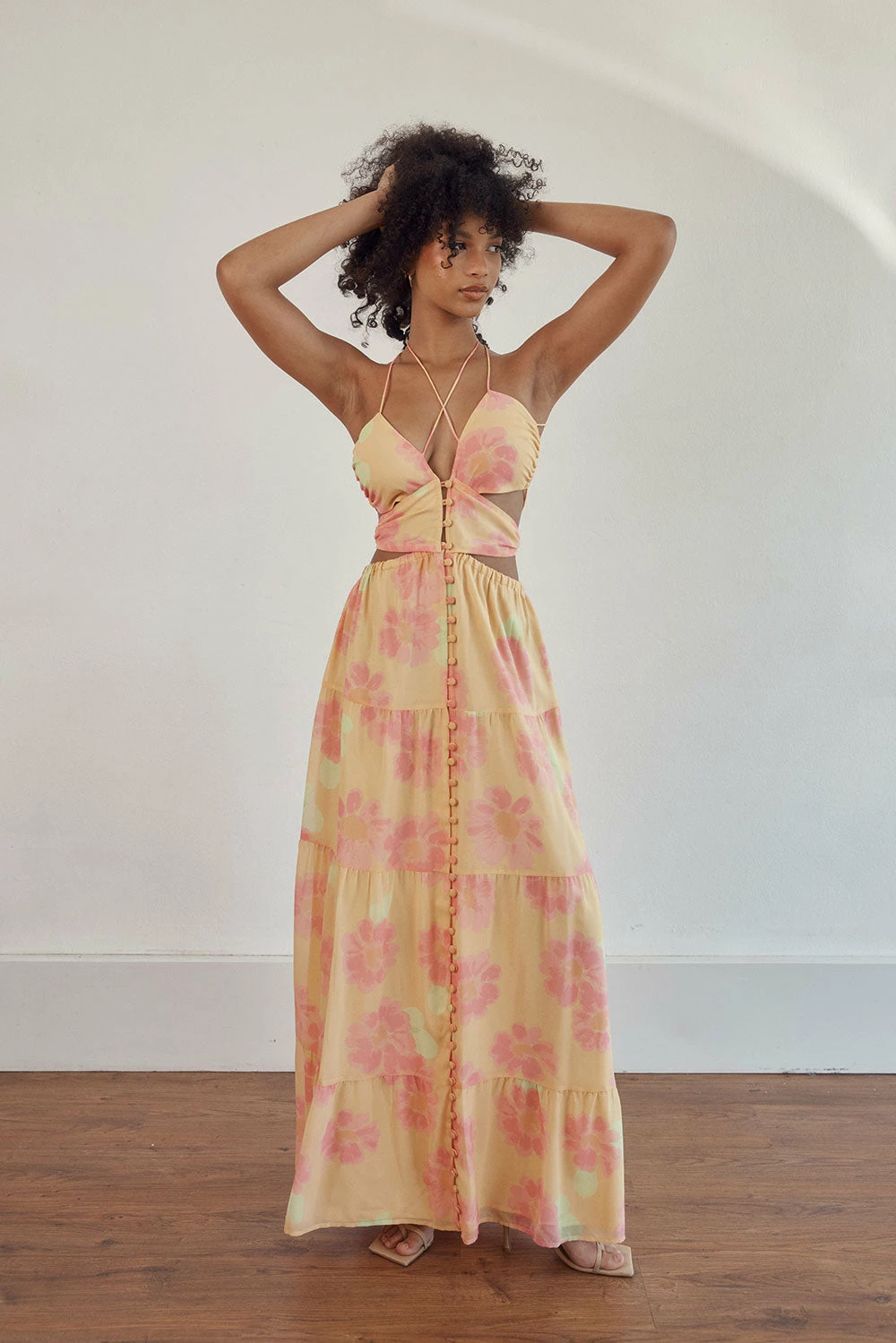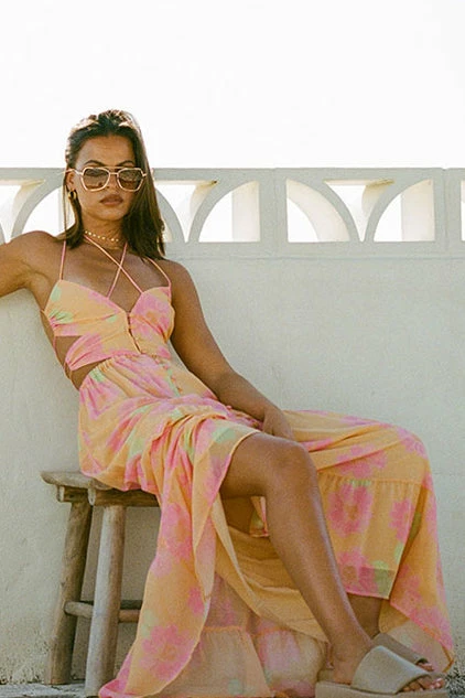 Designed to flatter! The Baila Maxi Dress is made from a luscious textured chiffon fabric with our exclusive pink painted flower print. It features a strappy open back, thin straps with halter detail, covered buttons down centre front, cutouts at bodice and a flouncy tiered skirt. The perfect look for an event! Designed exclusively by Sabo.