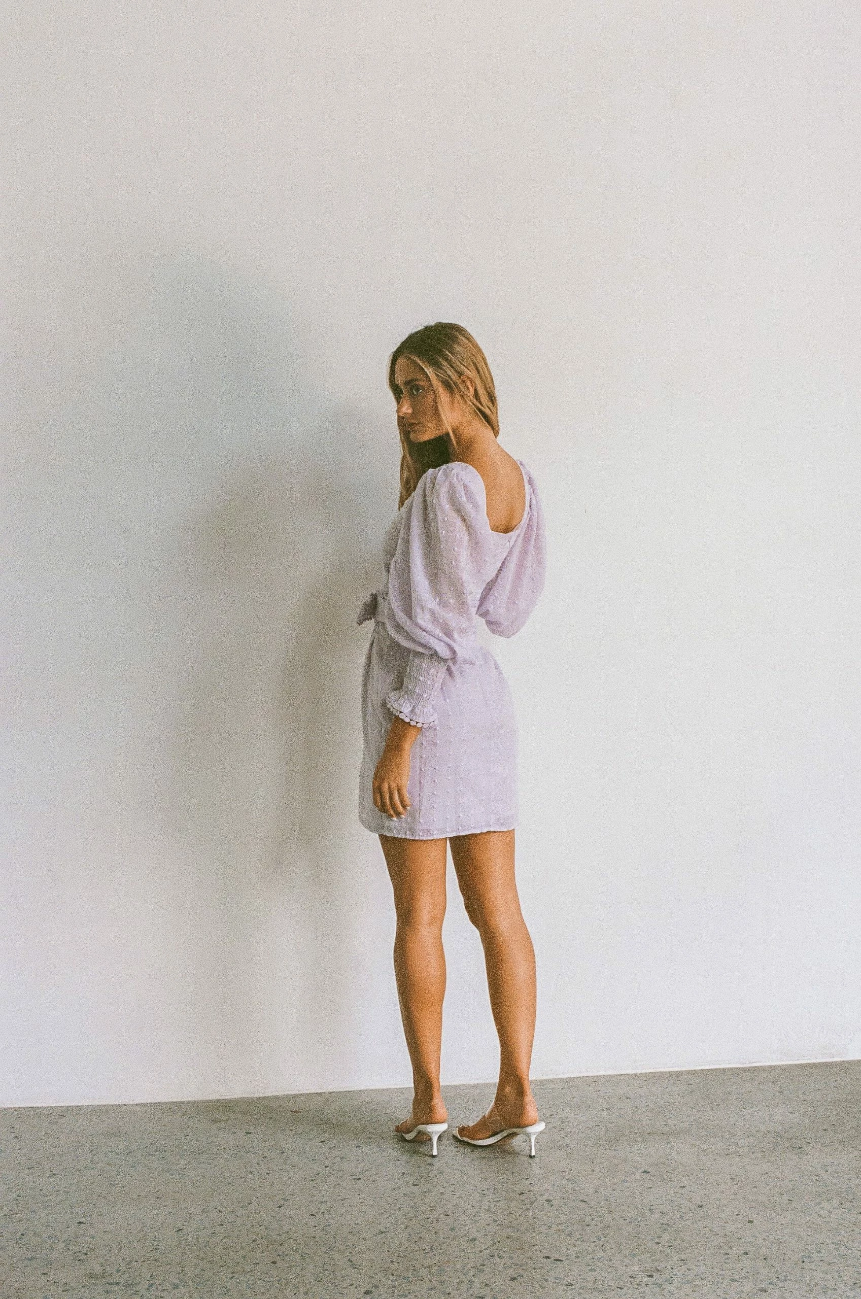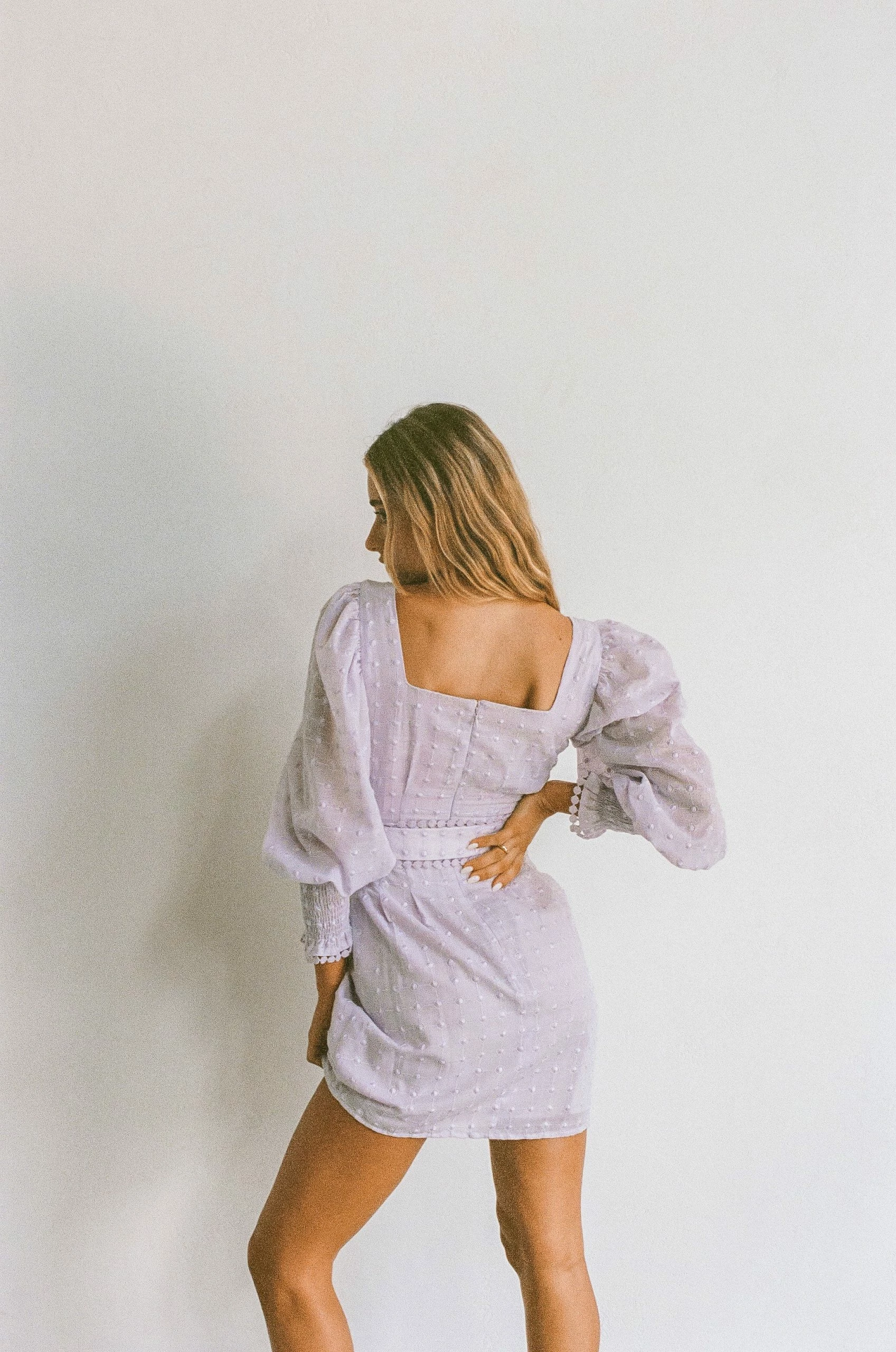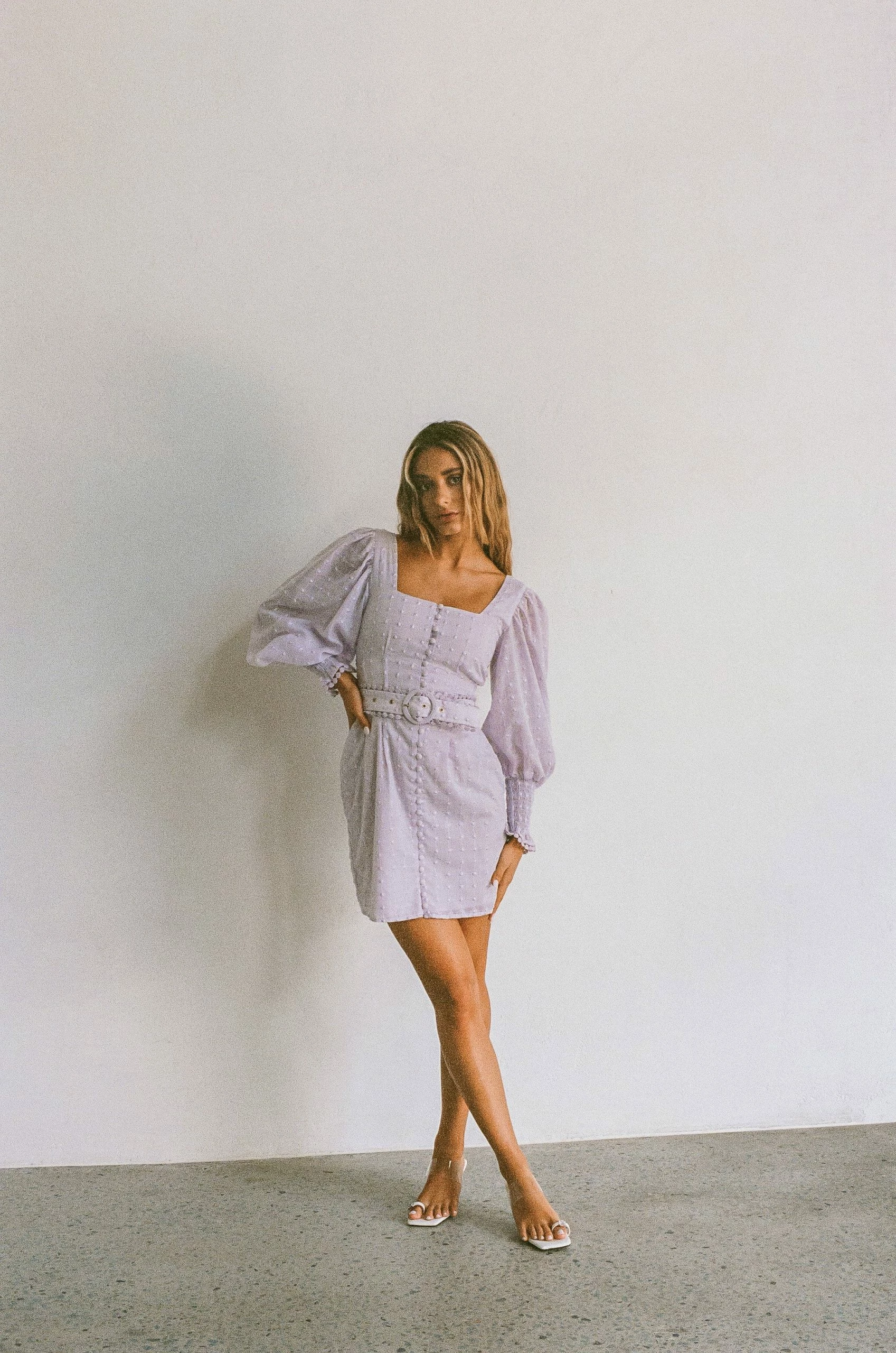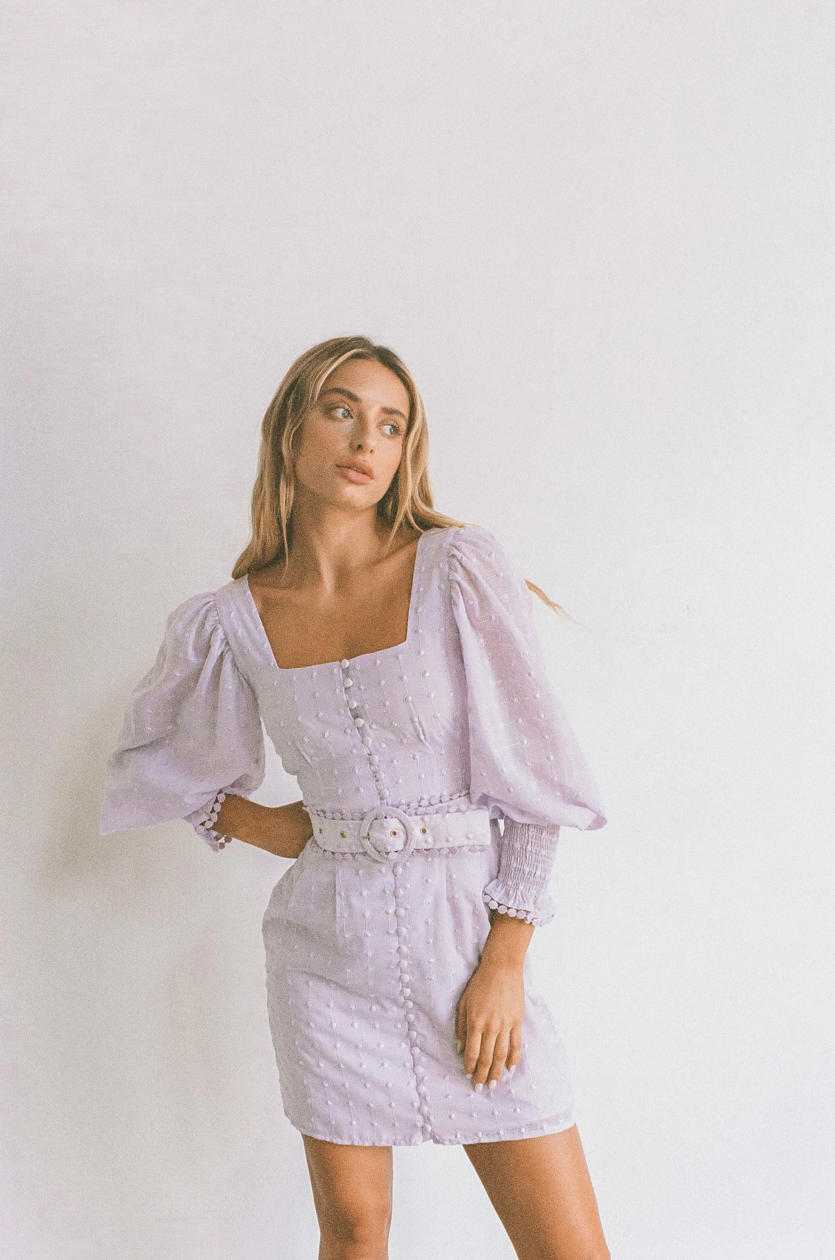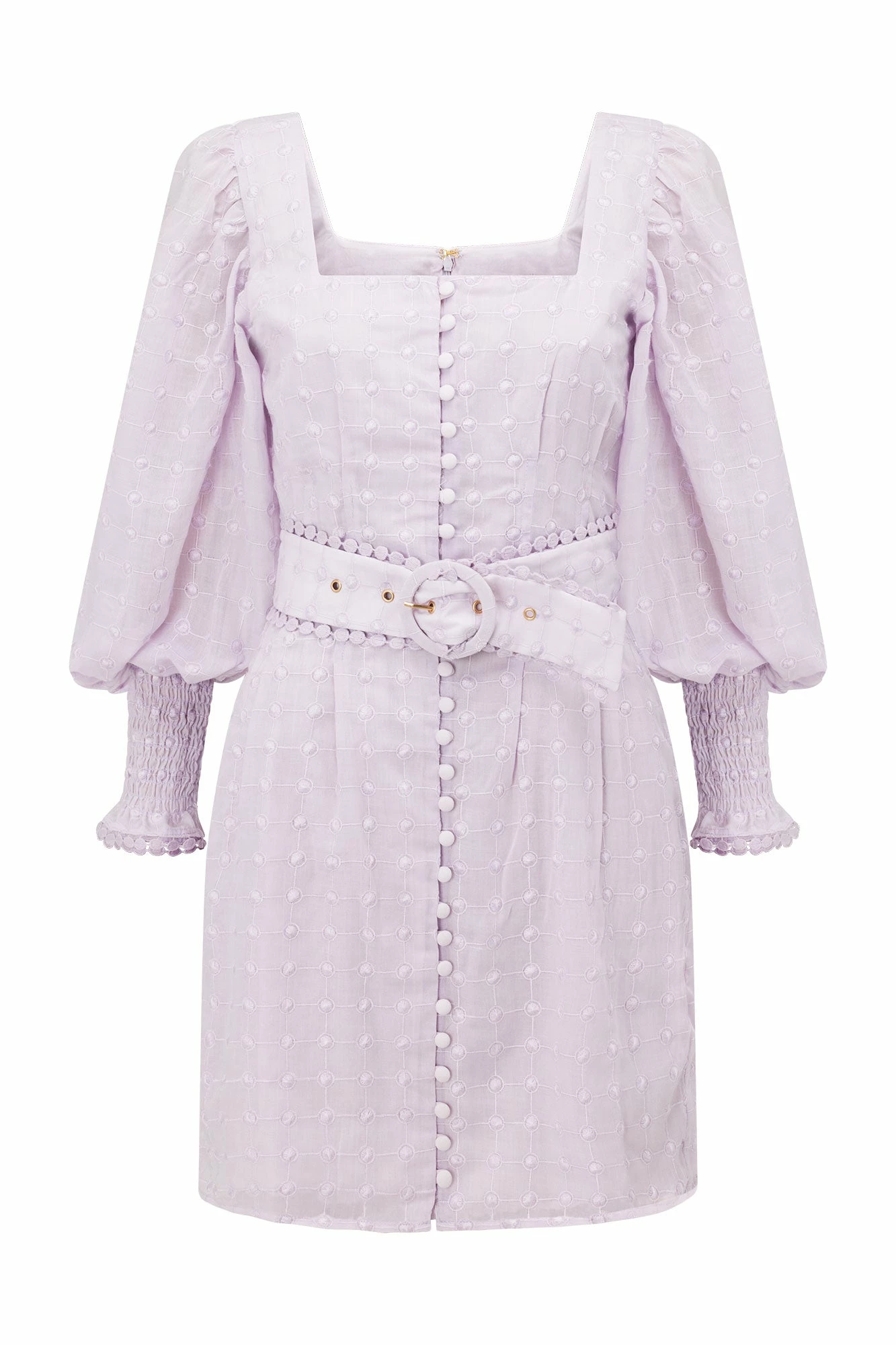 Fitted in all the right places to flatter your silhouette! The Belted Larose Dress is made from a textured spot embroidered voile fabric in a soft lilac hue. It features a square neckline, billowing puff sleeves with shirred cuffs and loop trims, covered button details at centre front and a structured belt. Pair with the Strappy Asteria Heels and gold accessories for your next event! Designed exclusively by Sabo.