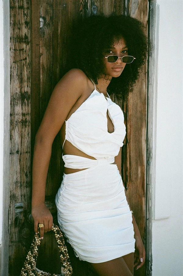 Inspired by Santorini, designed for your vacation wardrobe! The Benny Dress is made from a natural cotton fabric in off white. It is a backless halter style featuring a keyhole cutout at neck, cutouts at waist and a gathered skirt. Keep it casual and pair with sandals or dress it up with the Transparent Mules! Designed exclusively by Sabo.