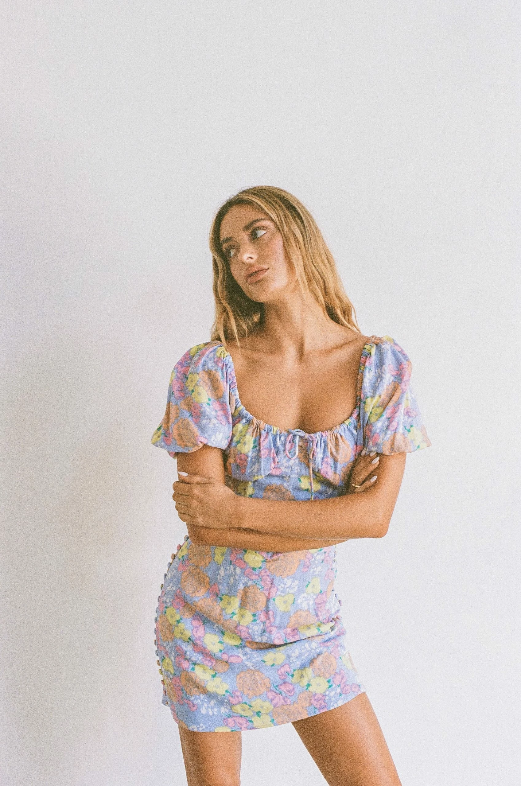 Designed to flatter, the Cartia Dress is made from a stunning viscose slub fabric with our exclusive Byrony Fiesta print. It features short puff sleeves, drawstring tie at centre neckline, corset style waist, cutouts at sides and a fitted skirt with covered button details. Dress it up with heels or keep it casual with chunky slides! Designed exclusively by Sabo.