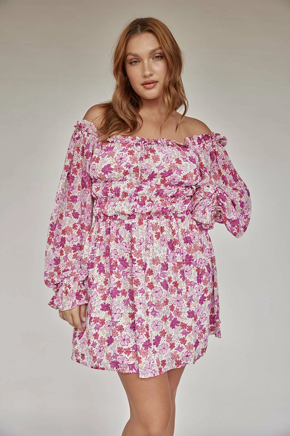 Our brand new purple haze floral print on a feminine new design! The Doja Off Shoulder Dress is made from a luscious textured chiffon fabric featuring off shoulder puff sleeves with frill cuffs, ruffle across neckline, elastic panels at bodice and a flouncy skirt. Dress it up with the Strappy Rafaela Heels! Designed exclusively by Sabo.