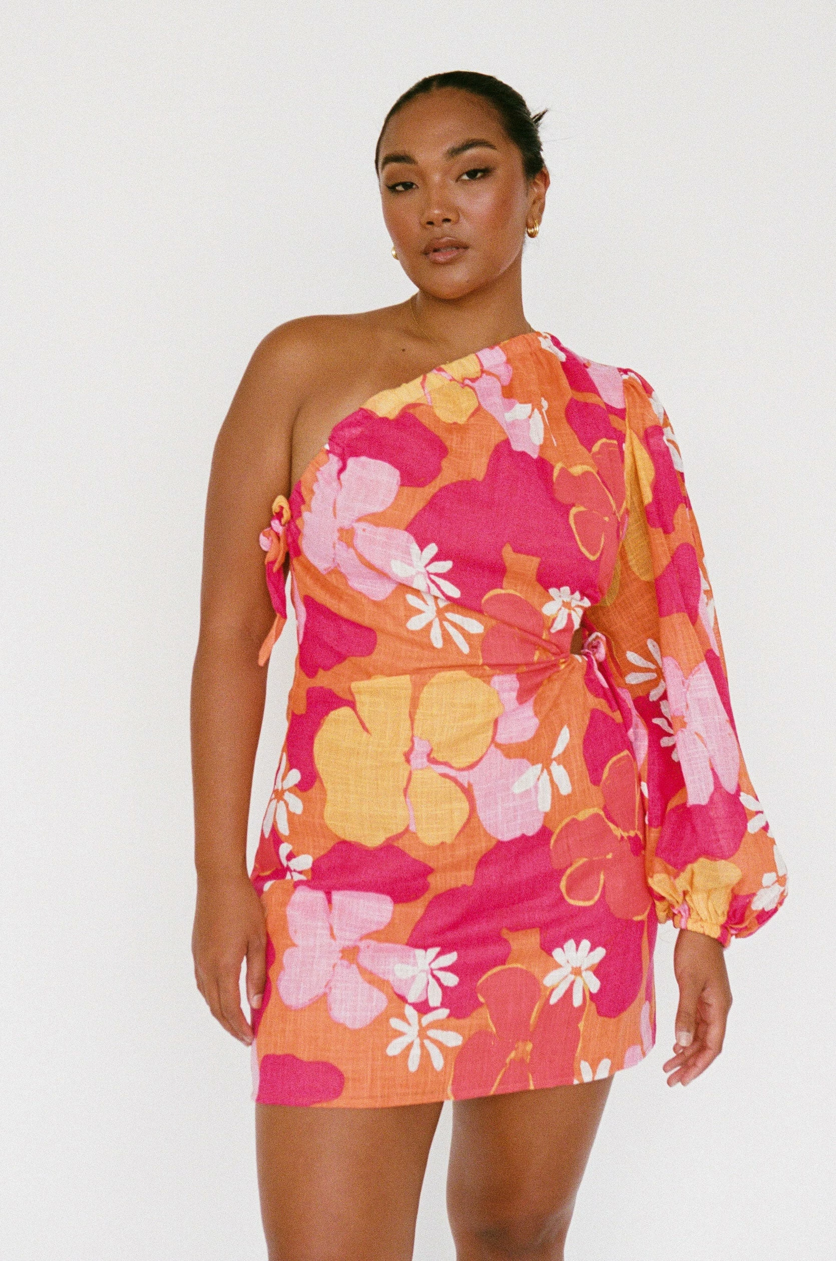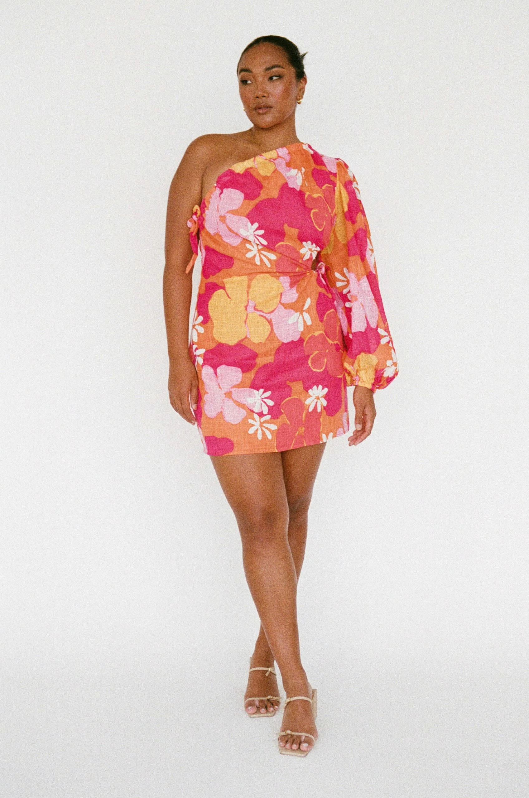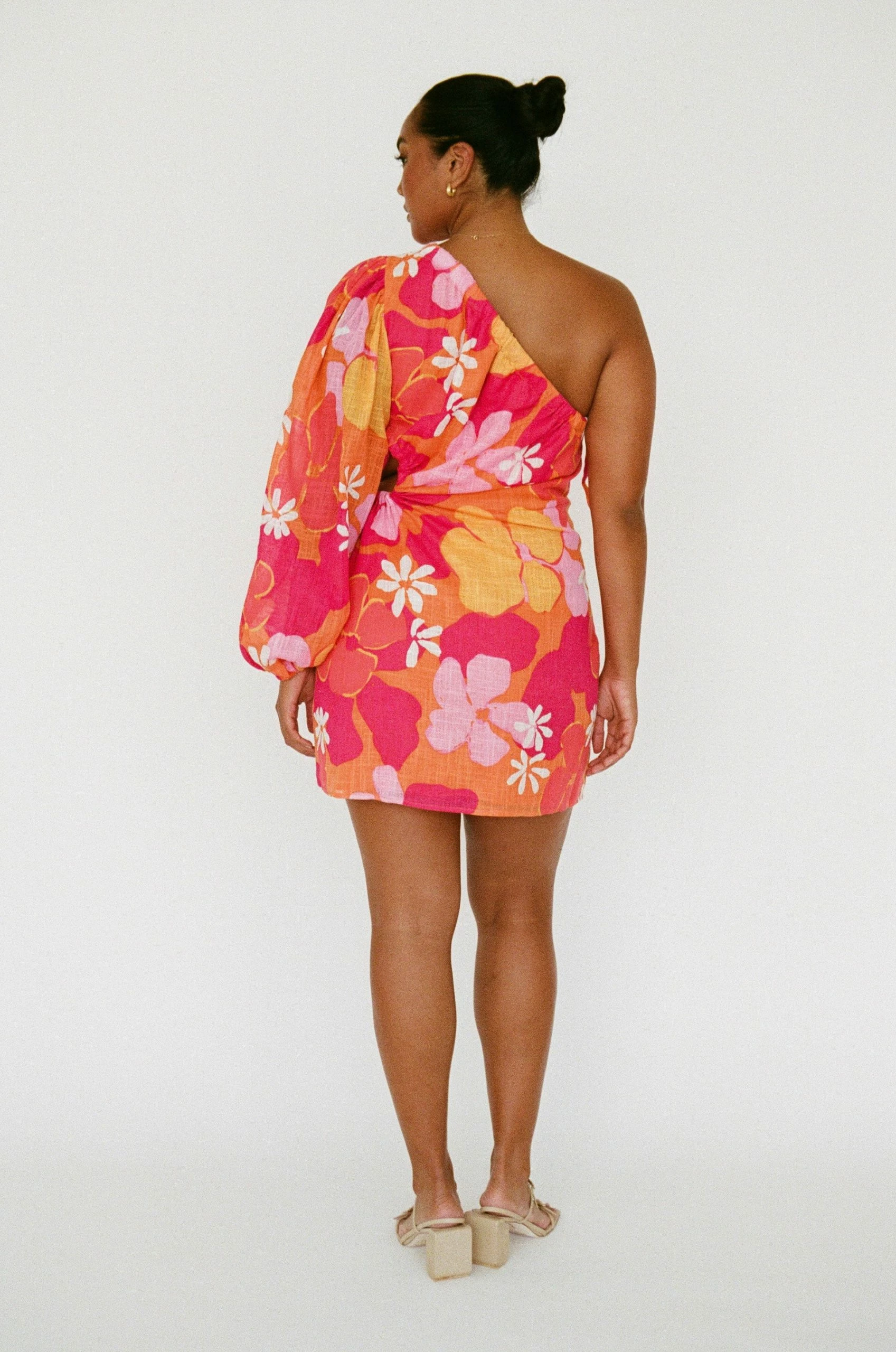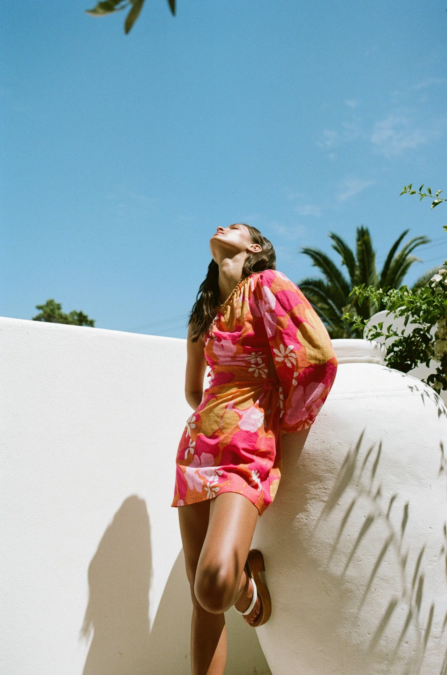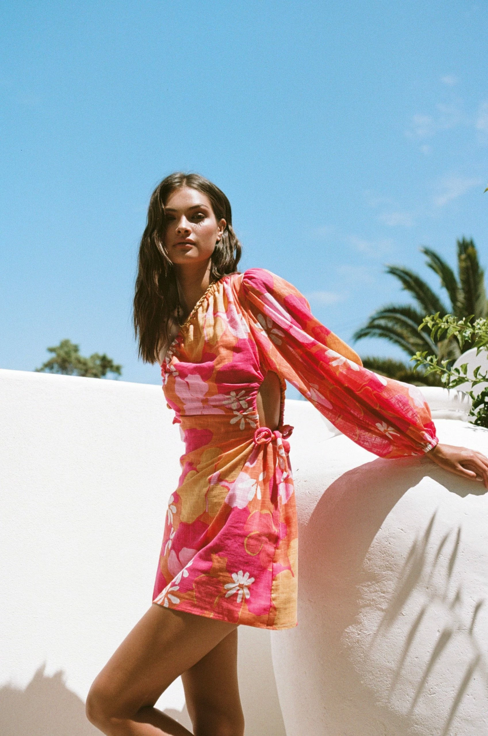Inspired by Italian sunsets, the Eila Cutout Dress is made from a lightweight natural cotton cheesecloth fabric with our exclusive remi sunset print. It features one full length puff sleeve and cutouts at waist with elastic and tie details. Dress it up with the Strappy Leila Heels and Livia Earrings! Designed exclusively by Sabo.