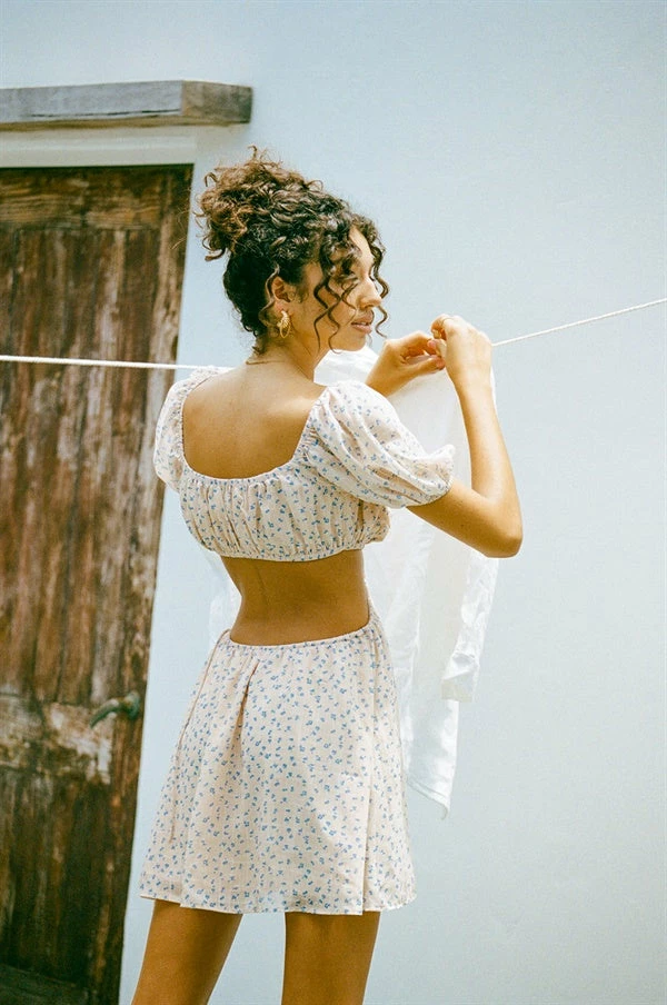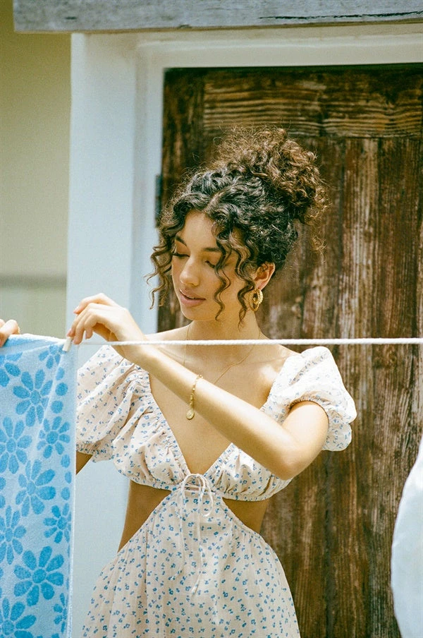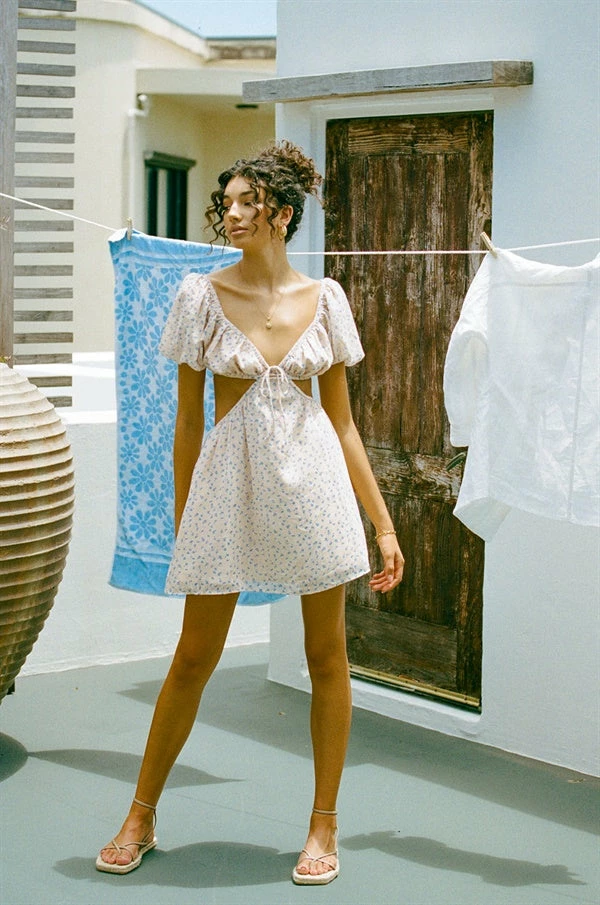 Our favourite style in a summer print! The Eilish Dress is made from a lightweight chiffon-feel fabric featuring flattering cutouts at waist, short puff sleeves, a flouncy skirt and tie detailing at sides of waist. Designed exclusively by Sabo.