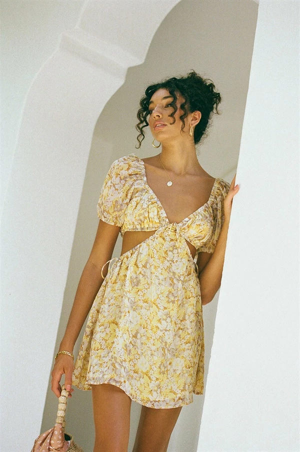 Our favourite style in a summer print! The Eilish Dress is made from a lightweight chiffon-feel fabric featuring flattering cutouts at waist, short puff sleeves, a flouncy skirt and tie detailing at sides of waist. Designed exclusively by Sabo.