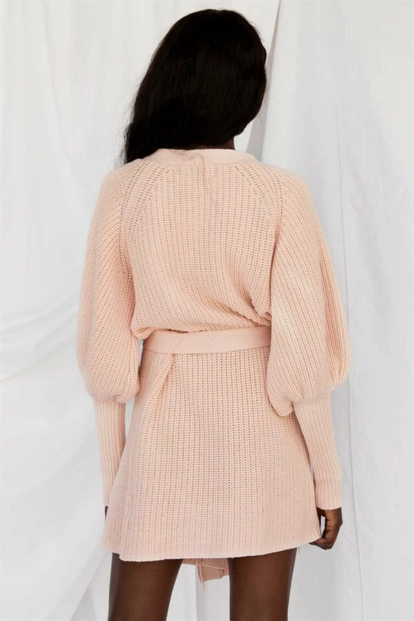 The vintage inspired Elle Knit Dress is made from a knitted fabric in a blush hue. It is a wrap style featuring a plunging neckline, puff sleeves with fitted elbow length cuffs and a matching waist tie. Pair with the Tulli Baguette Bag and 18K Twist Earrings for an effortlessly chic look! Exclusively designed by Sabo.