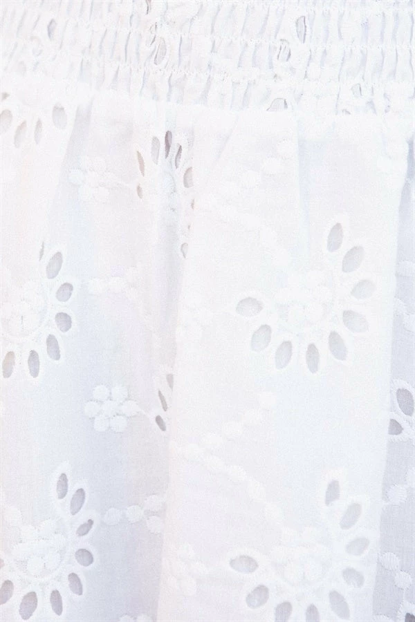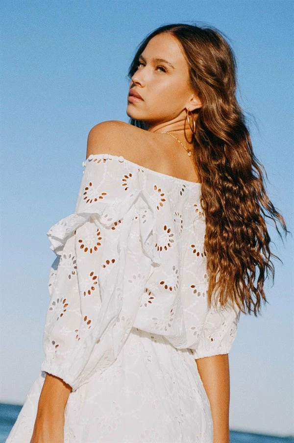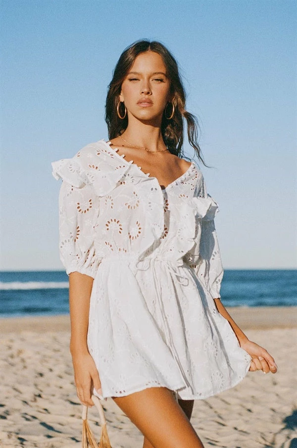 Made from the most stunning natural cotton broderie anglaise fabric, the Eve Dress is sure to turn heads! It features 1/2 length puff sleeves, V neckline with frill and covered button and loop detailing, drawstring at waist and flouncy skirt. Keep it edgy and pair with sneakers or dress it up with the Salina Strappy Sandals! Exclusively designed by Sabo.