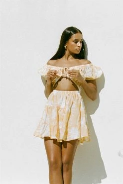 Flattering and inspired by spring! The Hartley Dress is made from a high quality natural orange fabric with our exclusive bold sunflower print. It is an off shoulder style featuring short puff sleeves, ties at bust, cutout at waist and floucy triple tiered skirt. Dress your look up with the Transparent Mules and Micro Beaded Bag! Designed exclusively by Sabo.