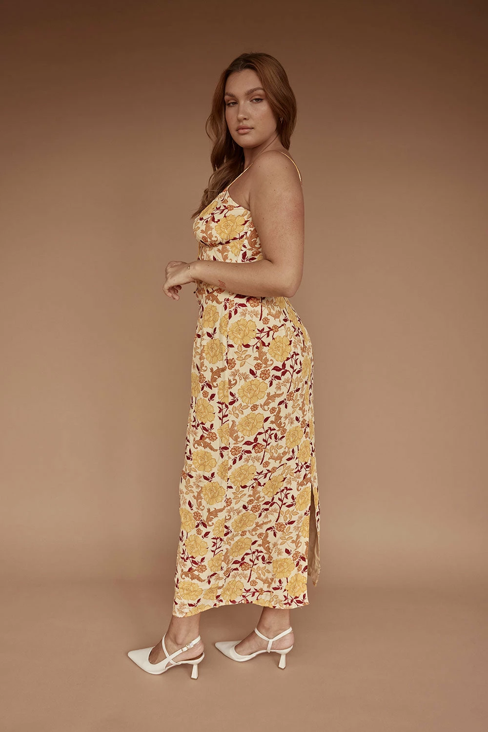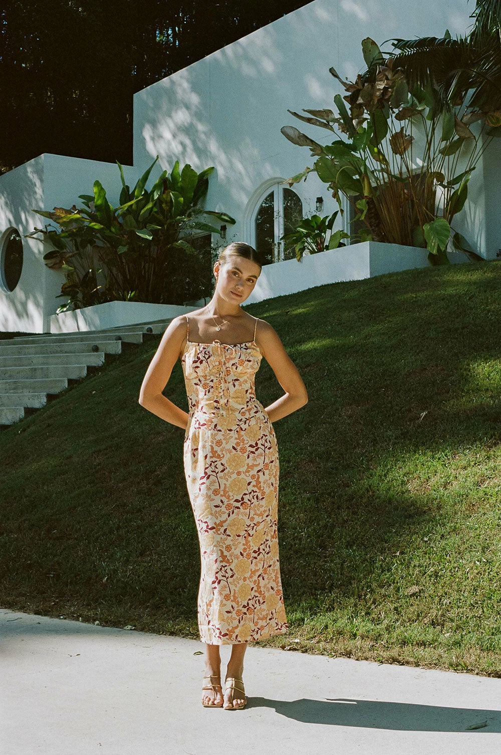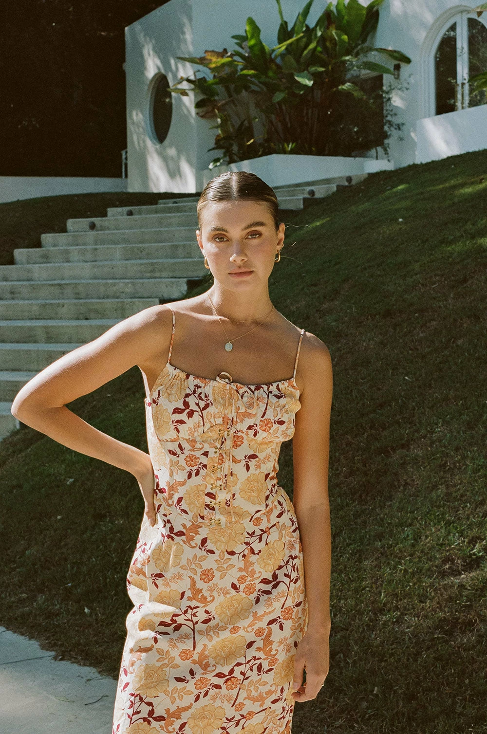 Step into the room feeling like class! The Haven Midi Dress is made from a high quality zipper crepe fabric with our exclusive vintage floral haze print. It features adjustable thin straps with a tie at centre neckline, gold hook eye details at centre front, boning at waist for added structural support and a centre back split. Dress it up with the Amal Pearl Earrings and Zita Strappy Sandals! Designed exclusively by Sabo.