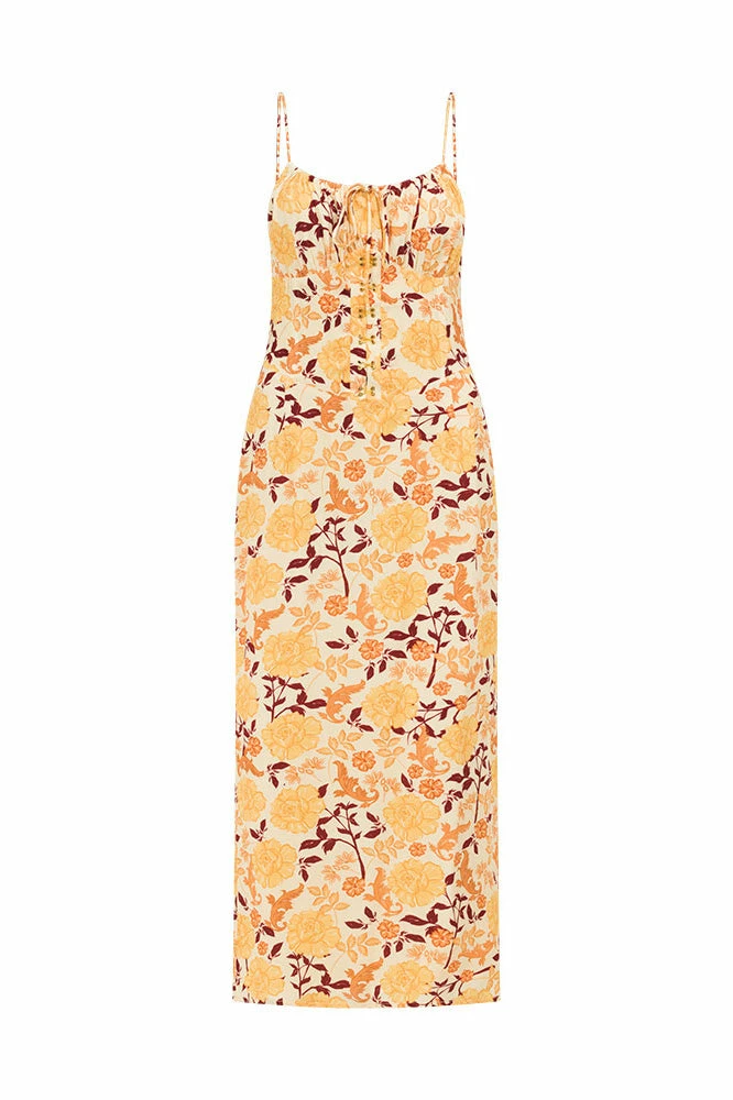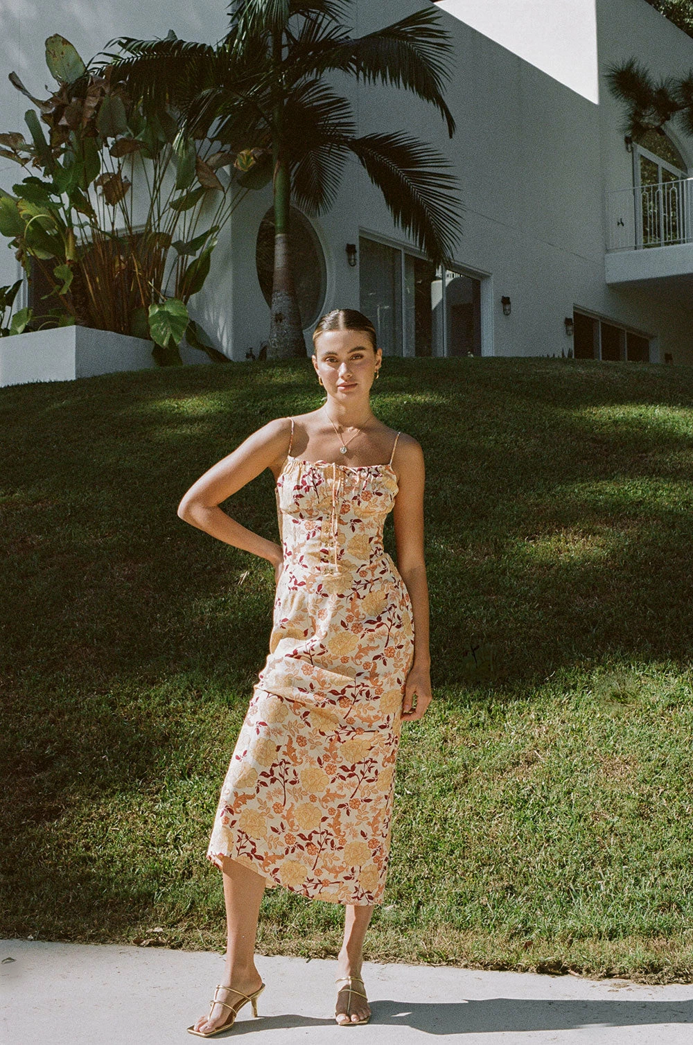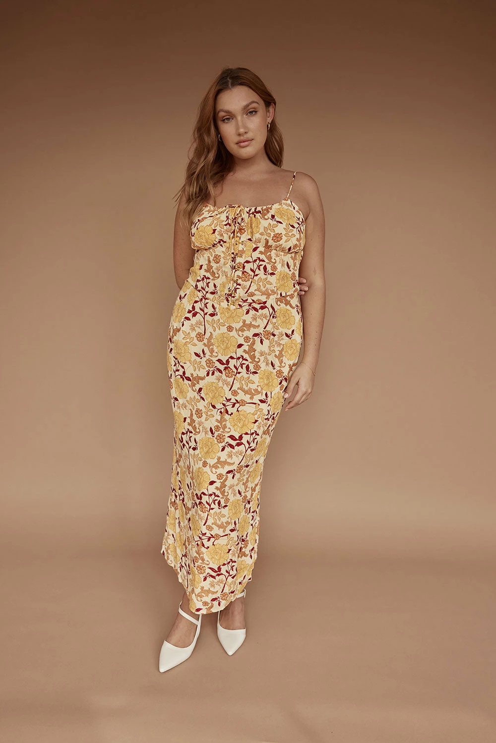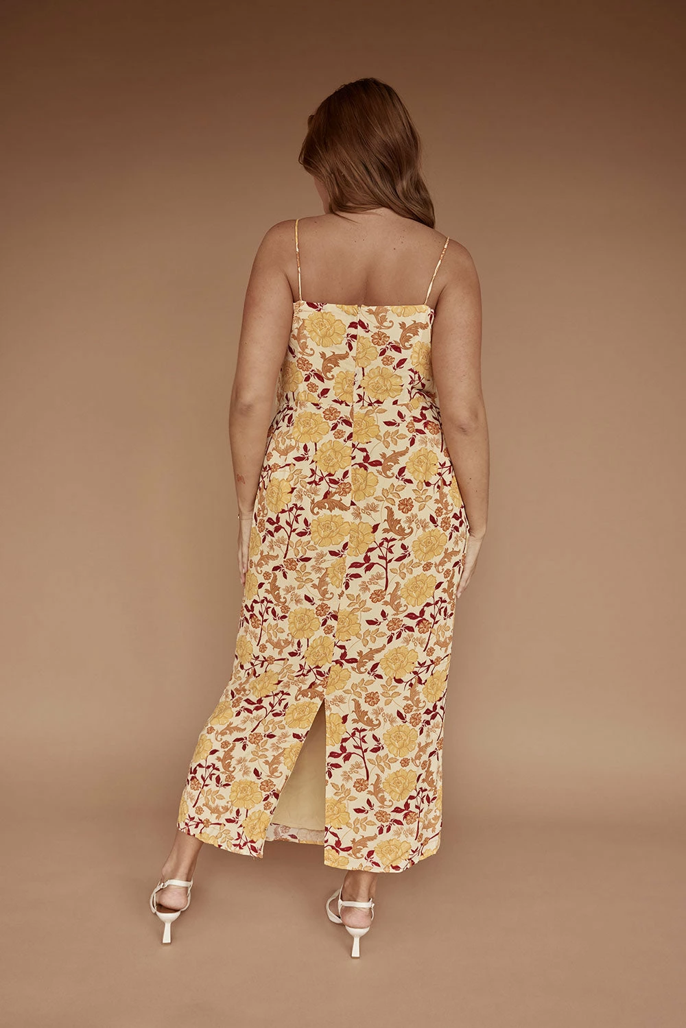 Step into the room feeling like class! The Haven Midi Dress is made from a high quality zipper crepe fabric with our exclusive vintage floral haze print. It features adjustable thin straps with a tie at centre neckline, gold hook eye details at centre front, boning at waist for added structural support and a centre back split. Dress it up with the Amal Pearl Earrings and Zita Strappy Sandals! Designed exclusively by Sabo.