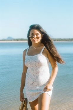 The super flattering Jamila Dress can be dressed up or down, perfect for any occasion! It is made from a cotton blend off white knit with a candy speck throughout. It is a body hugging cami style featuring a straight neckline and thin straps. Complete the look with the Daisy Socks and sneakers! Designed exclusively by Sabo.