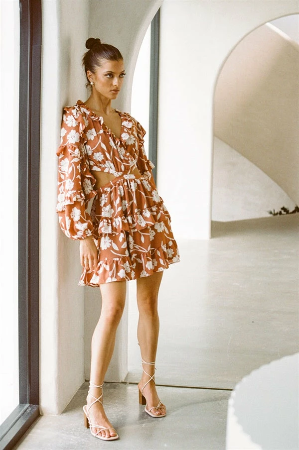 Ultra feminine vibes, perfect for a night out! The Kamaria Dress is made from a lightweight tan fabric with our exclusive Bloom Floral print. It features full length puff sleeves, plunging cross over neckline, cutout at waist, flouncy triple tiered skirt and ruffle and frill detailing throughout. Pair with the Zita Strappy Sandals and Bold Callie Earrings! Designed exclusively by Sabo.