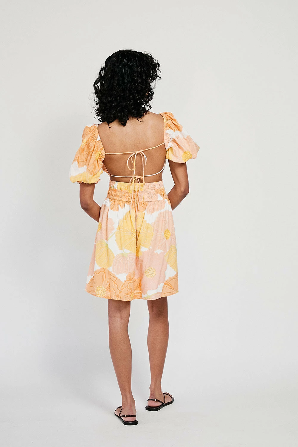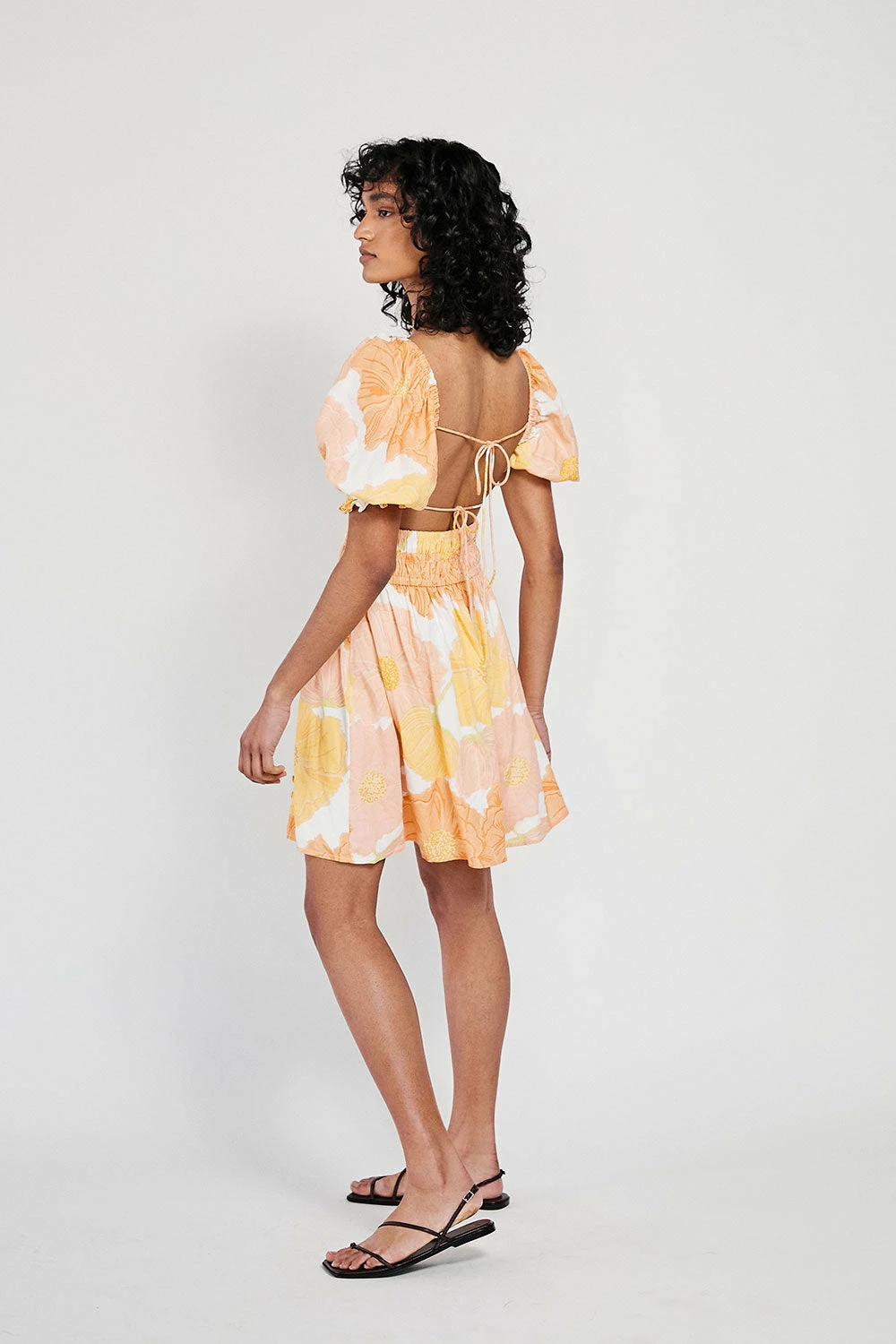 Inspired by vacation sunsets, the Kensington Backless Dress is made from a high quality viscose linen blend fabric with our exclusive poppy print. It features an open back with tie closures, short puff sleeves, covered button details at front, shirred panels at waist and a flouncy skirt. Dress it up with the Strappy Rafaela Heels! Designed exclusively by Sabo.