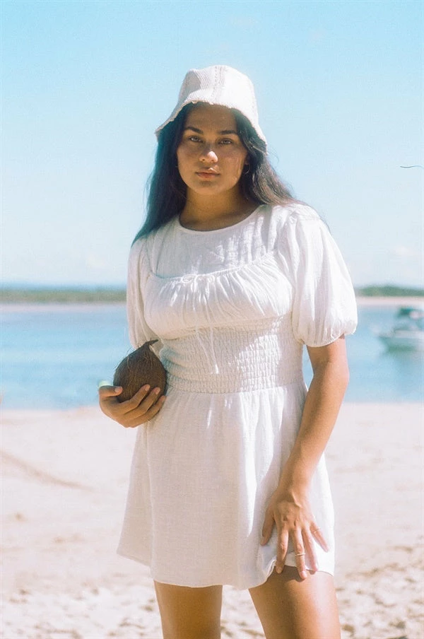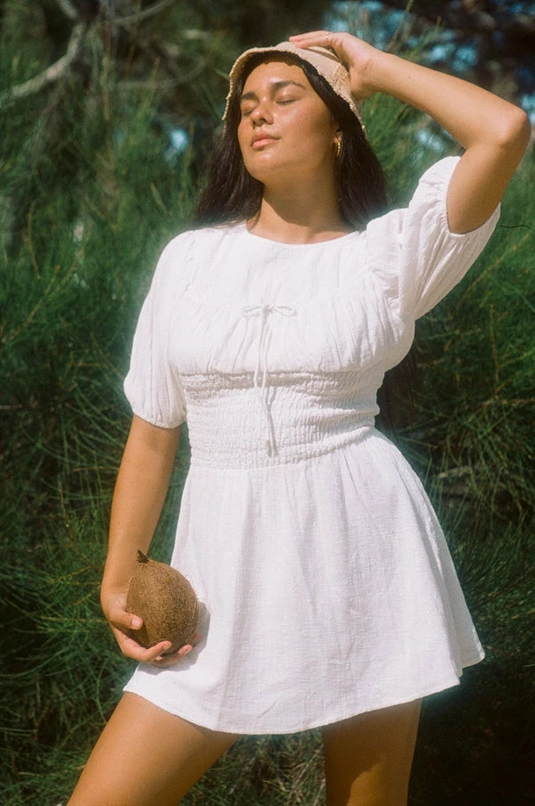 Let us do the layering for you! The Kiah Dress is made from a natural cotton fabric in an off white hue. It features short puff sleeves, high rounded neckline, elastic detailing across waist and a flouncy skirt. Keep it casual with sandals and the T Bar Pearl Necklace! Designed exclusively by Sabo.