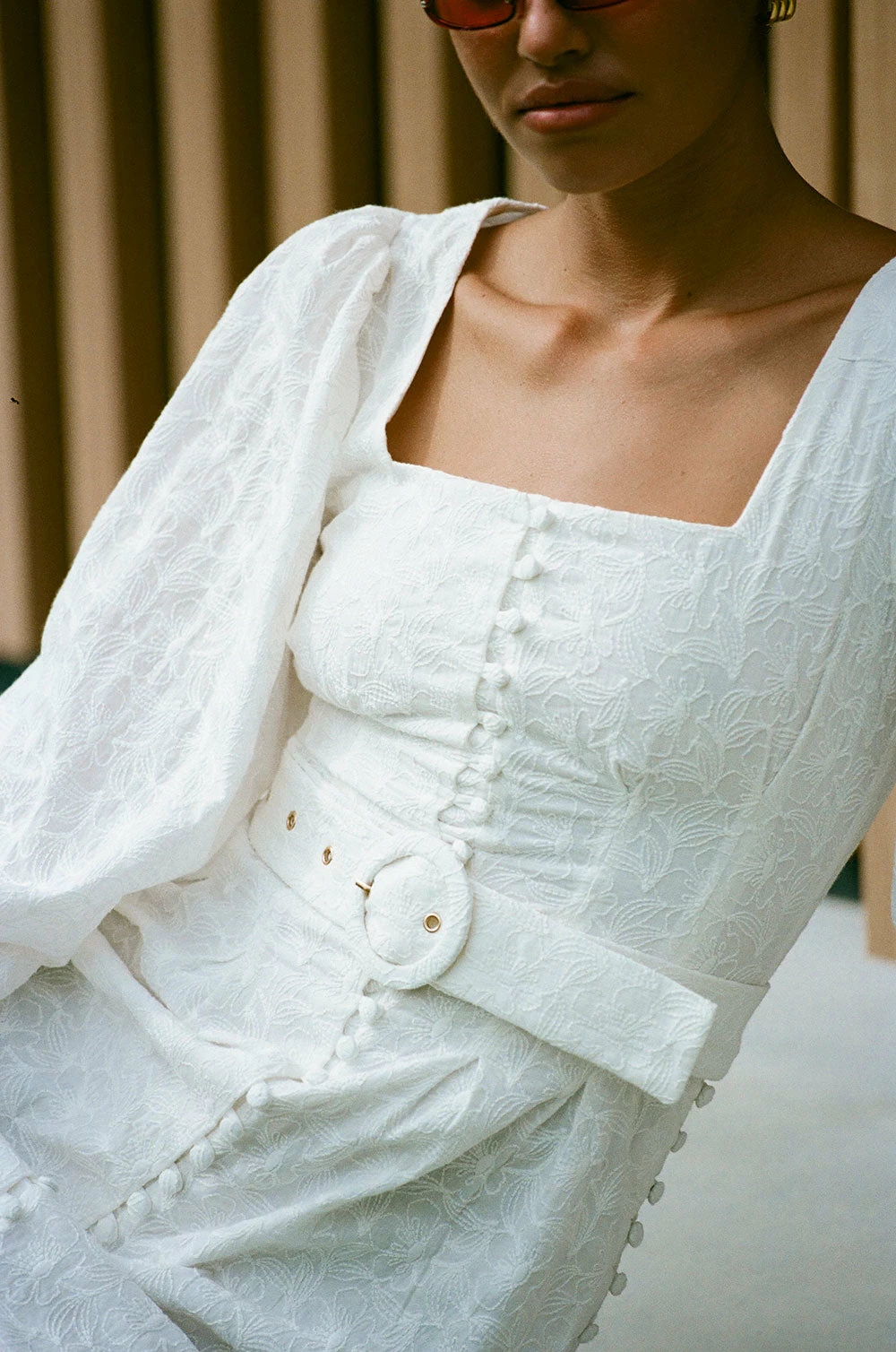 A classy style in the most stunning structured fabric! The Kita Dress is made from an embroidered voile fabric in white. It features a square neckline, long puff sleeves, covered button detailing down sides and centre front and a matching belt. Pair with the Strappy Lilly Heels and Celestial Hoop Earrings for your next event! Designed exclusively by Sabo.