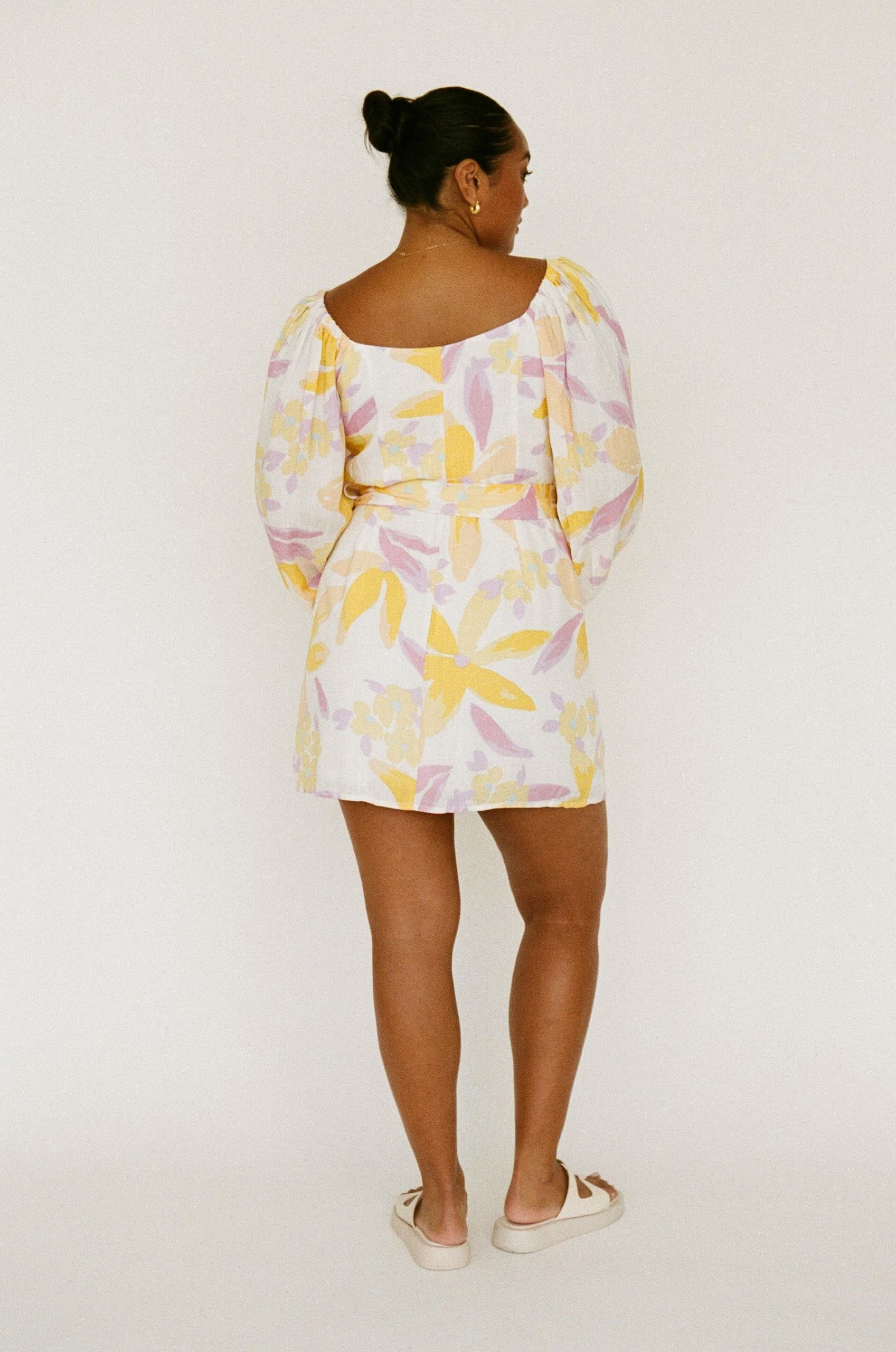 An easy-to-wear shape in our fresh new print! The Kona Wrap Dress is made from a high quality lightweight viscose fabric with our exclusive paradise floral print. It features full length puff sleeves, overlay wrap front which can be tied at the side of waist or back. Dress it up with the Strappy Rafaela Heels or keep it casual with slides! Designed exclusively by Sabo.