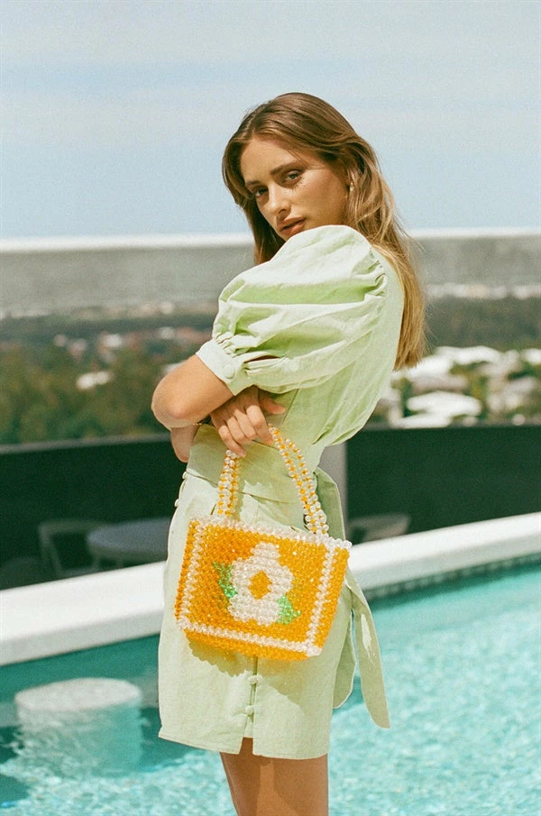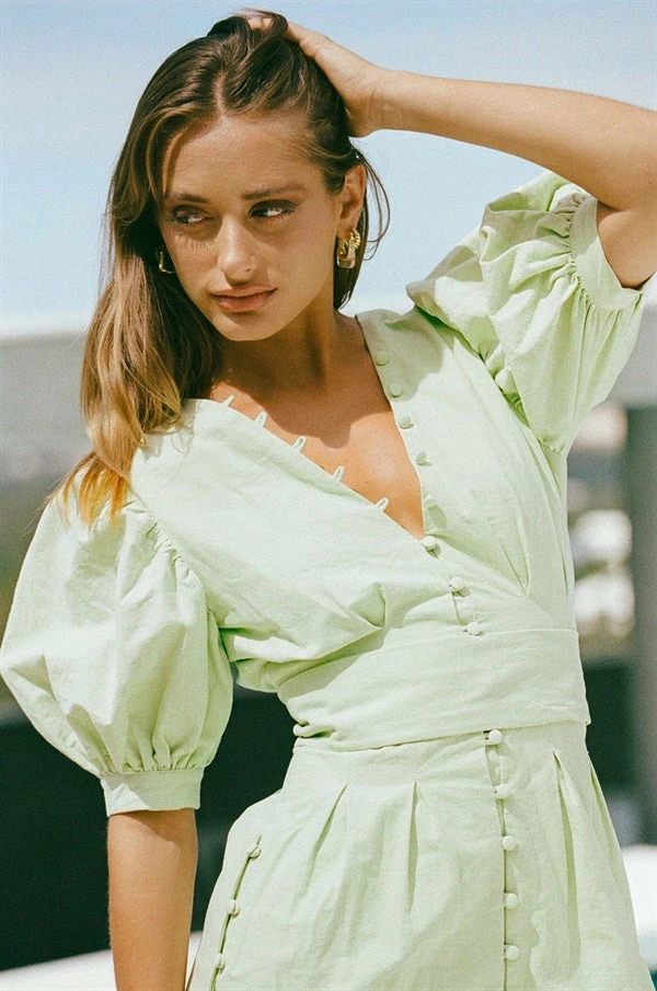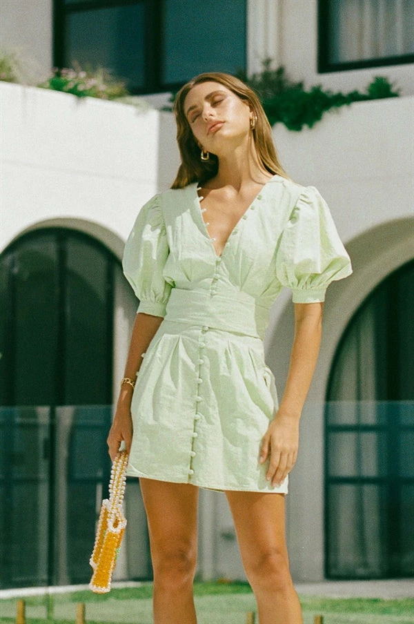 The cult favourite Kori Dress now in a fresh new colourway! It is made from a high quality natural cotton fabric in a green hue. It features a plunging V neckline with covered button detailing down centre front and sides of skirt, short puff sleeves and a matching waist tie. Get the look with the Transparent Mules and Apollo Necklace! Designed exclusively by Sabo.