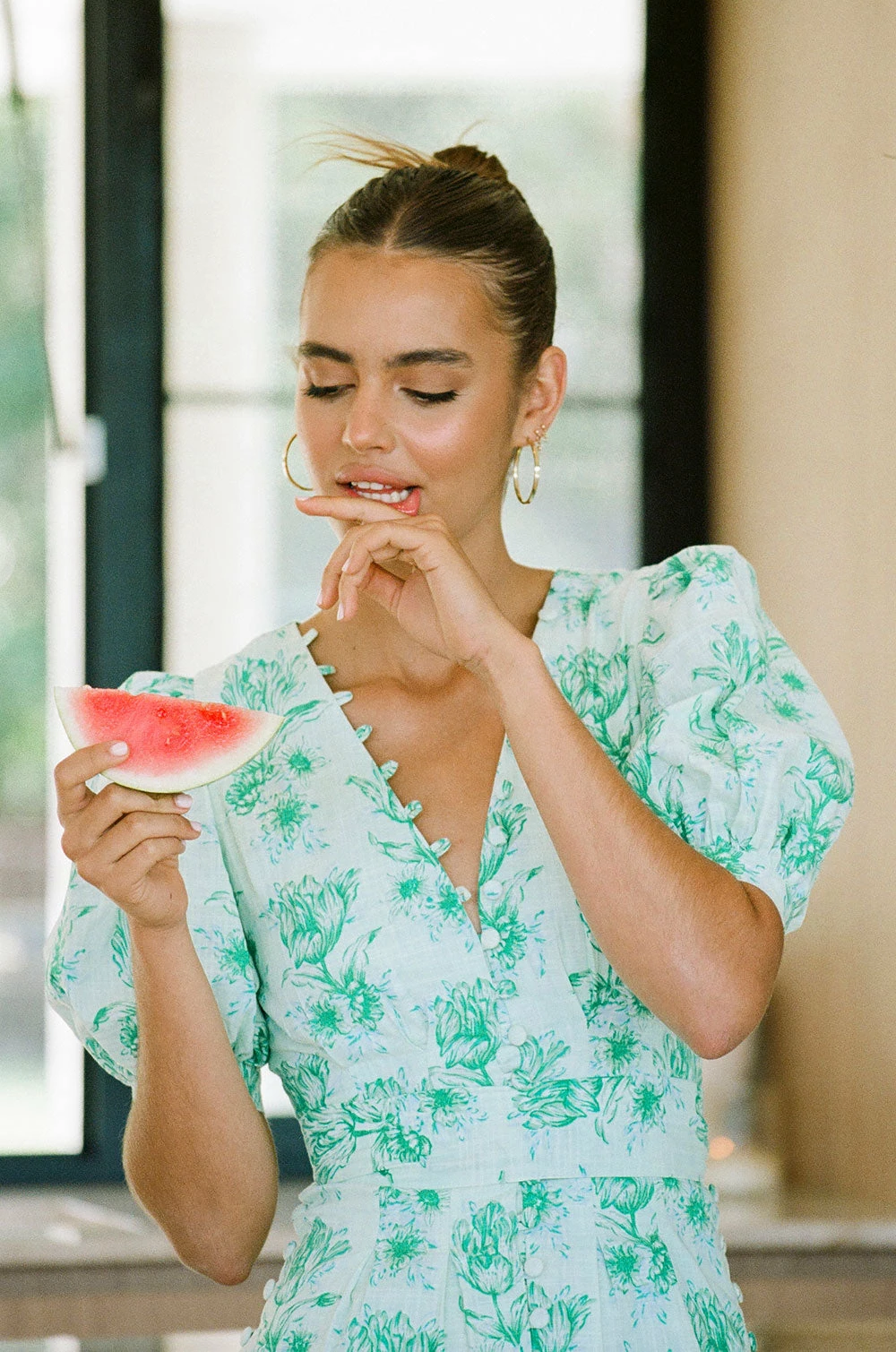 The cult favourite Kori Dress now in a stunning new print! It is made from a high quality natural cotton fabric with our exclusive tulip floral print. It features a plunging V neckline with covered button detailing down centre front and sides of skirt, short puff sleeves and a matching waist tie. Get the look with the Transparent Mules and Glow Necklace! Designed exclusively by Sabo.