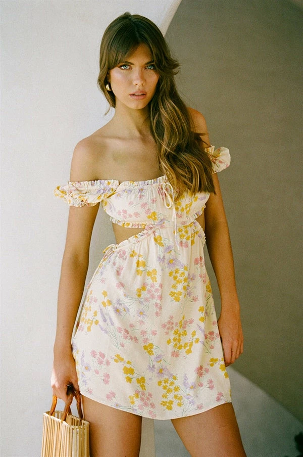 Straight from our That French Song collection, the Lashara Crepe Dress is made from a stunning zipper crepe fabric in a soft yellow hue. It features our exclusive hand painted spring floral print, cap sleeves, ruffle trim detailing, draw elastic neckline with tie at centre, cutouts and ties at waist and a flouncy skirt. Can be work on off shoulder! Designed exclusively by Sabo.