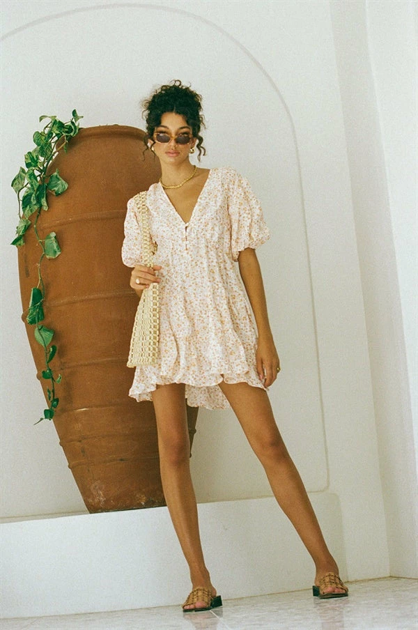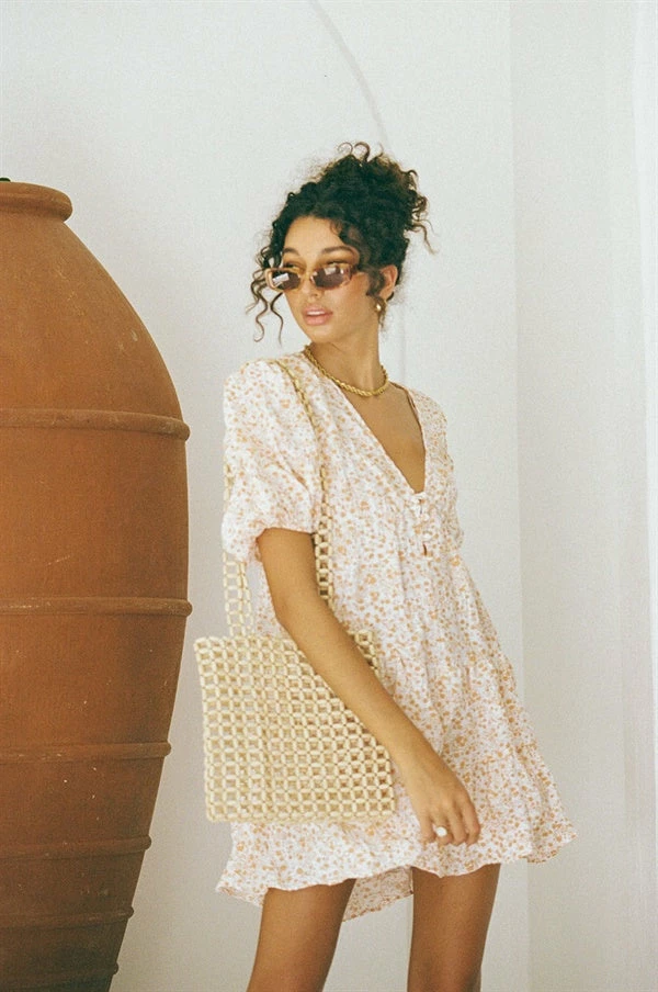 Throw it on over bikinis at the beach or dress it up with heels! The Leyah Dress is made from a textured crepe fabric with an orange floral print throughout. It is a relaxed style featuring a V neckline and covered buttons at waist, short puff sleeves and a flouncy tiered skirt. Complete the look white sneakers and Lima Saddle Bag! Designed exclusively by Sabo.
