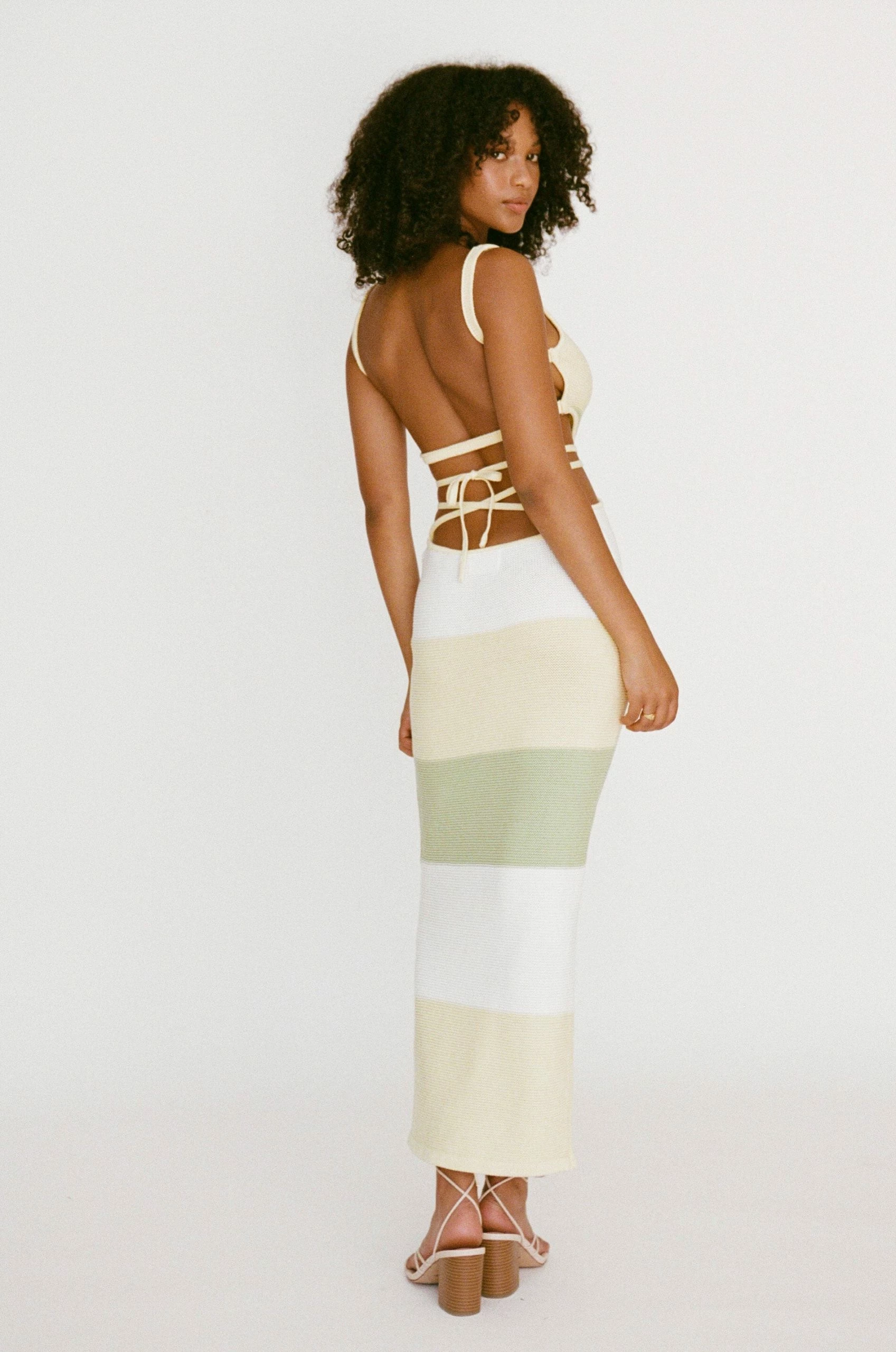 Wear it to dinner with the girls or on date night! The London Knit Dress is made from a natural knitted cotton fabric in green, yellow and white hues. It is a backless style featuring a scoop neckline, tie detail at waist and midi length. Pair with the Jamilla Bag and Strappy Rafaela Heels! Designed exclusively by Sabo.