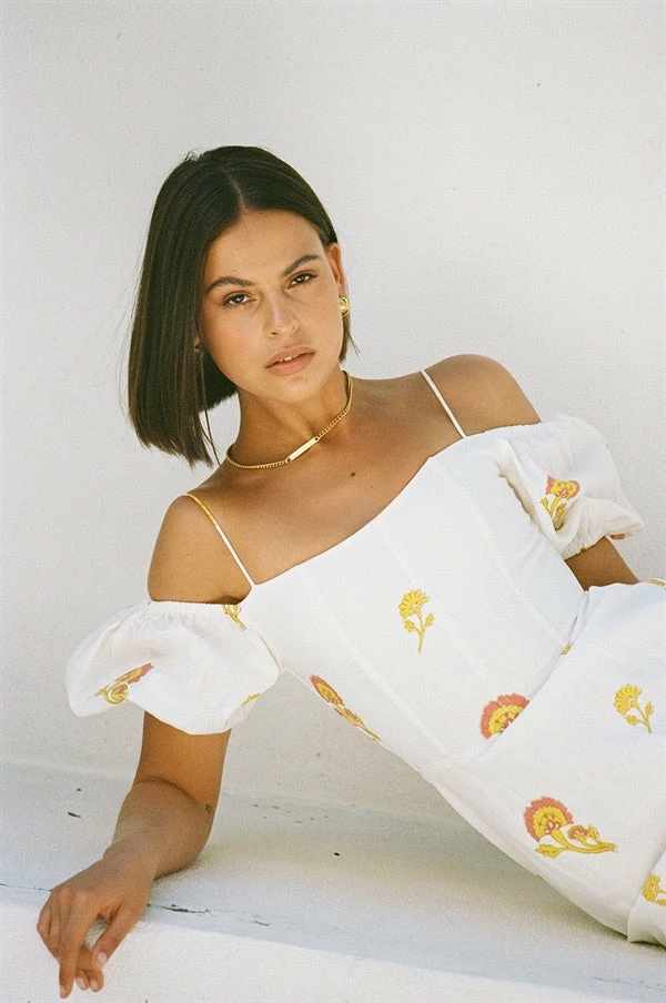 From our Nostalgic Summer collection, the Loretta Dress is perfect for your event! The Loretta Dress is made from a high quality natural linen cotton blend fabric with our exclusive sunset emblem floral print throughout. It features thin straps and off shoulder puff sleeves, straight neckline, a structured boned bodice and mini skirt. Style with the Net Bucket Bag and Livia Earrings! Exclusively designed by Sabo.