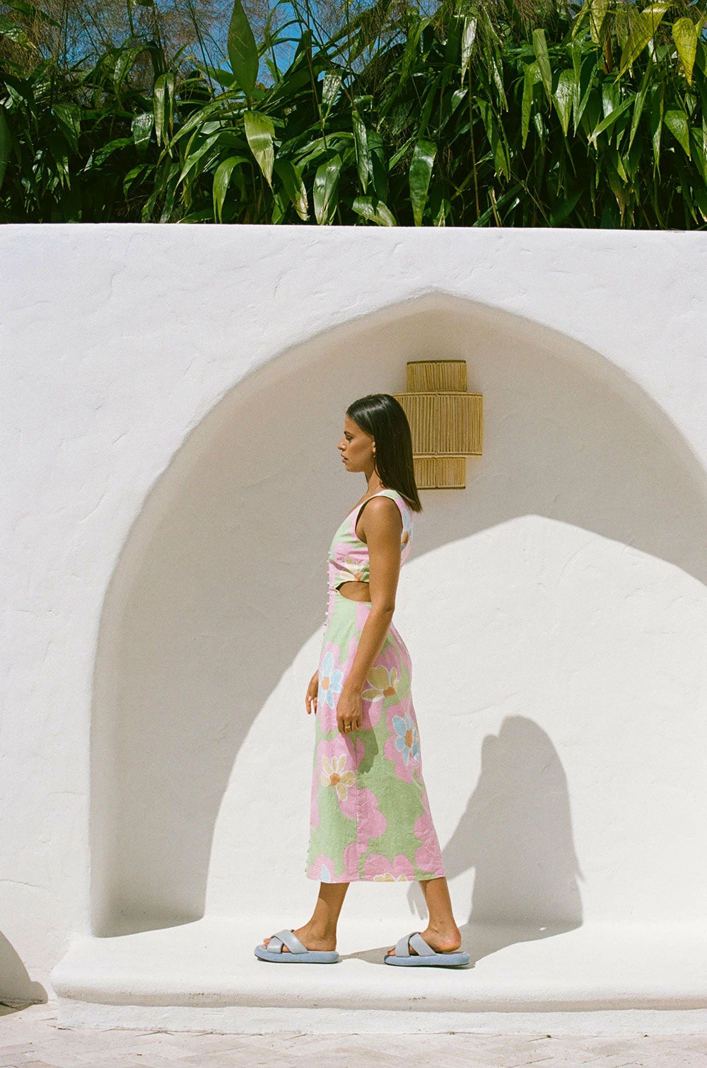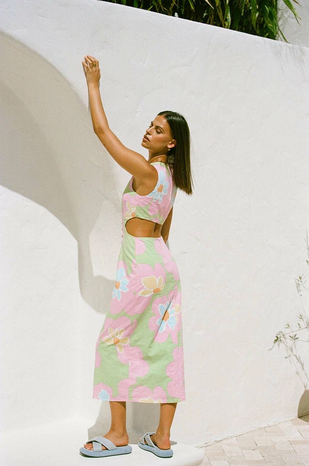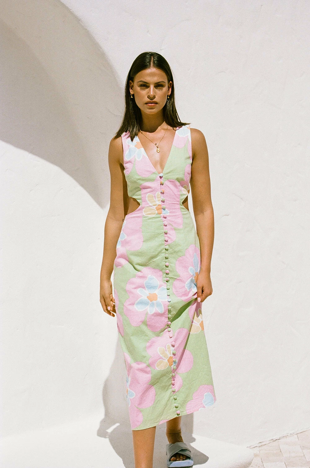 A pleasant new shape with our fresh exclusive Hana Green print! The Maiya Midi Dress is made from a high quality cotton slub fabric and features a plunging neckline, covered button details down centre front and cutouts at waist. Pair with sandals and the Jamilla Bag! Designed exclusively by Sabo.