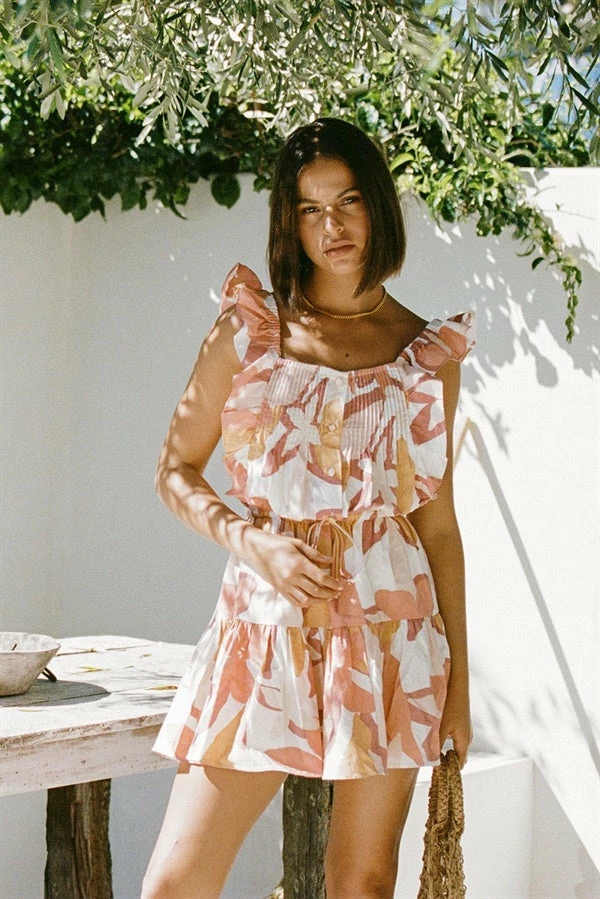 Structured perfection with the Mao Dress, made from a high quality linen cotton blend fabric with our exclusive blush floral print. It features ruffles on shoulders and bodice, pleated detailing at neckline, buttons down centre front, elastic and tie at waist and a flouncy double tiered skirt. Pair with the Strappy Kenny Heels and Reyna Earrings! Exclusively designed by Sabo.