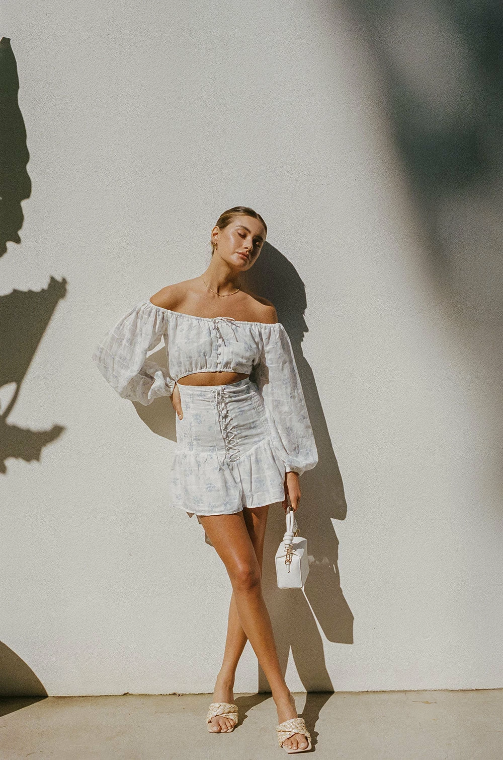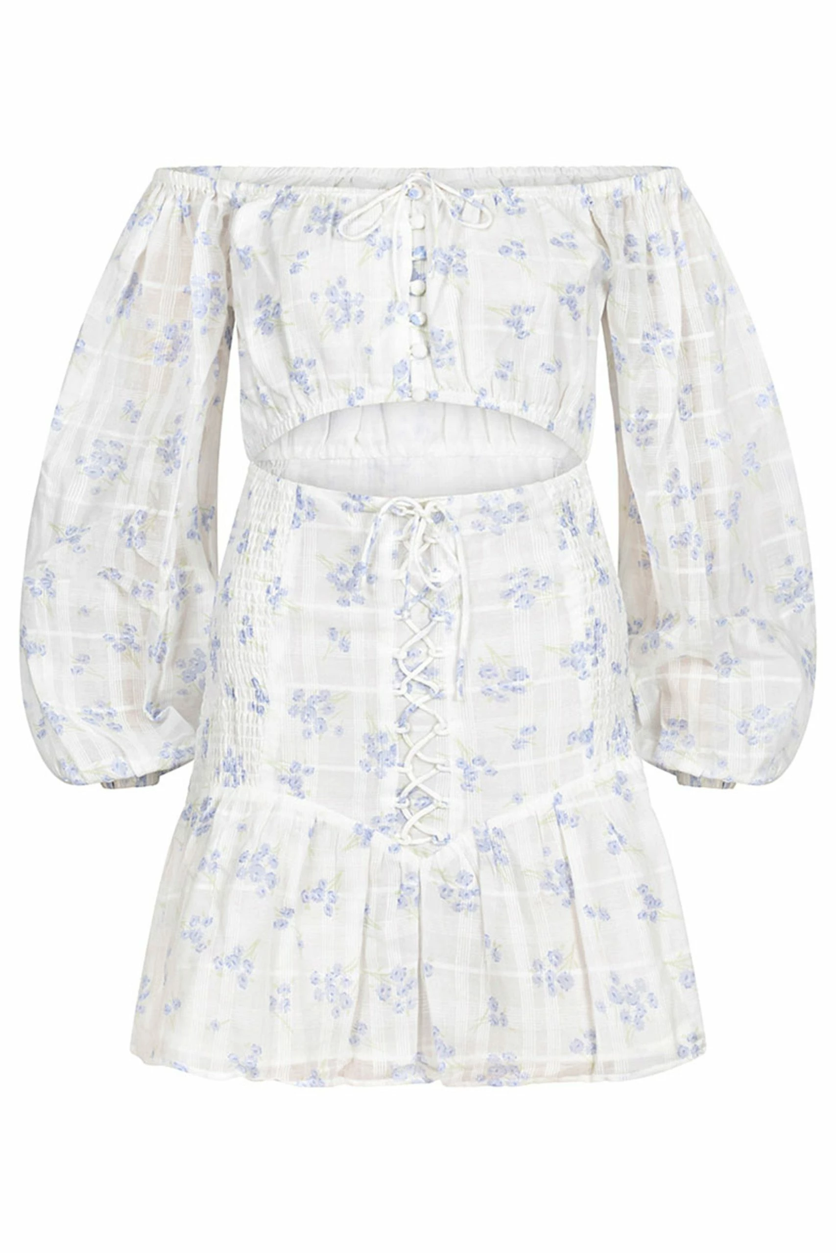 With strategically placed fitted panels and cutouts, the Mariella Dress is designed to flatter! It is made from a delicate natural white cotton fabric with our exclusive dainty floral print and self check detailing throughout. It is an off shoulder style featuring full length puff sleeves, covered buttons at centre front bodice, cutout at waist, shirred panels at sides of skirt, lace up at centre front and a flouncy panel across hem. Dress it up with the Strappy Rafaela Heels for your next event! Designed exclusively by Sabo.