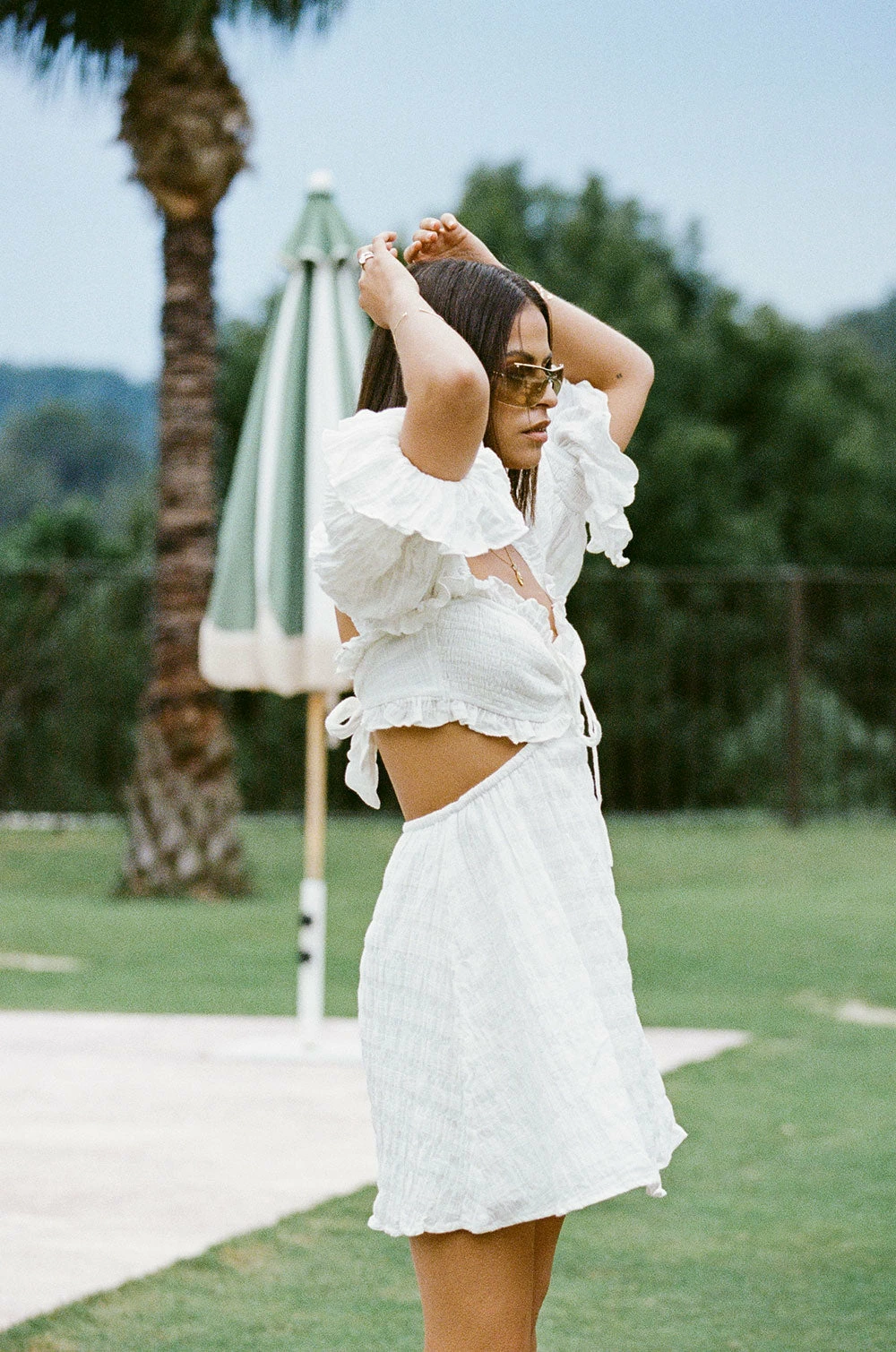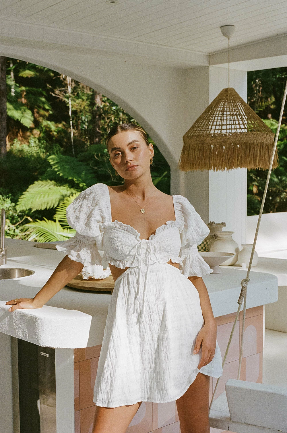 The perfect blend between fabric and design, the Marilla Dress is made from a natural textured cotton fabric in white. It features short puff sleeves, shirring and frill detailing at bust and sleeve cuffs, a draw tie at centre bust, cutouts at waist and a flouncy skirt. Dress it up with the Strappy Asteria Heels! Designed exclusively by Sabo.