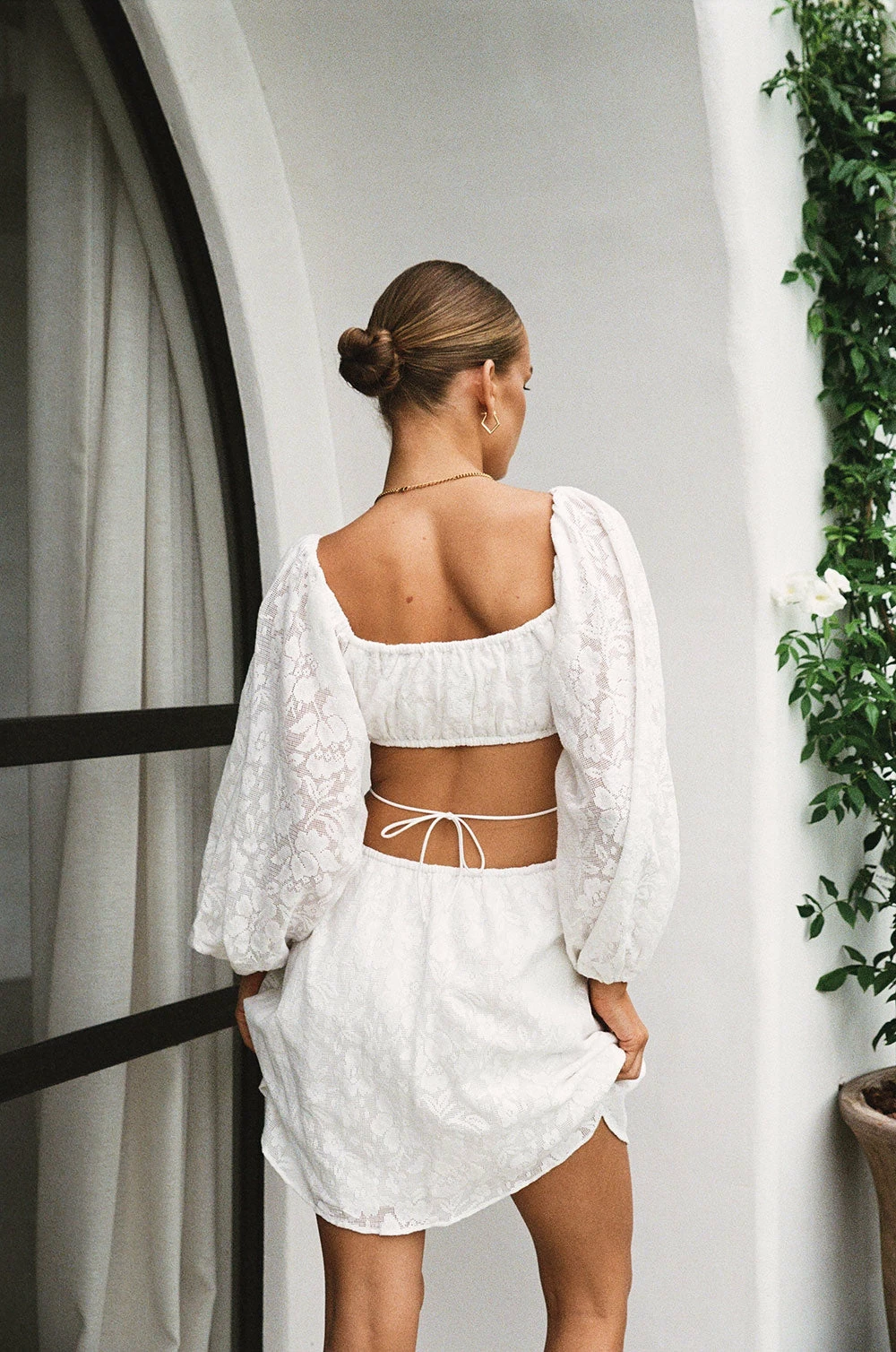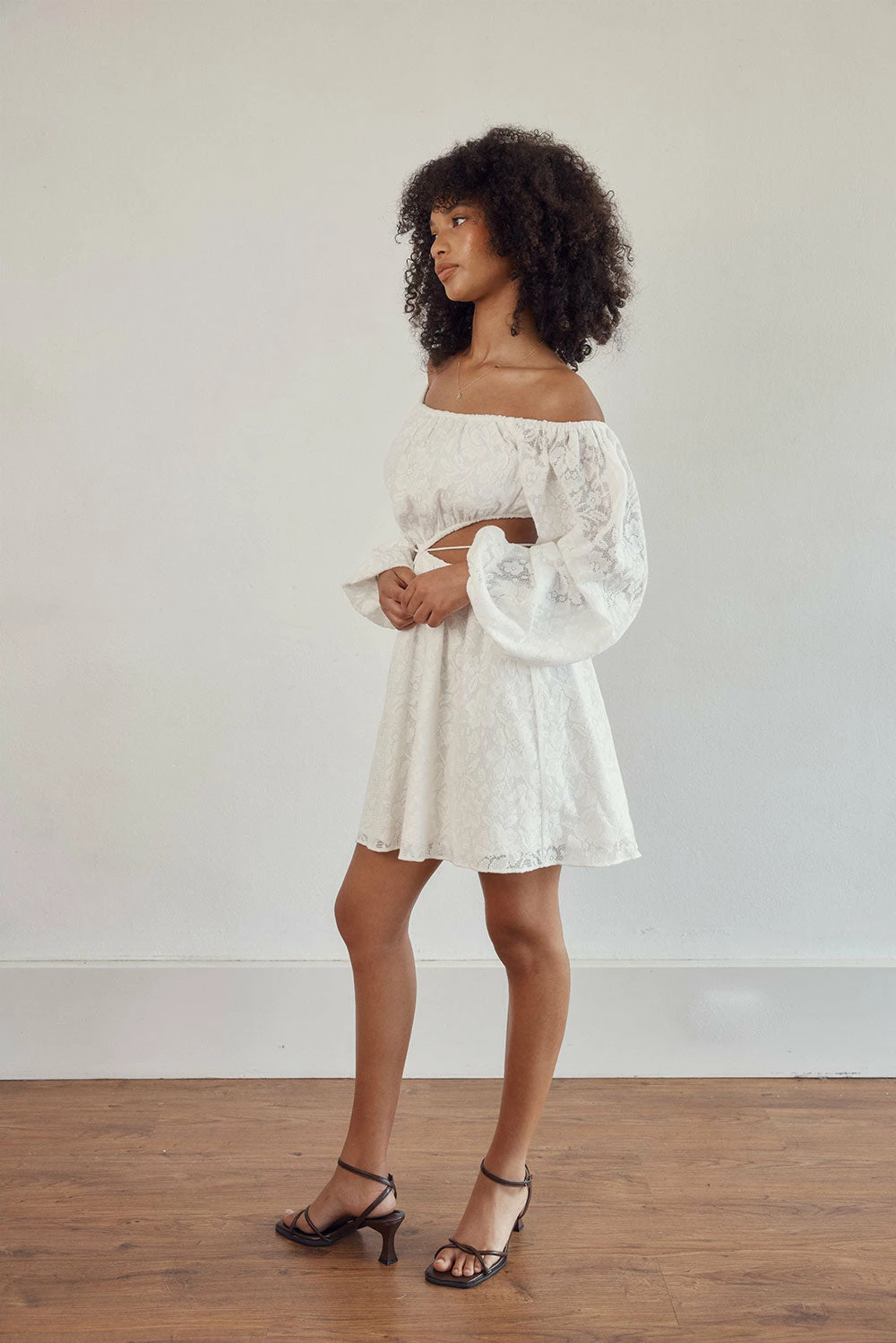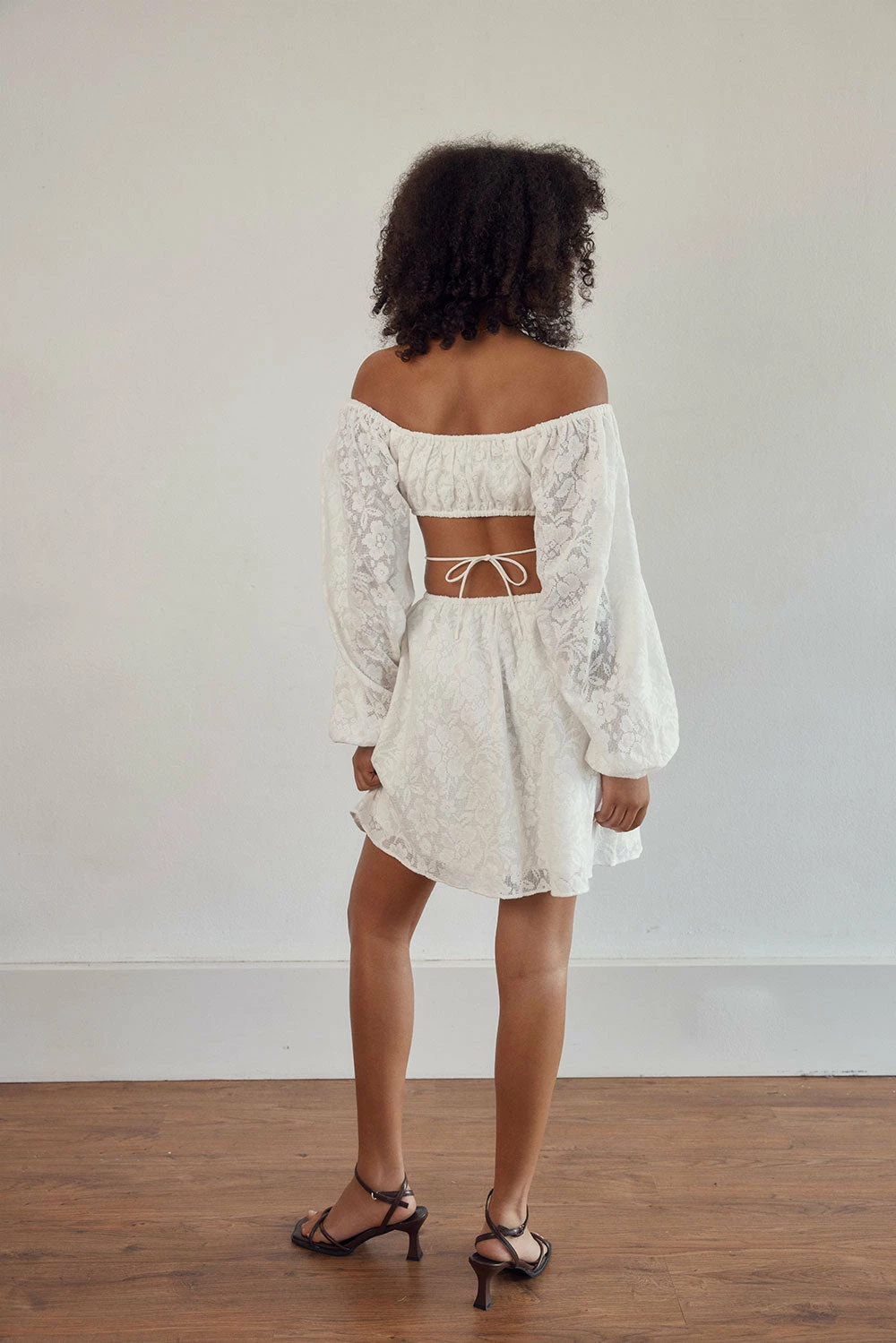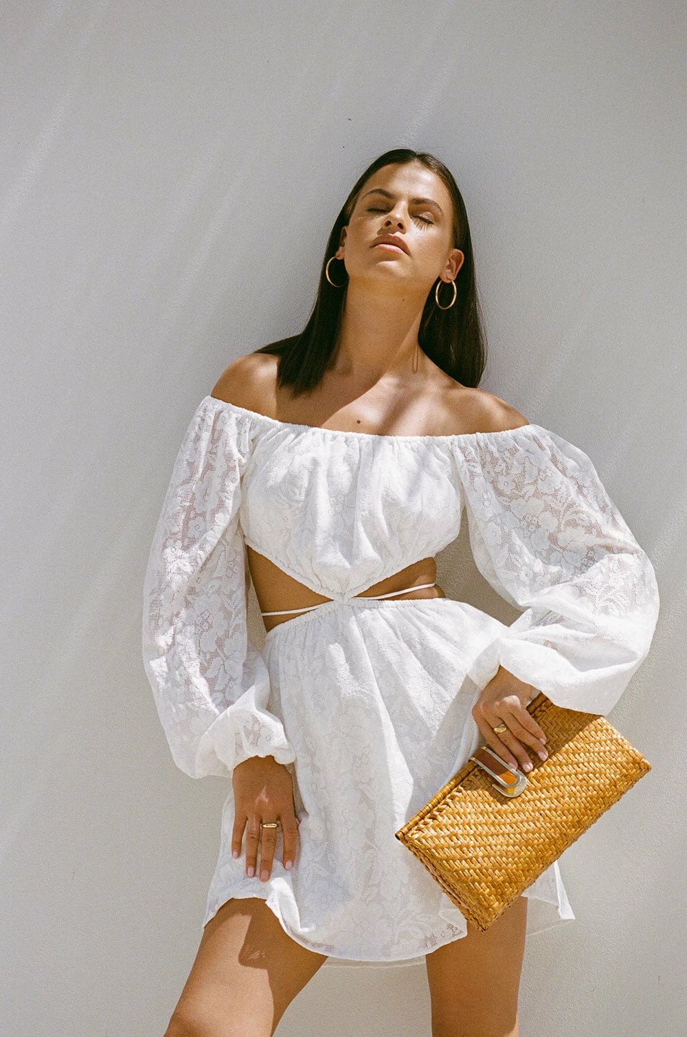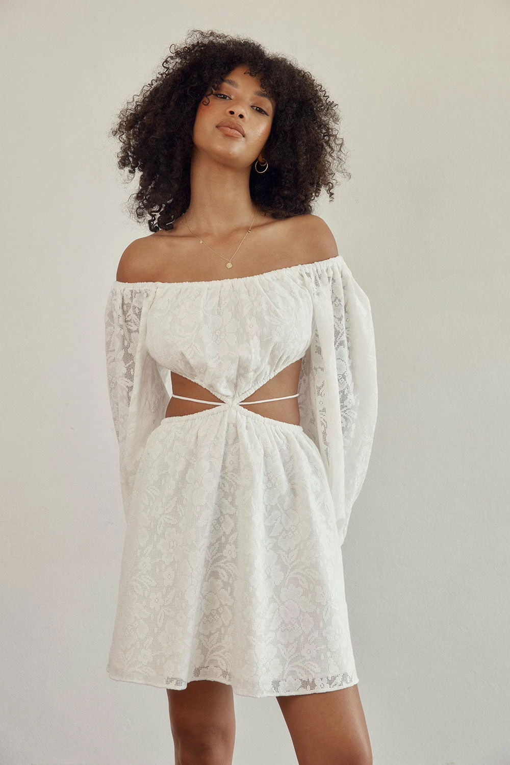 Perfect for a bridal shower, the Naiya Off Shoulder Dress is made from a natural cotton jacquard gauze fabric in white. It features long puff sleeves, cutouts at waist with tie detail and a flouncy skirt. Dress it up with heels and gold accessories! Designed exclusively by Sabo.