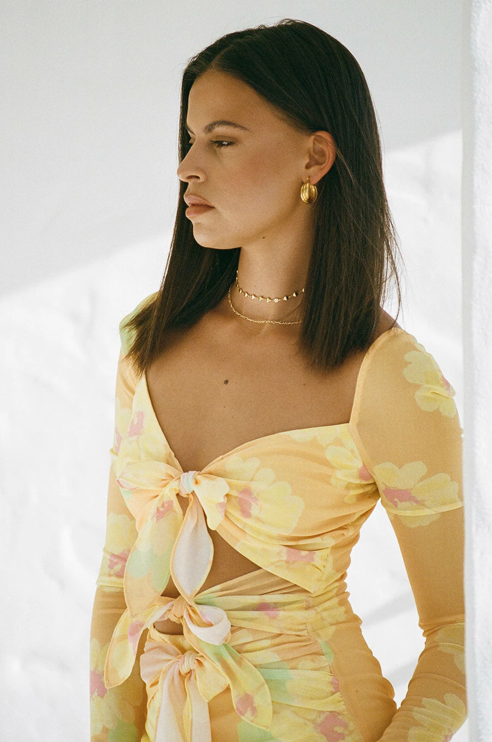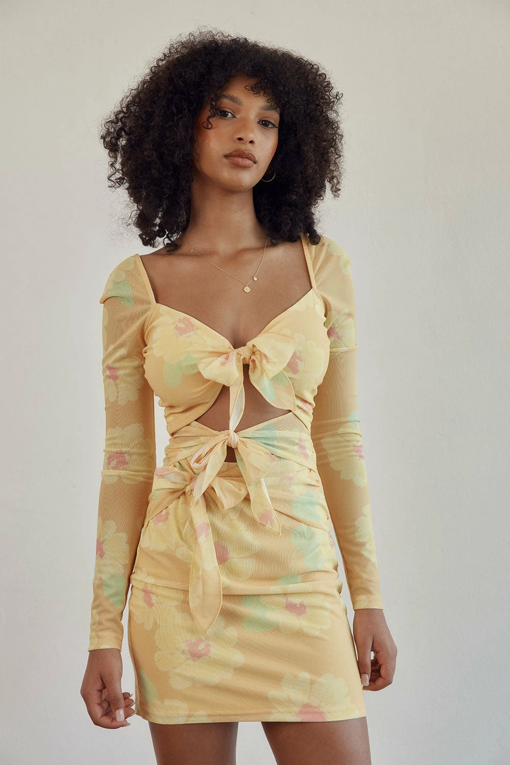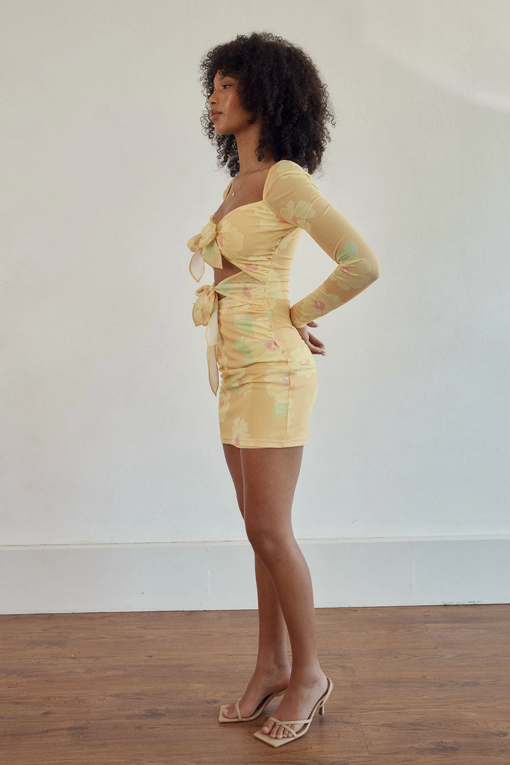 Introducing our brand new and exclusive bold orange painted flower print! The Noor Cutout Dress is made from a high quality stretchy mesh fabric and features full length sleeves, cutouts at waist and tie details. Dress it up with the Zita Strappy Sandals for your next event! Designed exclusively by Sabo.