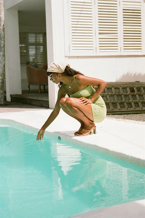 A chic shape designed to flatter your curves! The Olive Dress is made from a natural cotton blend ribbed fabric in a green hue. It is a fitted style featuring thin adjustable straps and straight neckline. Keep it casual and pair with the Strappy Sena Sandals or dress it up with the Strappy Eva Heels! Exclusively designed by Sabo.