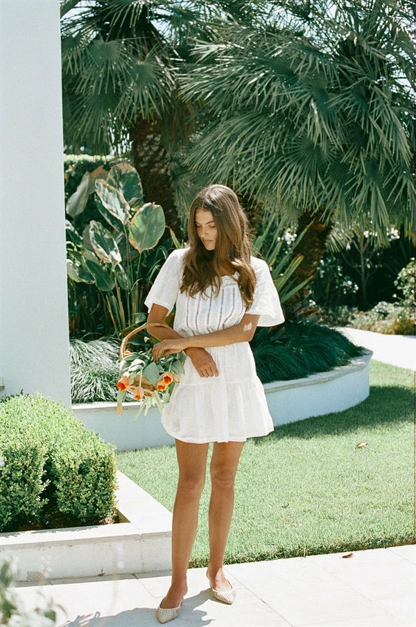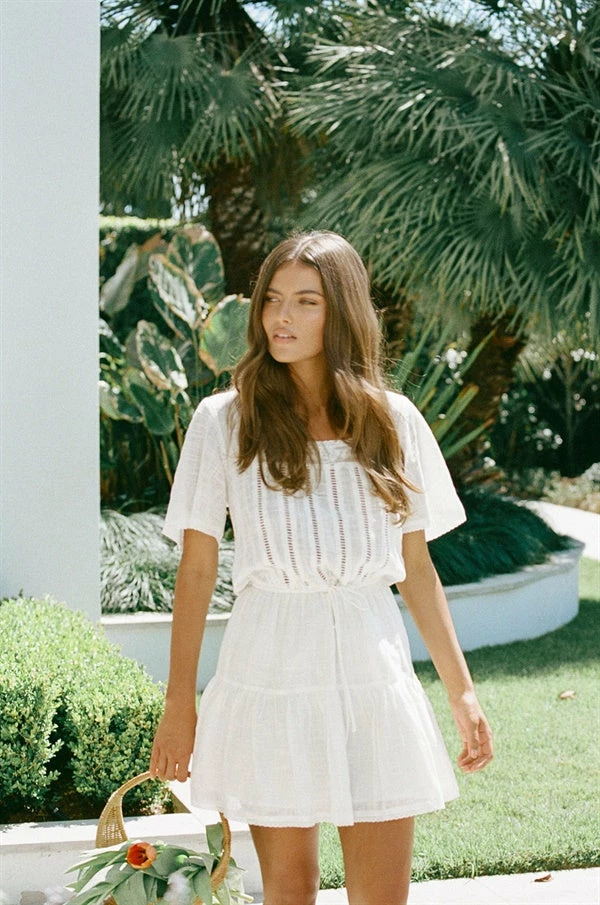 Dripping in details! The Orlando Dress is made from a natural raw cheesecloth cotton fabric in an off white hue. It features a square neckline, ladder and lace trim details, elasticated waist with drawstring and a flouncy double tiered skirt. Complete the look with the Capri Scarf and Kamila Sunglasses! Exclusively designed by Sabo.