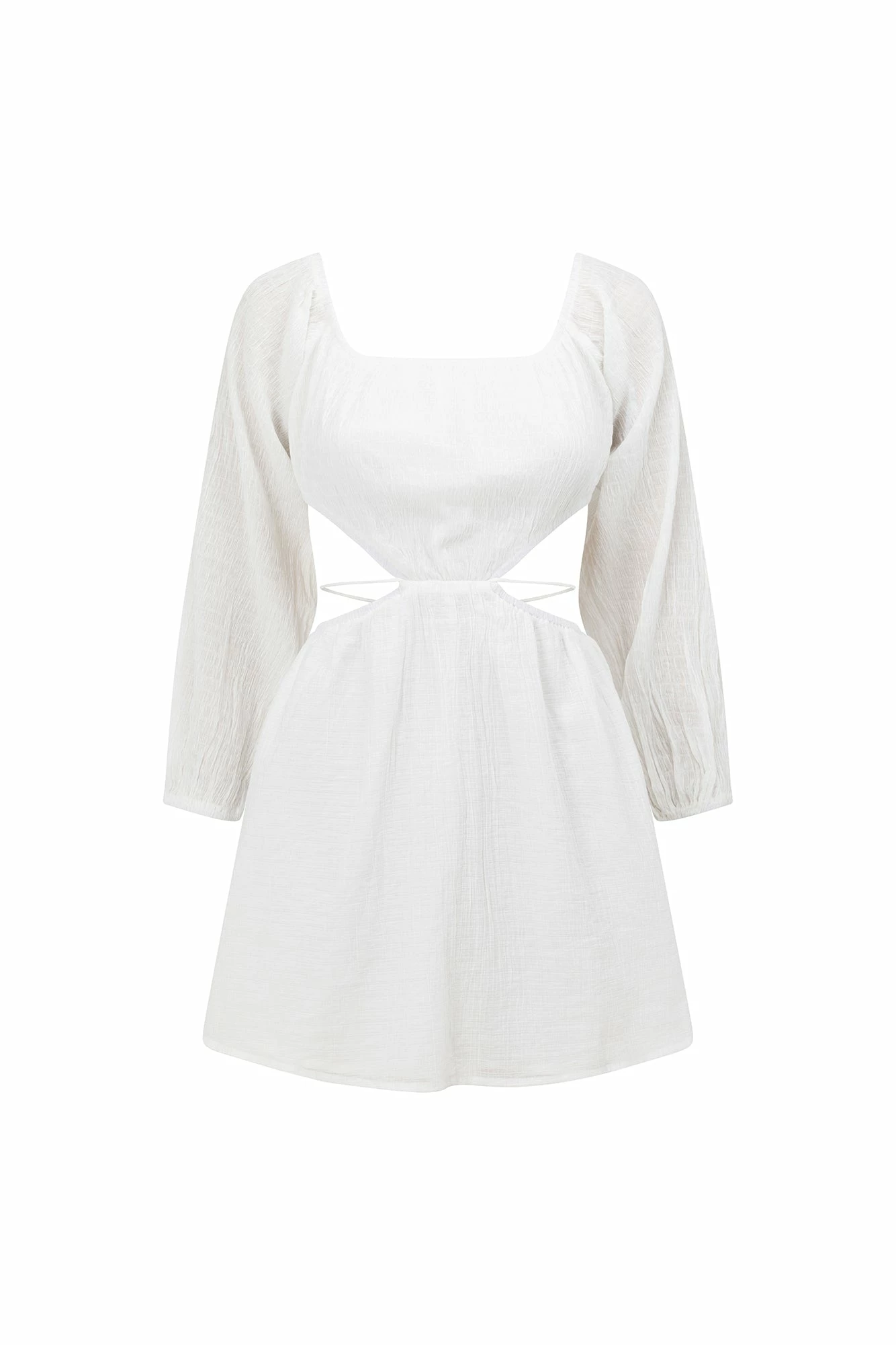 A LWD perfect to style your own way! The Piper Dress is made from a lightweight crepe fabric in white. It is an off shoulder style featuring full length puff sleeves, cutouts at waist with tie detail and a flouncy skirt. Pair with the Zita Strappy Sandals and Tiana Bag! Designed exclusively by Sabo.