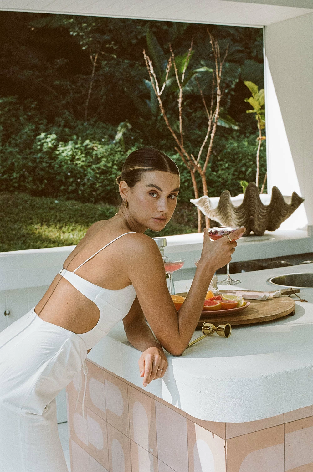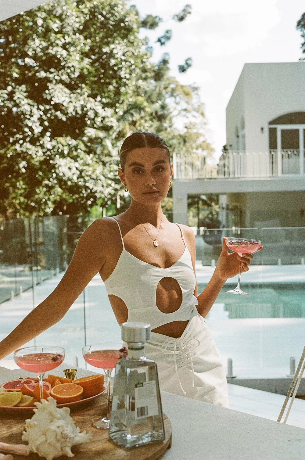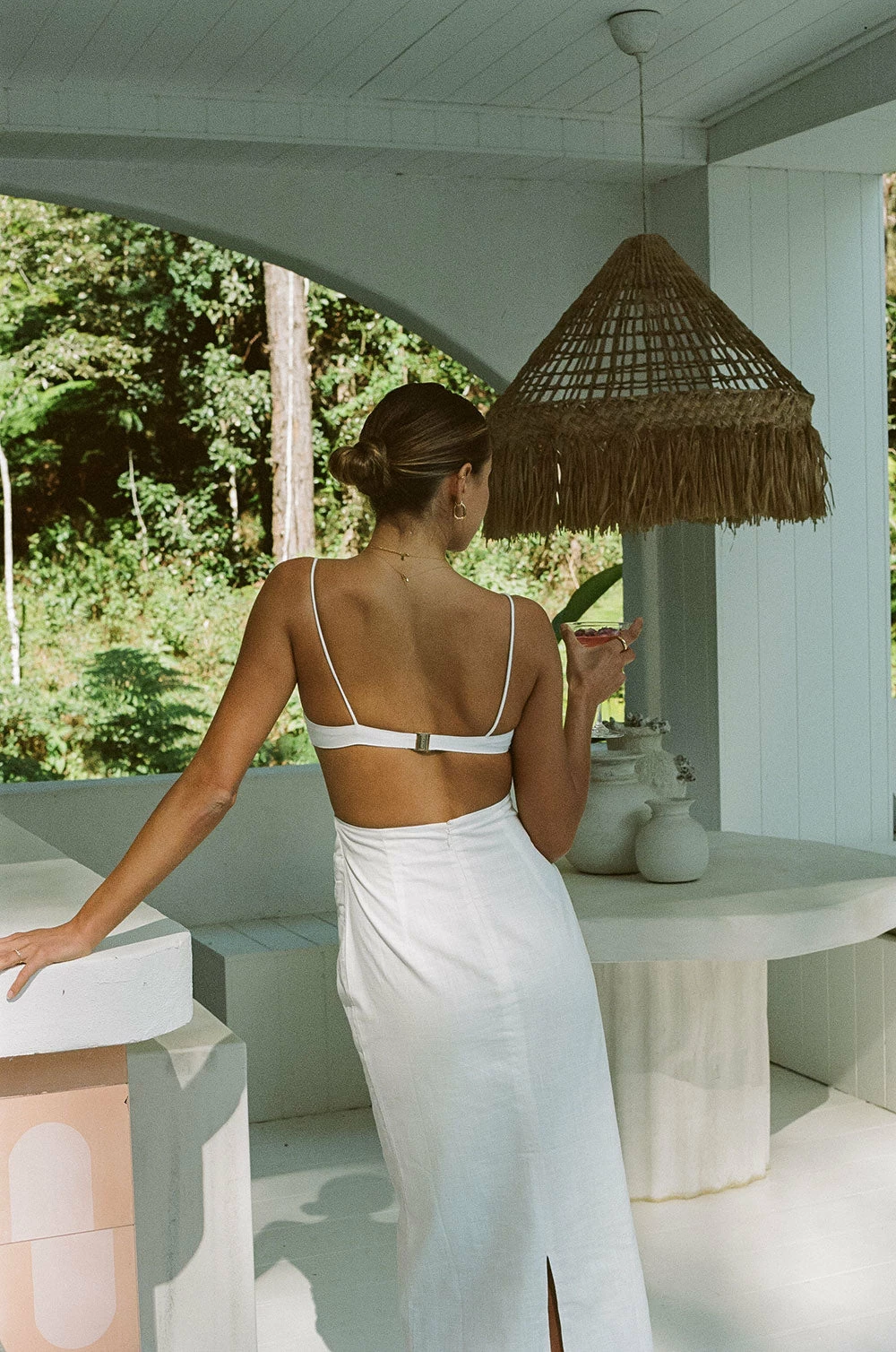 A super cute new design in one of our favourite fresh fabrics! The Prae Cutout Dress is made from a high quality natural cotton slub fabric in white. It features cutouts at waist, thin straps, gold toned clasp closure at back, draw detail at centre waist and split at centre back. Style your look with the Zita Strappy Sandals and Amal Pearl Hoops! Designed exclusively by Sabo.