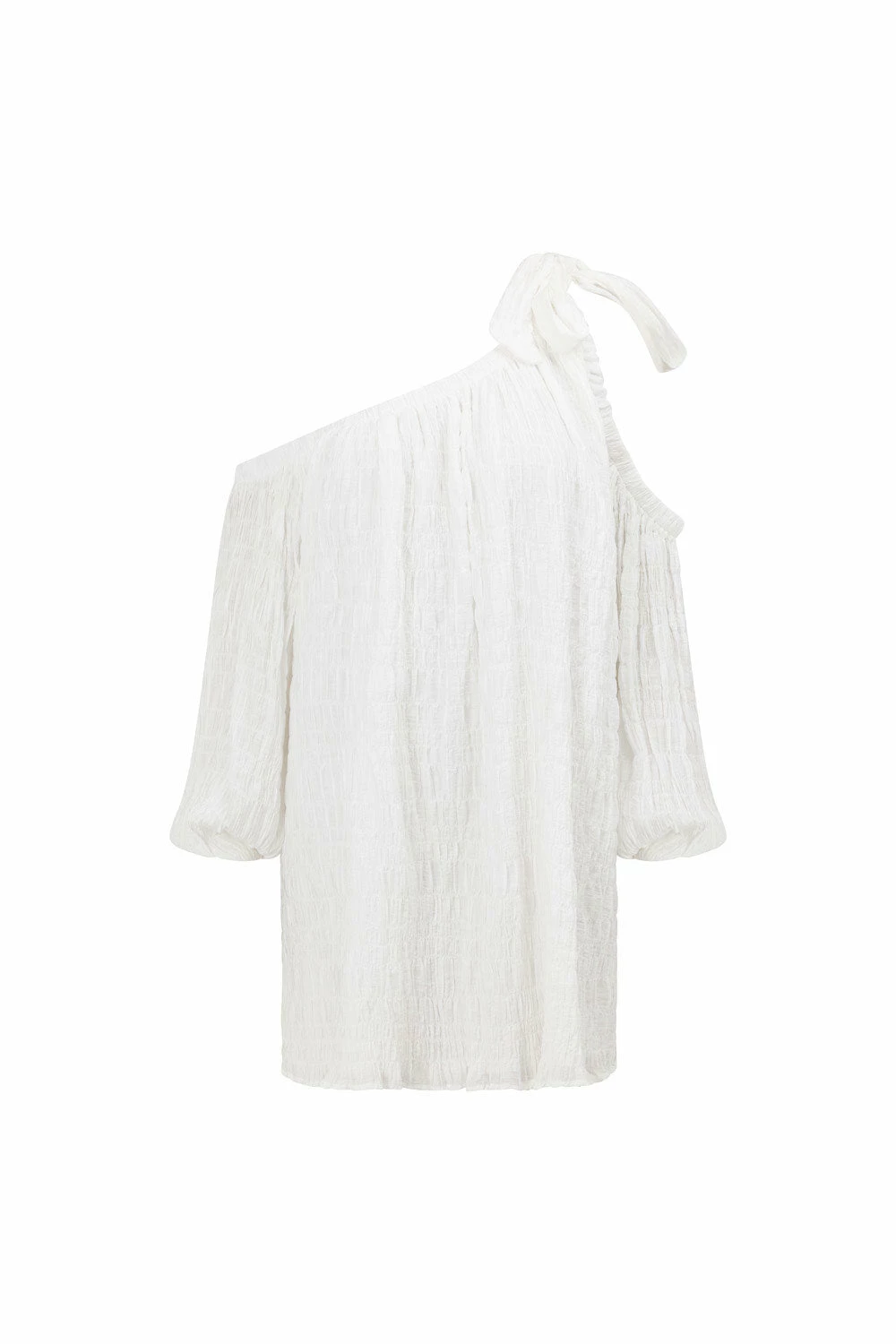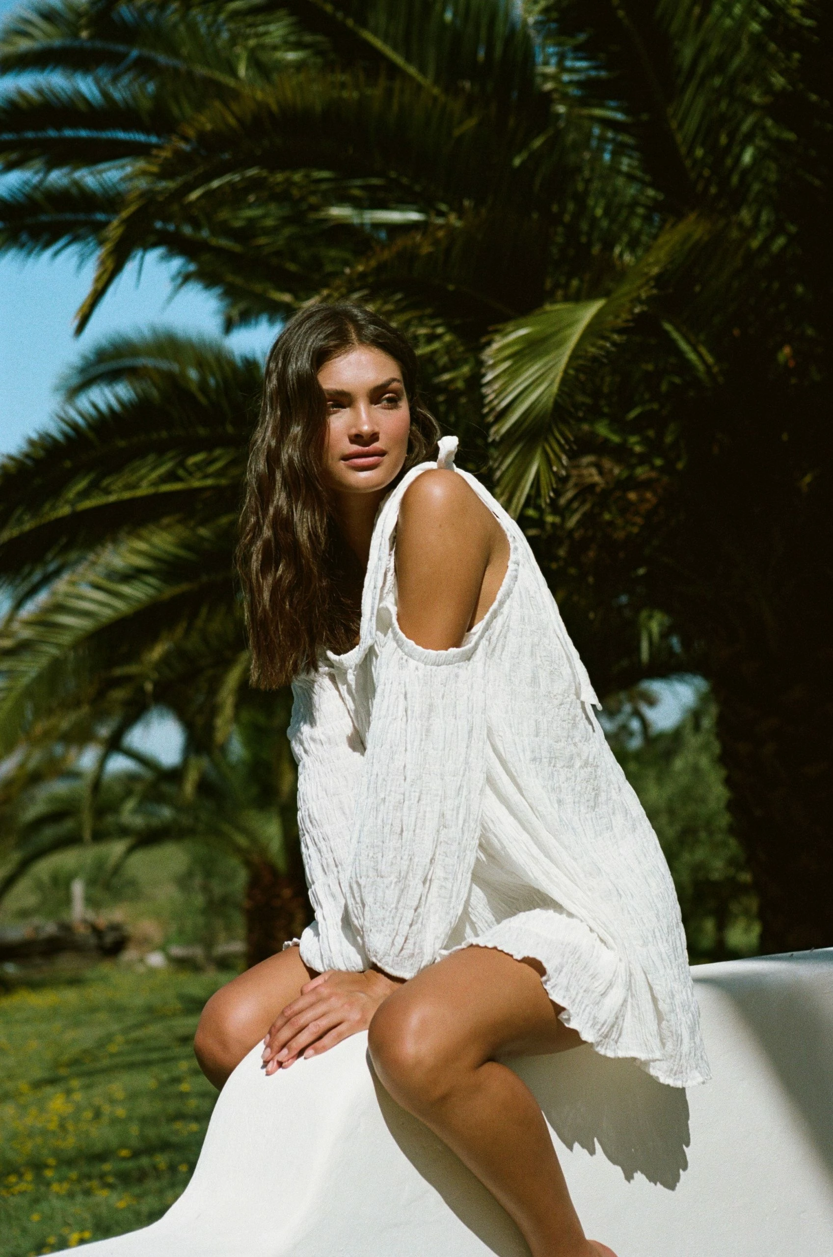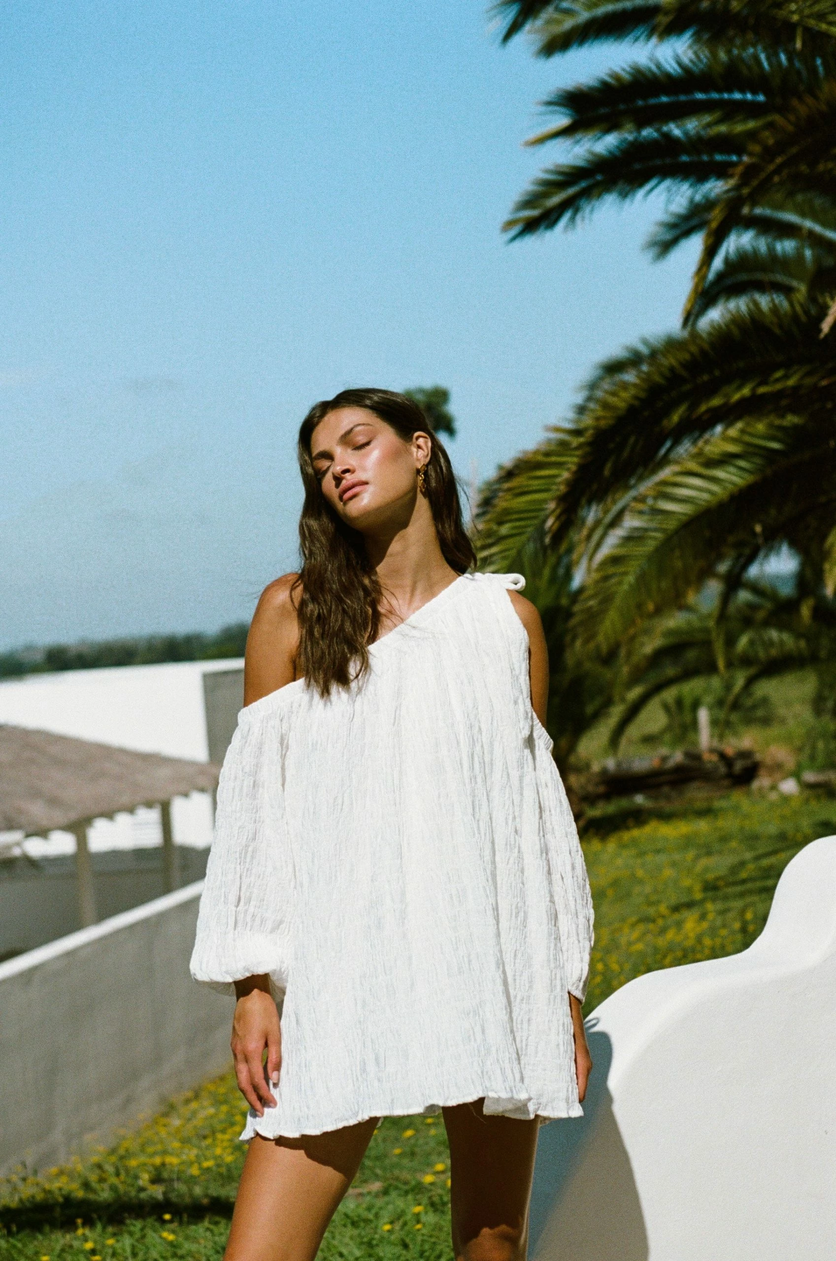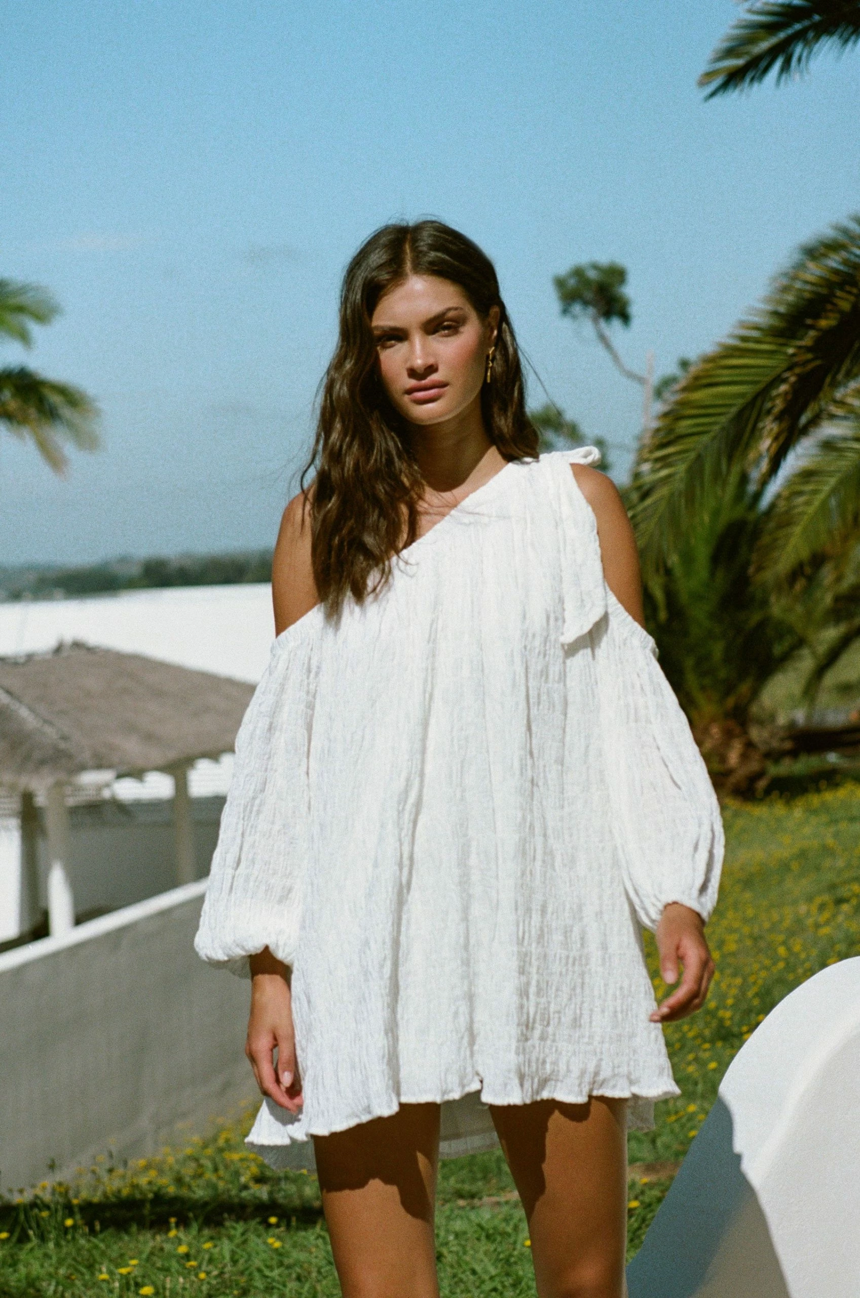 The vintage inspired Raisa Dress is made from a lightweight crepe fabric in white. It is a relaxed style featuring an asymmetric neckline with off and cold shoulder details and a flouncy fit. Dress it up with the Strappy Rafaela Heels and Jamilla Bag! Designed exclusively by Sabo.