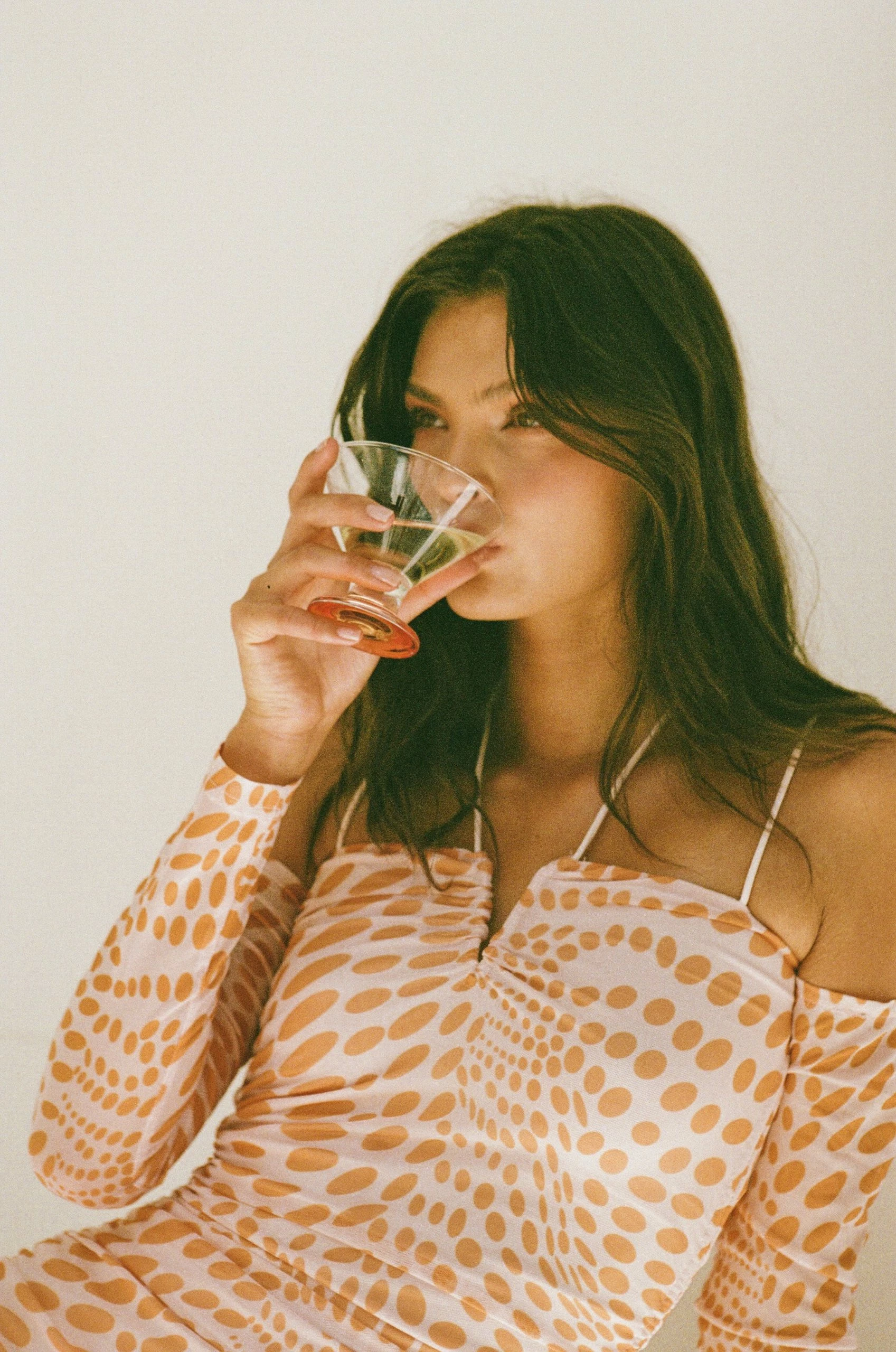 Show off your curves in the Raniella Dress, made from a stretchy slinky fabric with orange spots throughout. It features fitted off shoulder sleeves, thin straps with halter neck tie, dip V detail at centre bust, gathered draw details and splits at sides. Can be adjusted to be worn as a mini or midi! Designed exclusively by Sabo.