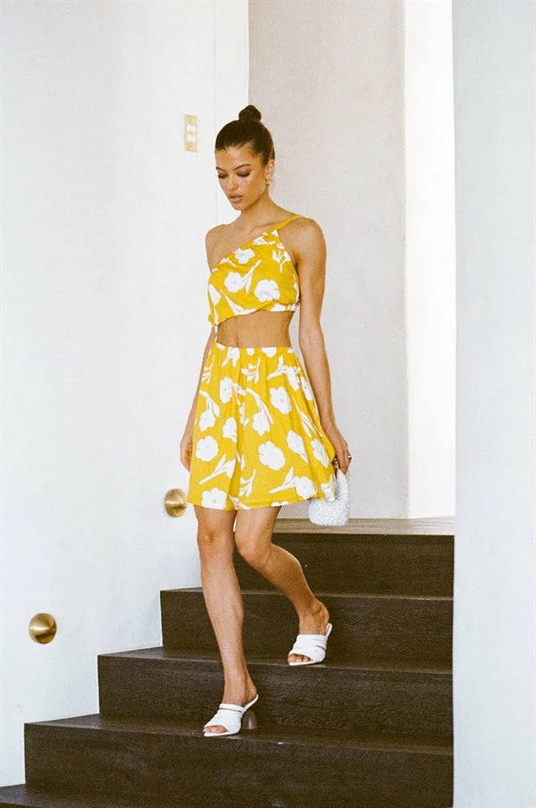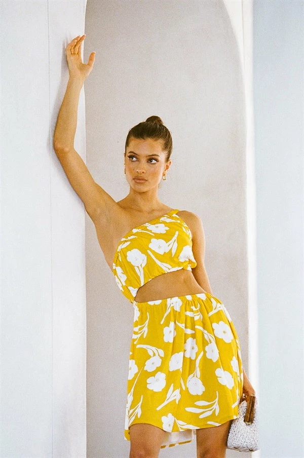 The piece that screams vacation! The Rome Dress is made from a heavenly viscose voile fabric in a yellow hue with our exclusive Yellow Paraiso print. It features an asymmetric cutout at waist, asymmetric neckline with elastic strap and flouncy skirt. Pair with the Coco Chain Bag and Strappy Rafaela Heels! Designed exclusively by Sabo.